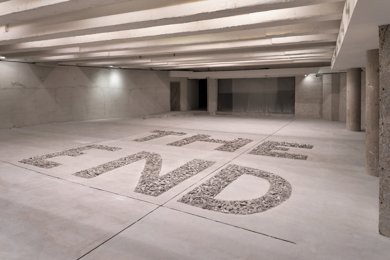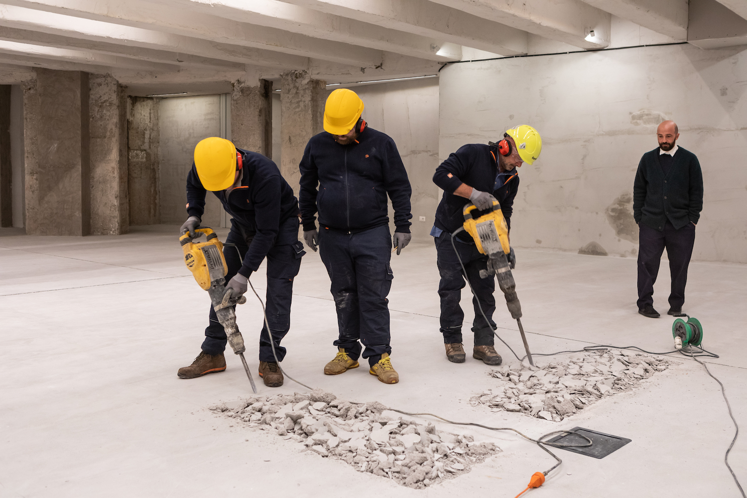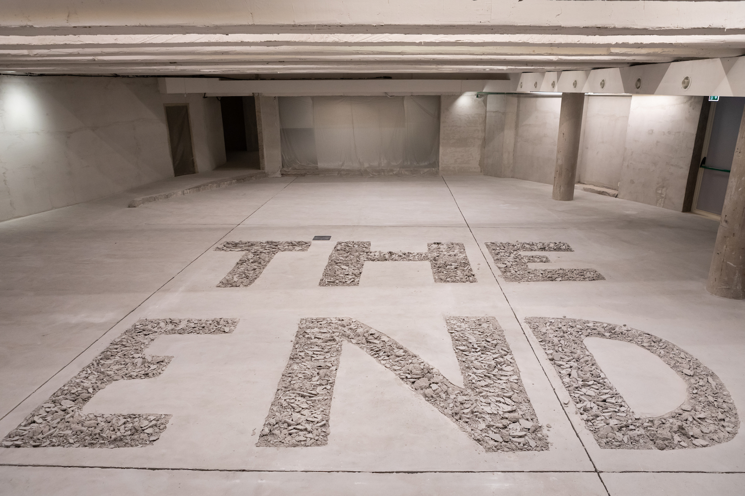 Nell’ovale centrale dello spazio, fulcro dell’impianto architettonico dell’intero edificio, gli spettatori hanno assistito, lo scorso 18 gennaio 2020, a un’azione inizialmente lenta e rumorosa che per quattro ore ha accompagnato la loro entrata e il loro passeggiare colmi di aspettative. Un gruppo di operai si è alternato nell’uso del martello pneumatico nel perforare a terra a lettere capitali la scritta “THE END”. Nonostante l’intenso rumore, l’azione ha catalizzato la curiosità e l’emotività del pubblico divenuto attivo nell’atto stesso della lettura della scritta, associandola inevitabilmente a personali o collettive fini. La perforazione, inoltre, solitamente sinonimo di distruzione, è stata in questo caso volta alla costruzione di una parola, di un significato e di un’opera d’arte.