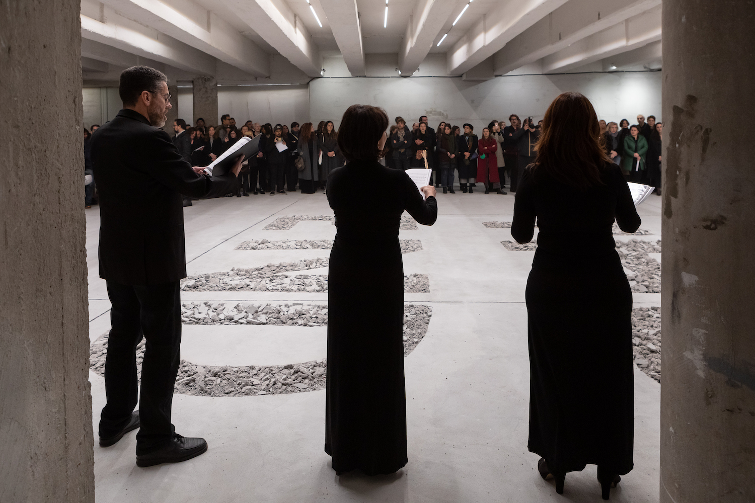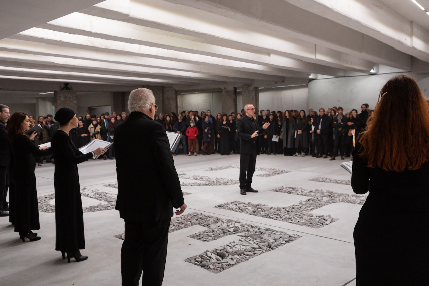 Consapevoli dell’elemento musicale presente nelle precedenti performance della trilogia di Golia, l’attesa è cresciuta sino a raggiungere un picco con l’apparizione di due trombettisti all’ingresso, che annunciano l’evento catartico finale in cui un coro è apparso e si è raccolto attorno alla scritta. Inevitabilmente disposti anche noi intorno al coro a formare un cerchio, ne abbiamo seguito la direzione e l’esecuzione di Sleep, opera del compositore statunitense Eric Whitacre con testo del poeta Charles Anthony. Impossibile trattenere la commozione di fronte a qualcosa che ha tutto il sapore e la consistenza di un atto finale. Una breve sospensione temporale in cui il coro ha accompagnato in un personale e liberatorio viaggio di resa, per salutare con dignità la fine e l’inizio.