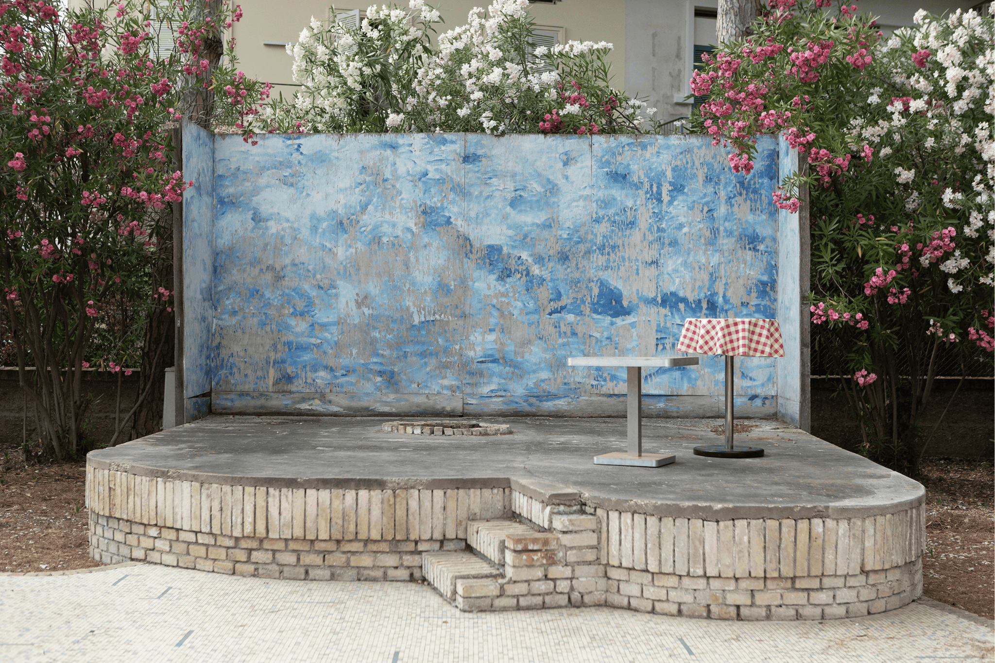La scena che si apre agli occhi dello spettatore è quella di un luogo dove è accaduto qualcosa, dove ci sono segnali da ‘giorno dopo’: due tavolini da bar spaiati collocati su un palco che, in passato, ha ospitato concerti di cantanti come Mina, due tavoli da birreria, con sedie bianche di plastica monoblocco, nel mezzo della pista da ballo con sopra delle tovagliette che pubblicizzano un evento passato ma che sembra essere in corso. Salendo la scalinata che porta all’ingresso rialzato della villa, si intravede, dalla persiana di una finestra, una mano che distribuisce ciotole di zuppa di cipolla, che saranno consumate sui tavoli della pista da ballo. Superato il portone d’accesso, la scena di abbandono non cambia: l’interno della villa è lo stesso di altri spazi simili, che hanno vissuto glorie nel passato ma per i quali non c’è stata la forza di mantenere un presente. All’ingresso un disegno