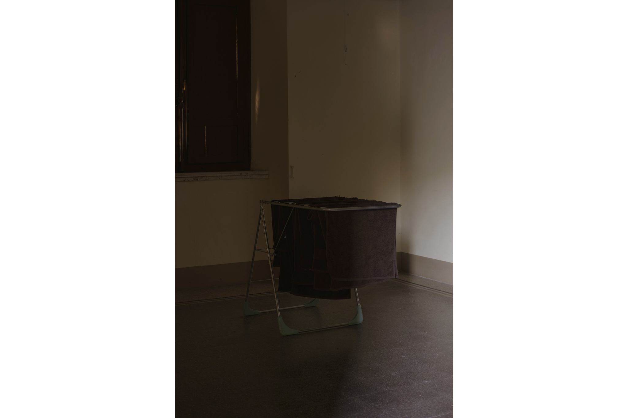 Al secondo piano, il clima di trascuratezza prosegue, e, girando nelle stanze lasciate andare, con persiane chiuse e segni ovunque, sui muri, di eventi passati, si incontrano un grande quadro notturno, ctonio, spettrale, con un “torpido cielo nero […] chiazzato di una luce verdognola come un livido”3 sopra un campo di fiori di cipolla. Nella stanza accanto, più che altro un largo corridoio, illuminato da un fascio di luce che proviene dall’immensa finestra delle scale, uno stendino, o quasi, con sopra lasciata ad asciugare una serie di asciugamani, con ogni probabilità appartenenti alla villa, che presentano le sigle DV, le stesse che sono anche sulla balaustra di ferro davanti al portone di ingresso. Questo ambiente si conclude con una pannellatura di legno che blocca l’accesso alla stanza successiva ma che lascia intravedere, in alto, lo spazio all’interno illuminato dall’unica finestra aperta in quel piano. Da qui parte un rumore impreciso, in cui si coglie il respiro di una fisarmonica. Torniamo fuori, il respiro della fisarmonica diventa intenso e si trasforma in suono, in una musica dimenticata e dolce ma anche spettrale, che riempie l’aria con un leggero riverbero, come se suonasse in una chiesa, e che fa muovere i tavolini sul palco in una coreografia meccanica.
