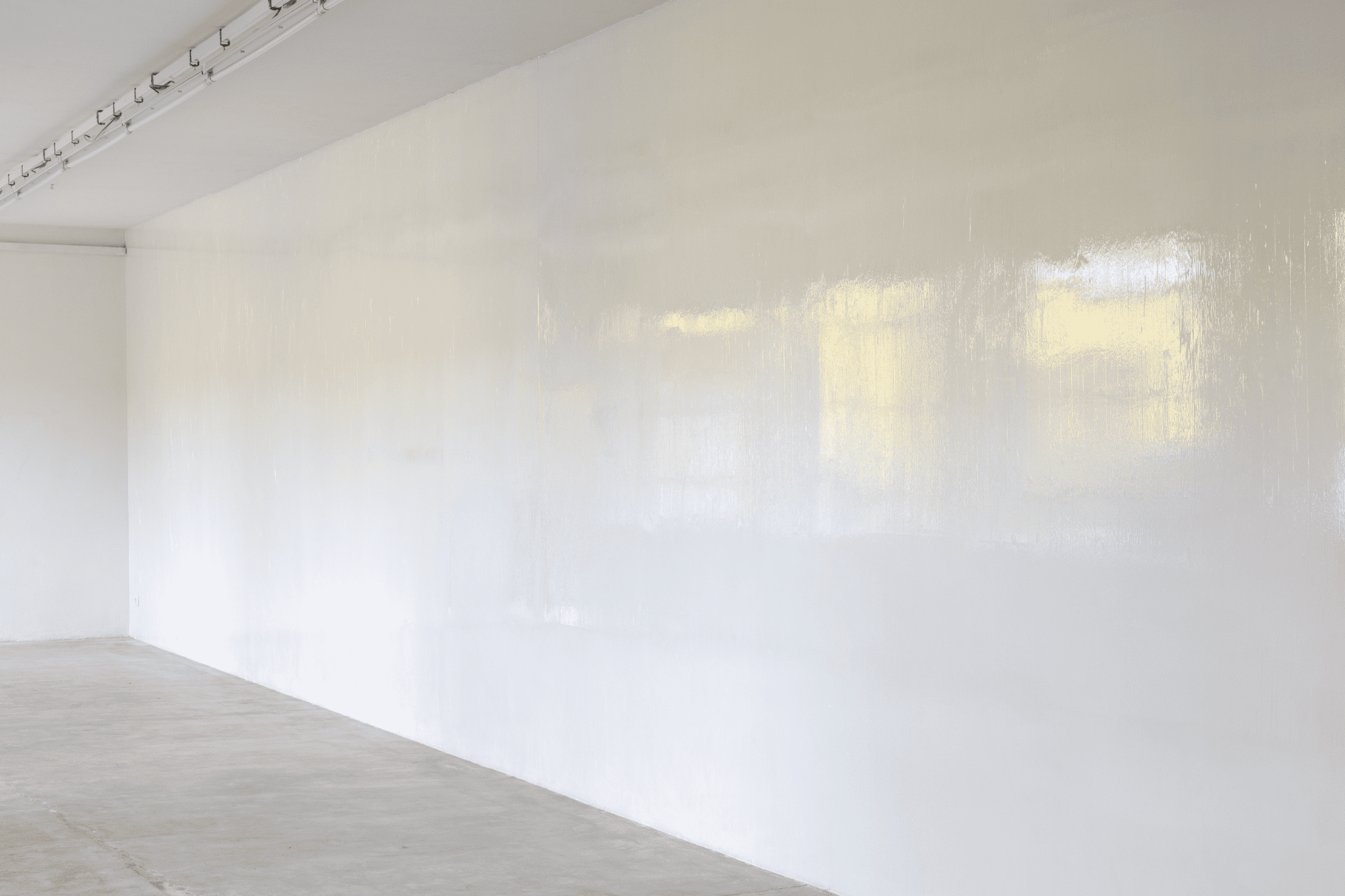 Strisce verticali di nastro adesivo trasparente ricoprono una parete di 16 metri, rendendola leggermente luccicante. Il gesto gioca con l’architettura, coreografando l’esperienza dello spettatore e portando l’esterno all’interno.