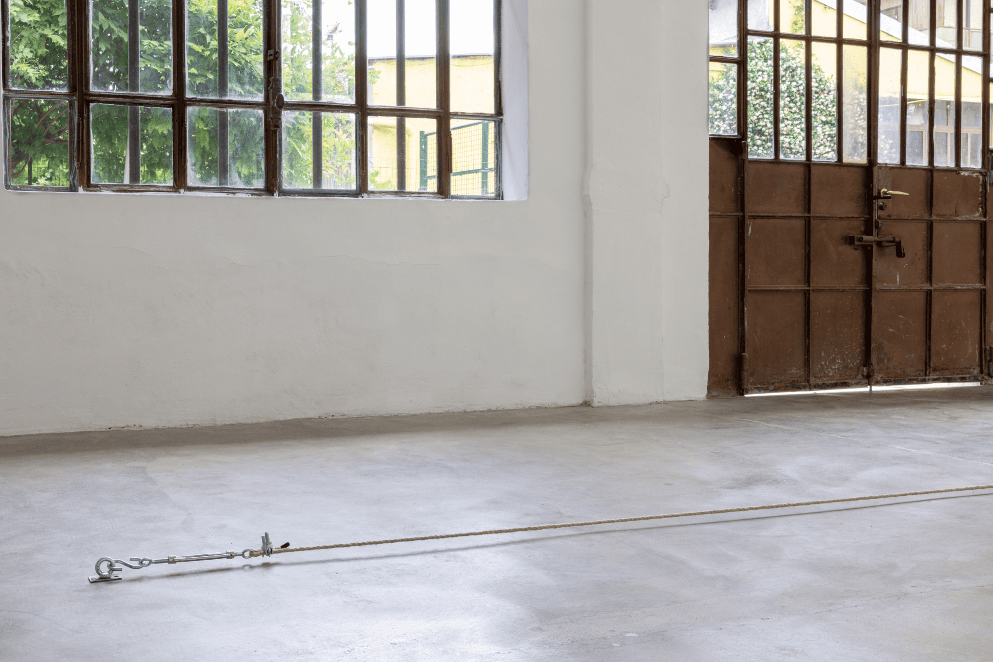 Una corda di manila si estende orizzontalmente, ancorata al pavimento a ciascuna estremità, creando una linea che fluttua appena sopra il pavimento. Occupa lo spazio come tensione sia reale che concettuale.