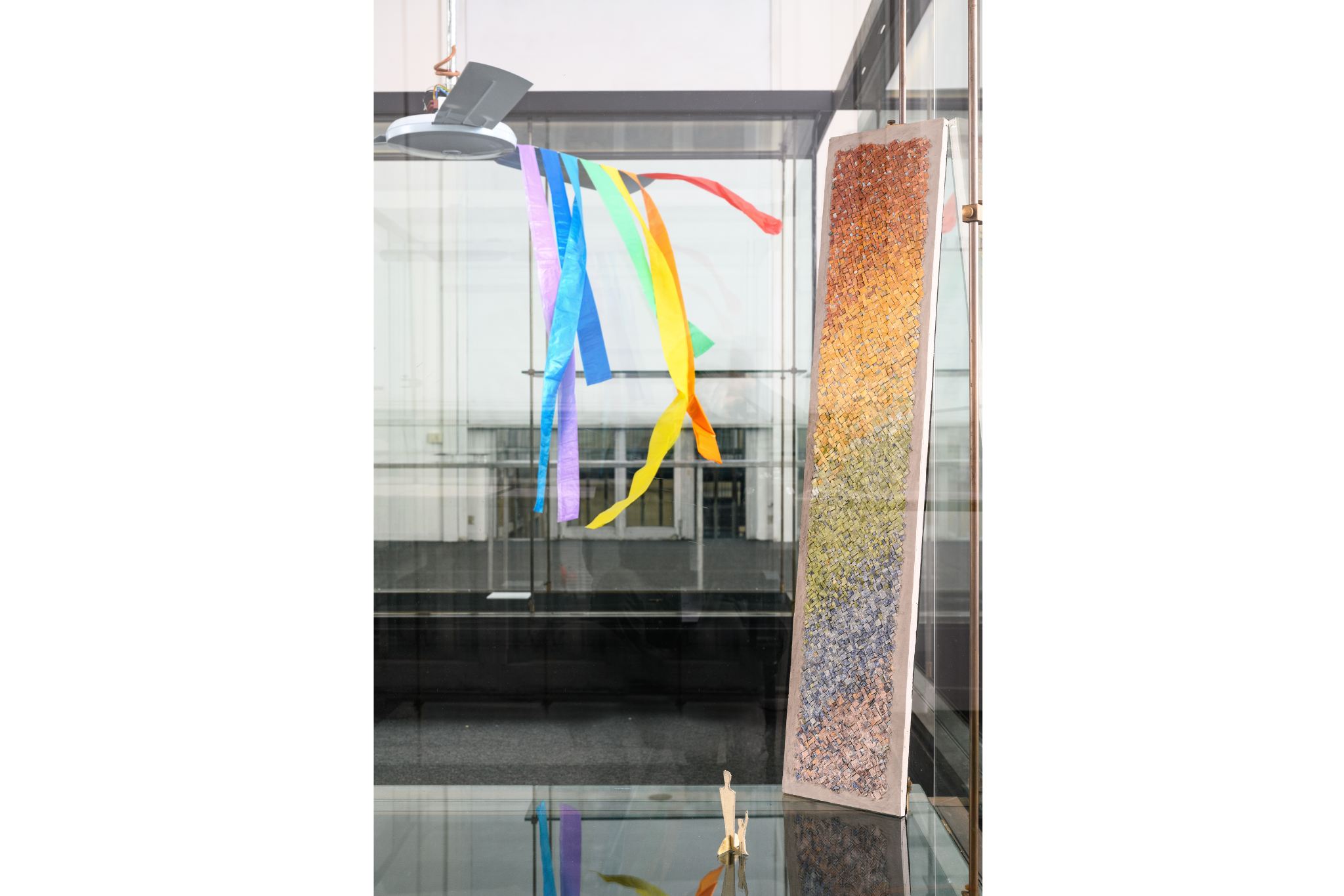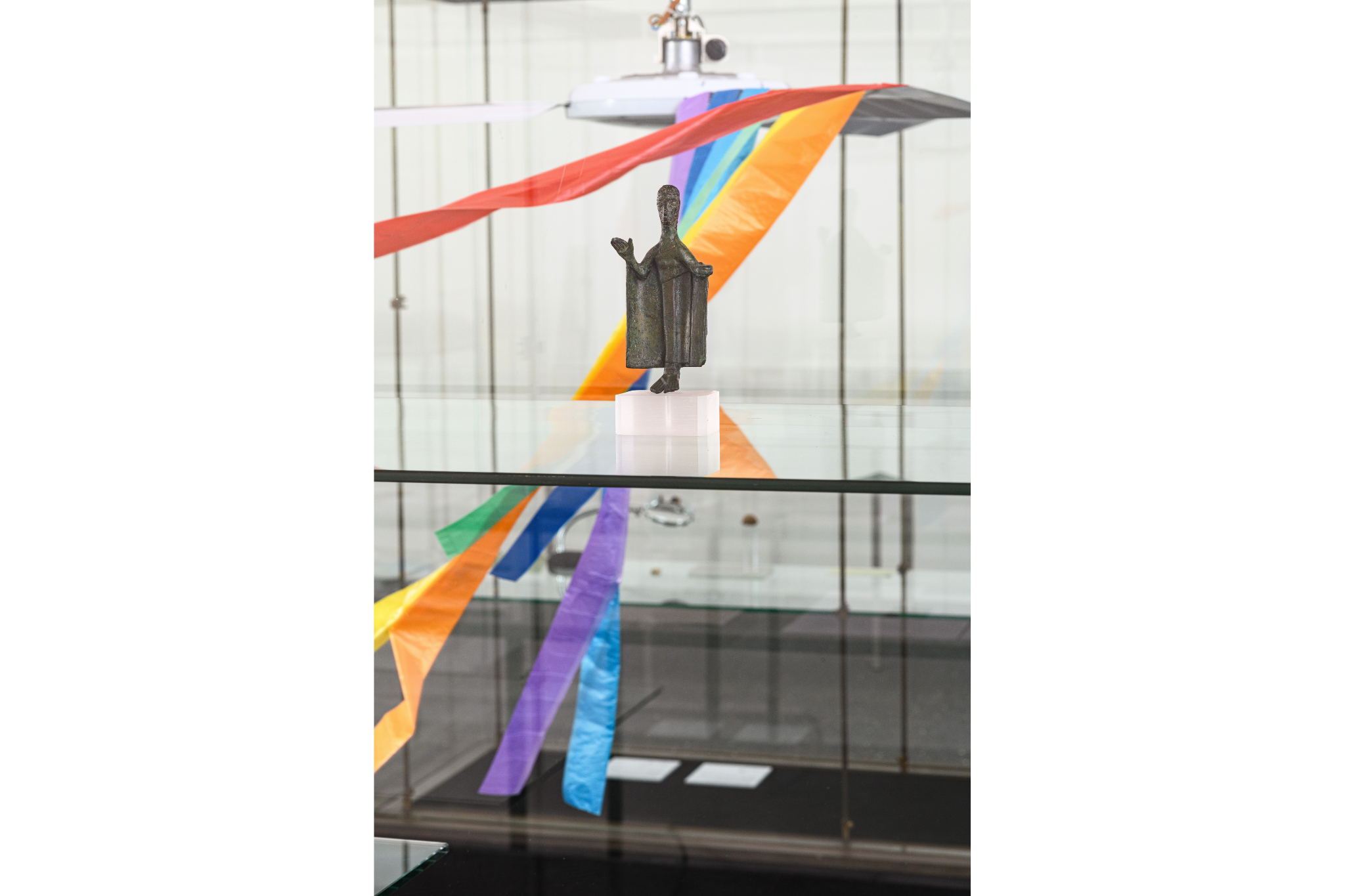 Anche l’allestimento è incentrato su una doppia figura geometrica. La prima è quella del quadrato, che richiama la locuzione “fare quadrato”, ovvero il gesto di unirsi per proteggere collettivamente qualcuno o qualcosa. La mostra si articola infatti in quattro vetrine museali storiche poste al centro, in cui sono custoditi alcuni dei reperti e manufatti più piccoli e fragili delle collezioni, mentre sui lati della sala quattro gruppi di teche raccolgono le idee e i bozzetti, i pensieri e le simulazioni che l’artista ha proposto nel corso della sua ricerca. La seconda figura è quella del cerchio, attivato dal movimento di un ventilatore che pende dal soffitto al centro della sala, a cui sono attaccate alcune strisce di plastica colorata che lambiscono le vetrine museali evidenziandone il ruolo di discrimine e controllo.