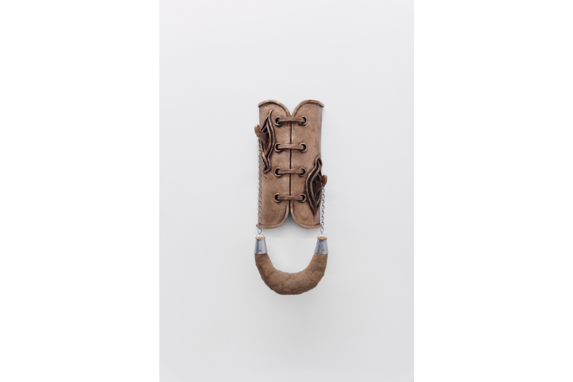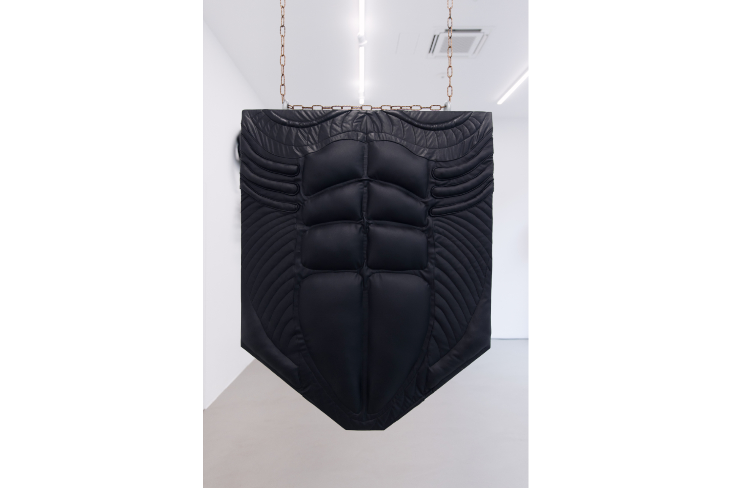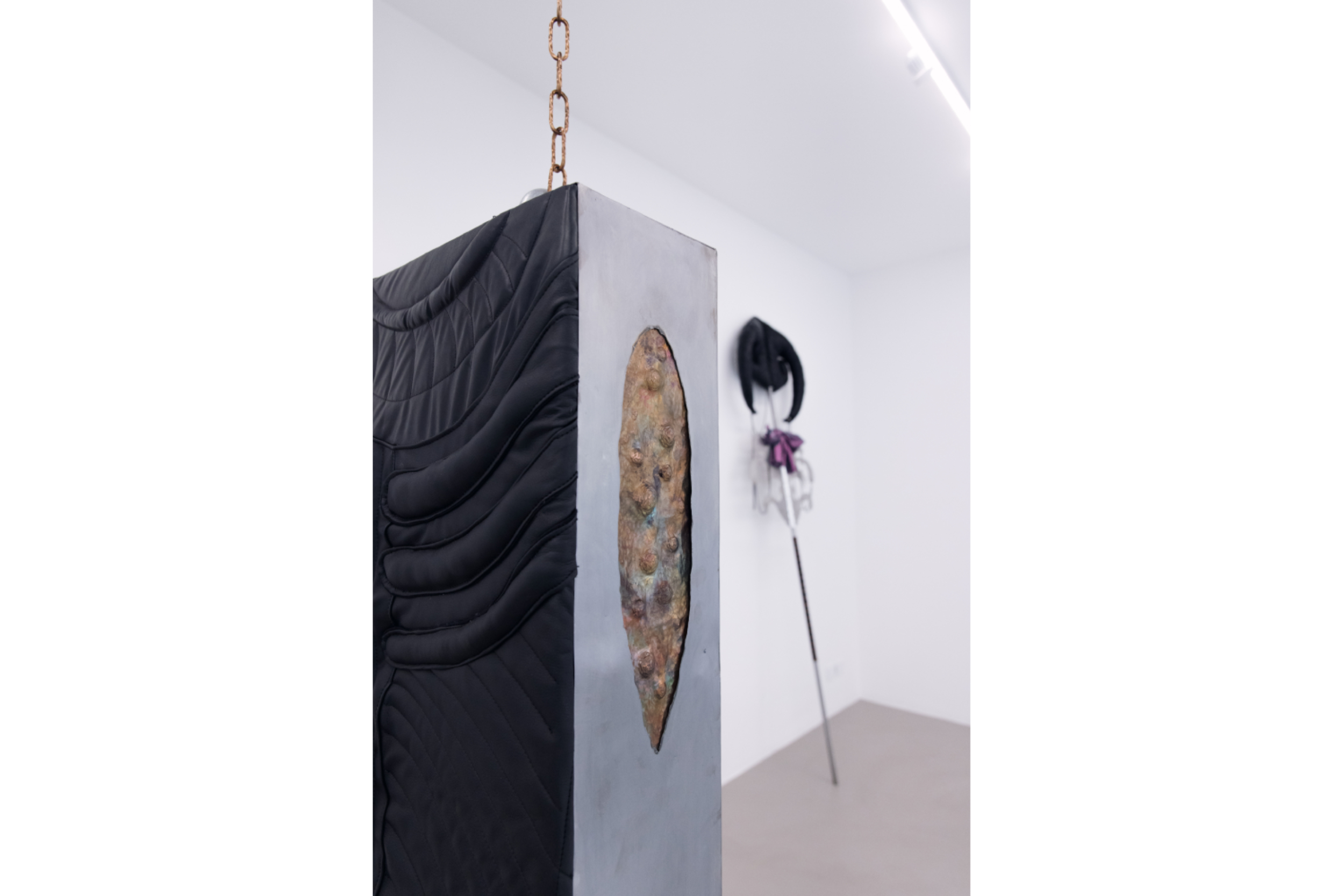 Centrali, in questa prospettiva, sono le problematicità nate dalla tensione tra speranza nel progresso e paura della tecnologia. Ricordi, sogni ed esistenzialismo sono attraversati con apparente semplice ironia da Genovese. In realtà la parodia è l’inquietante spia di una più ampia riflessione sulla società odierna, l’avanzamento tecnologico e il mondo dei social media. Il registro tragicomico adottato gioca e insieme disorienta lo spettatore, portandolo a riconsiderare lo scorrere del quotidiano. Se in un primo momento i protagonisti delle sue storie sembrano essere prigionieri del copione, delle loro vite e delle loro stesse creazioni, quel che emerge alla fine è la volontà di una rivoluzione. Quelli di Nicola Genovese sono corpi che sfuggono al loro destino biologico e che si ribellano, forti delle loro fragilità. In questo elogio alla vulnerabilità3, legato a una sessualità smitizzata, si intromette una stratificazione barocca dei media: oggetti funerei, come Tinnitus*1 (2022), 24/7 decay: Hommage to Jacques Callot (2023), Blacklash o The Sacred Son (2025), in marmo e metallo: una lapide di una persona ricordata per i pettorali. Ma anche sculture e oggetti che rimandano all’estetica Queer, BDSM e Camp: manette in ecopelle, fiocchi, lacci, biglie in metallo che ricordano i piercing, come in Snack (2022) o The Sacred Son (2025), catene, come in Butterflies (2023) e Vandelized Guts (2025). Il kitsch nell’immaginario di Genovese diviene una forma di autoaffermazione. Le sculture sono perlopiù appese, discendono verso il basso, a ricordare una forma di decadenza ineluttabile, o un prolungamento del corpo; come quelli che costituiscono Something That Scratches Your Skin (2023), di cui fa parte il braccio-mietitrice o la testa-calzare. Ma anche Paravent (2023), una panca-scultura portata in giro nello spazio da Genovese e i performer, a ricordarci la luce del telefono a cui siamo costantemente sottoposti.