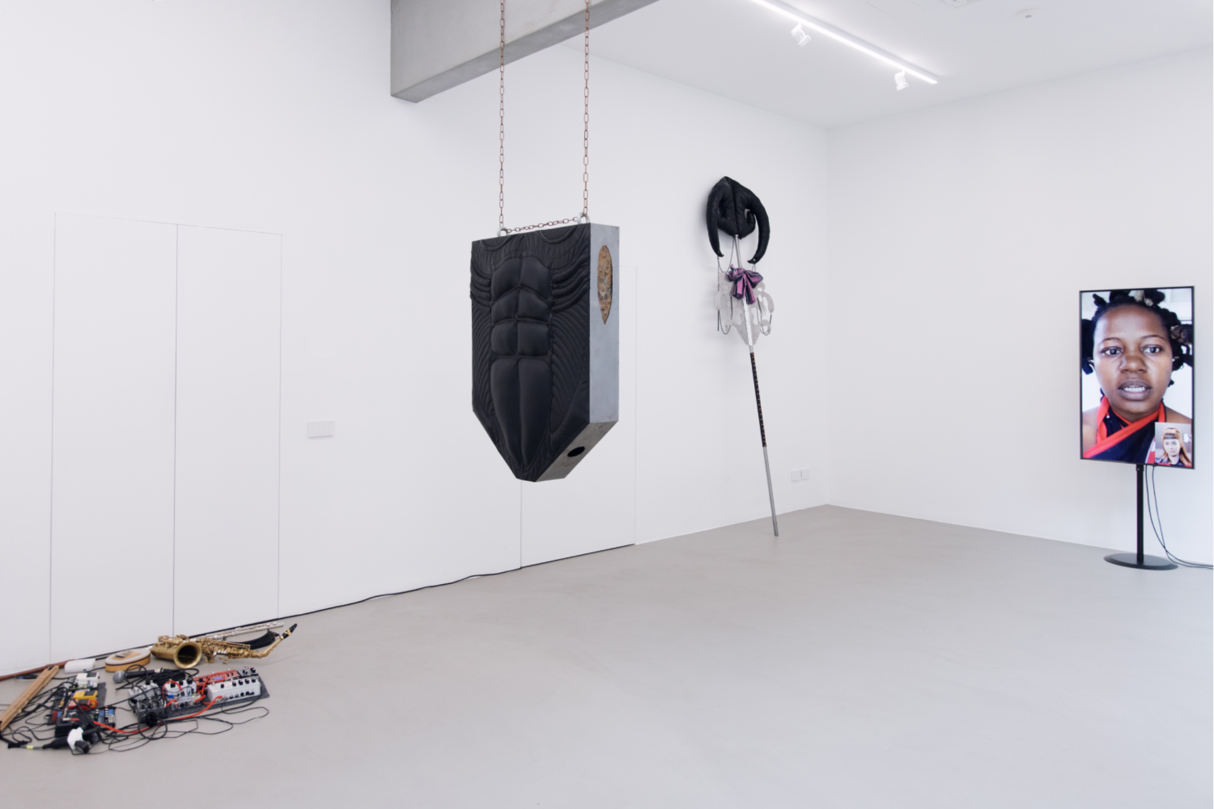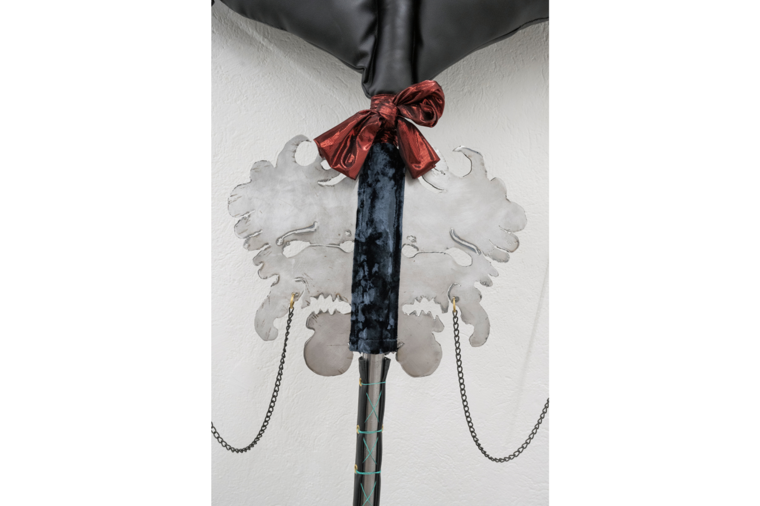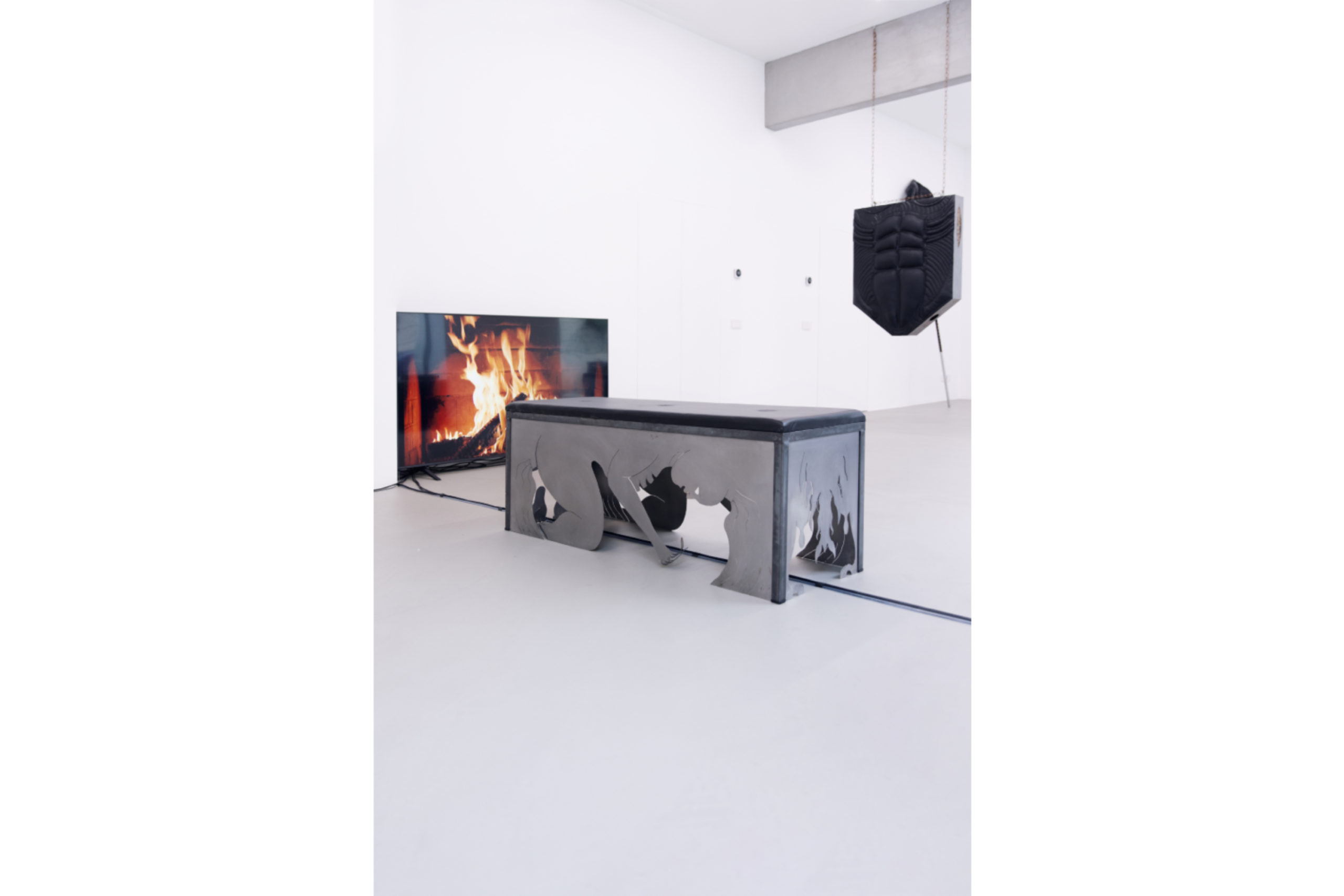 Centrali, in questa prospettiva, sono le problematicità nate dalla tensione tra speranza nel progresso e paura della tecnologia. Ricordi, sogni ed esistenzialismo sono attraversati con apparente semplice ironia da Genovese. In realtà la parodia è l’inquietante spia di una più ampia riflessione sulla società odierna, l’avanzamento tecnologico e il mondo dei social media. Il registro tragicomico adottato gioca e insieme disorienta lo spettatore, portandolo a riconsiderare lo scorrere del quotidiano. Se in un primo momento i protagonisti delle sue storie sembrano essere prigionieri del copione, delle loro vite e delle loro stesse creazioni, quel che emerge alla fine è la volontà di una rivoluzione. Quelli di Nicola Genovese sono corpi che sfuggono al loro destino biologico e che si ribellano, forti delle loro fragilità. In questo elogio alla vulnerabilità3, legato a una sessualità smitizzata, si intromette una stratificazione barocca dei media: oggetti funerei, come Tinnitus*1 (2022), 24/7 decay: Hommage to Jacques Callot (2023), Blacklash o The Sacred Son (2025), in marmo e metallo: una lapide di una persona ricordata per i pettorali. Ma anche sculture e oggetti che rimandano all’estetica Queer, BDSM e Camp: manette in ecopelle, fiocchi, lacci, biglie in metallo che ricordano i piercing, come in Snack (2022) o The Sacred Son (2025), catene, come in Butterflies (2023) e Vandelized Guts (2025). Il kitsch nell’immaginario di Genovese diviene una forma di autoaffermazione. Le sculture sono perlopiù appese, discendono verso il basso, a ricordare una forma di decadenza ineluttabile, o un prolungamento del corpo; come quelli che costituiscono Something That Scratches Your Skin (2023), di cui fa parte il braccio-mietitrice o la testa-calzare. Ma anche Paravent (2023), una panca-scultura portata in giro nello spazio da Genovese e i performer, a ricordarci la luce del telefono a cui siamo costantemente sottoposti.