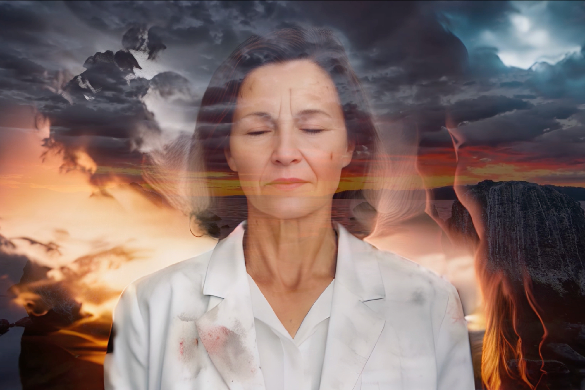 Seguo la narrazione in sala. Un CEO di una corporation digitale presenta un nuovo prodotto WARP che promette di dissolvere sentimenti come la nostalgia per il passato e l’ansia per il futuro. Il fumo mi ricorda l’annebbiamento da iperstimolazione – che era una delle possibilità di risposta elencante nel questionario – e sugli schermi in stage ci sono simboli dell’era post-capitalista. Il fuoco della Tesla ci trasporta nel doom contemporaneo in bilico tra desiderio e disperazione. Quello che si prospetta velocemente quindi è uno scenario post-apocalittico instabile e mutageno, con metropoli prive della presenza umana e disseminate degli scheletri dei suoi prodotti. Un ecosistema discarica, un inferno tecnocratico; ambientazione grottesca che Genovese rievoca anche attraverso le sperimentazioni elettro-acustiche con la musicista Magda Drozd del duo musicale Sopraterra. Suoni post-rock, shoegaze, psichedelici – che si ispirano all’Ars Nova medievale alla musica barocca e influenze drone e ambient – che appartengono a una percezione estemporanea: tra un passato ancestrale, da cui riemergono gli archetipi, i miti e una memoria collettiva, e un futuro in cui si affaccia un’era digitale e post-umana, in cui è sempre in azione il complesso legame umano-macchina.