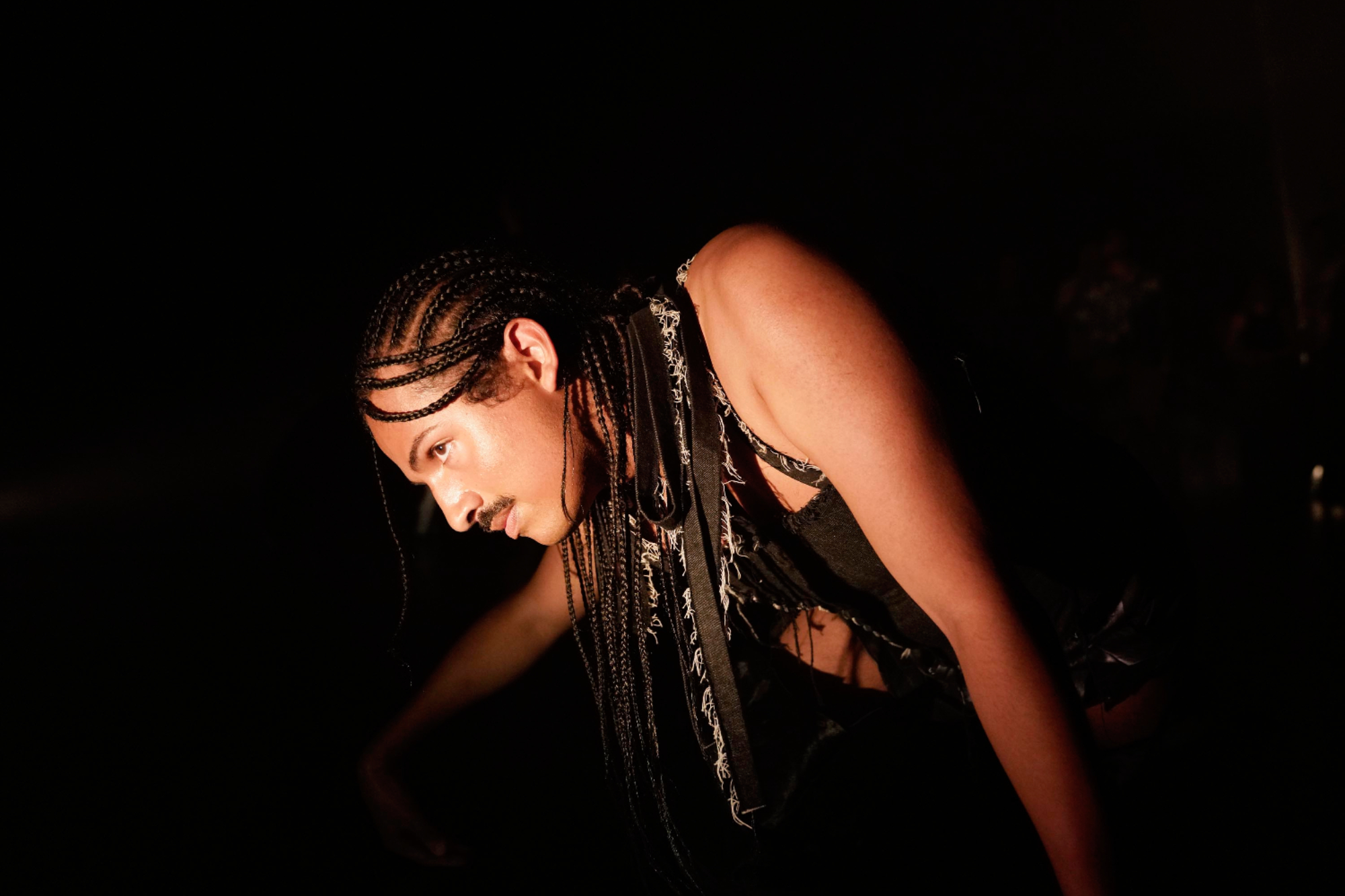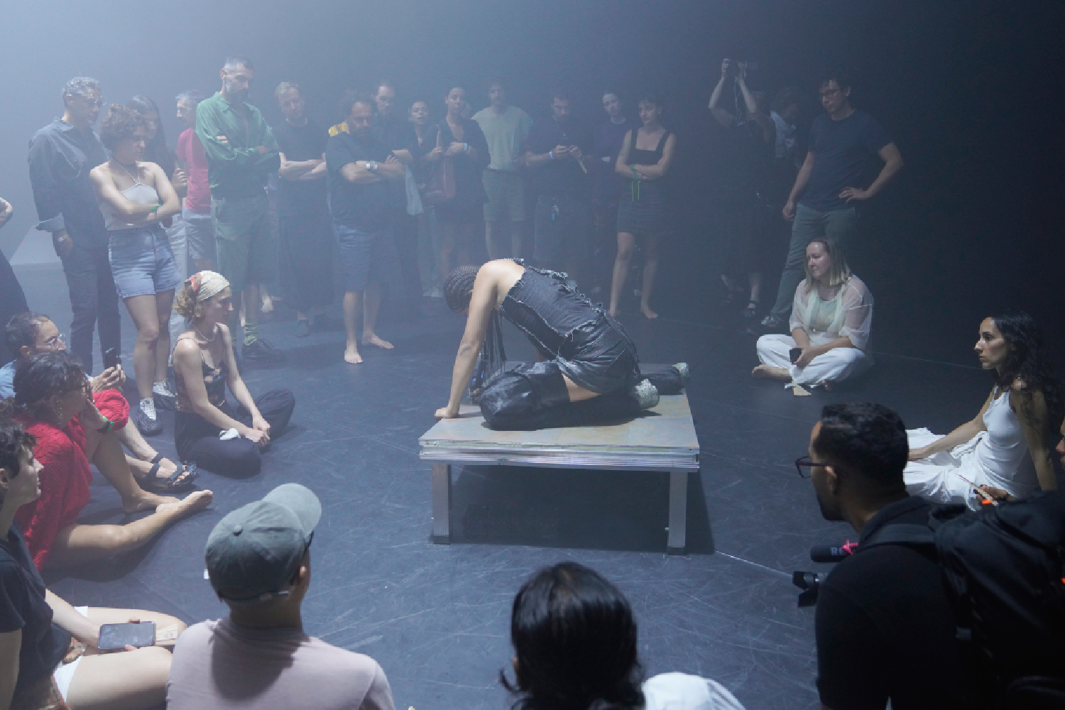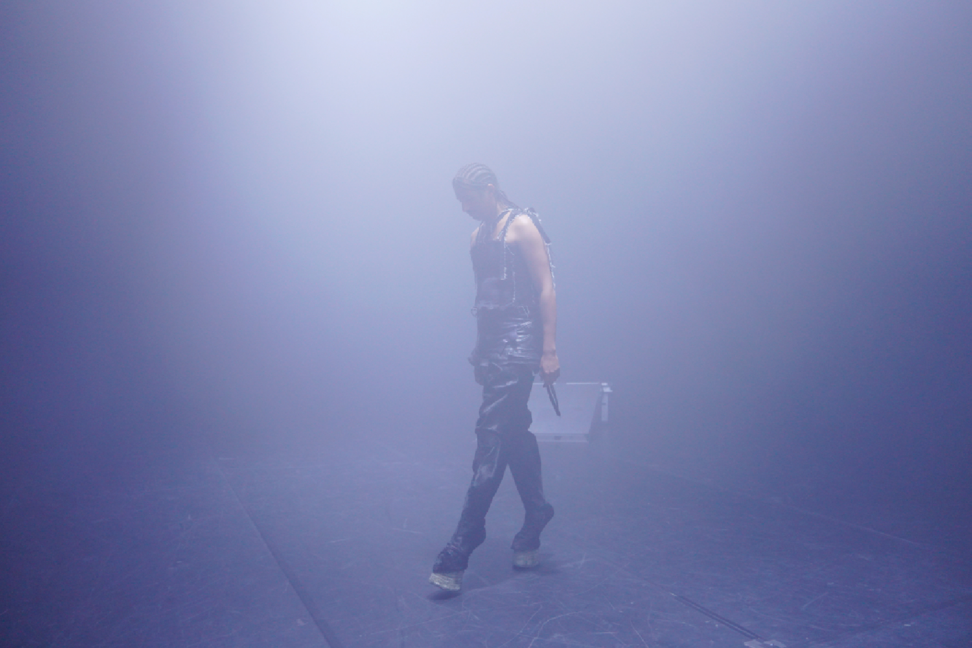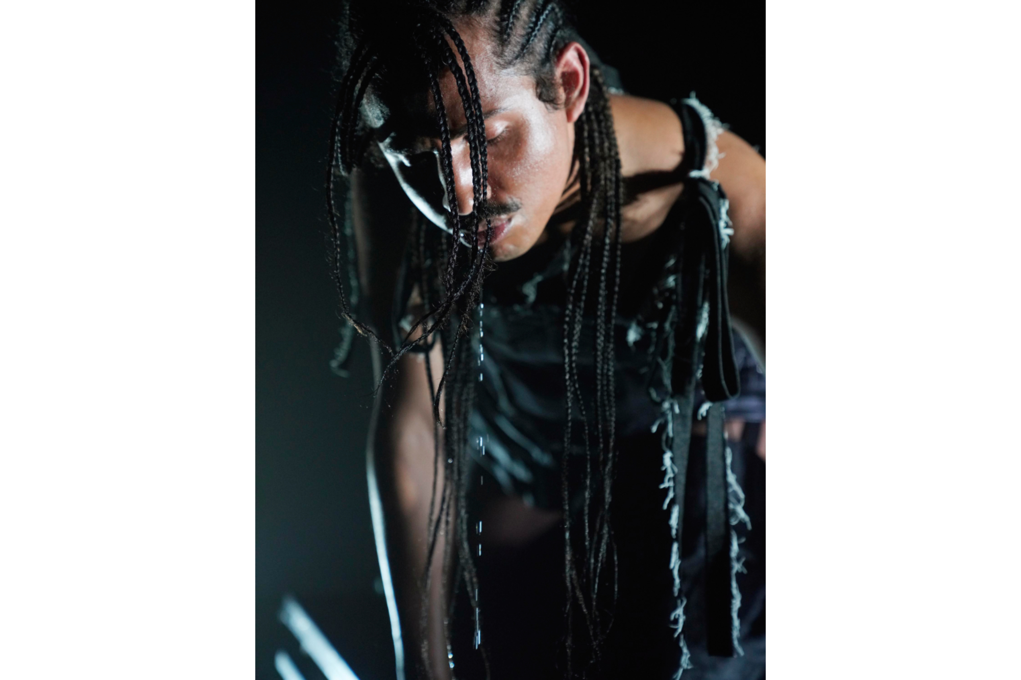 Dawn di Adam Seid Tahir ha avuto il grande pregio di farci trovare tutti in uno stesso spazio, su un medesimo livello, corpi che si muovevano in branco seguendo il suo corpo-cavallo. Una luce calda come le estati che stiamo vivendo inonda il rettangolo nero in cui ci troviamo, spogliati di scarpe, borse e tutto ciò che può ostruire una corretta esperienza. Comincia incidendo su una pedana frasi come afro-vicking new identity / unlocked in una stanza colma di fumo e un tappeto sonoro con un cavallo al trotto su ghiaia. Scendendo dalla pedana quel corpo con zoccoli si trascina a terra seguendo una sorta di percorso a otto, quindi il simbolo dell’infinito, puntando i fari posti agli angoli, di luce fredda e pungente, che man mano divengono le uniche fonti di visibilità che l’artista prende e porta dietro con sé, a volte accecandoci. Si alza, possente, altissimo sui suoi zoccoli, raccoglie tutte le luci e le posa vicino a un’altra pedana dove si posiziona per emettere lentamente rugiada dalla sua bocca, rappresentando quindi il cavallo della mitologia norrena: è l’aurora di Hrímfaxi, cavalcato da Nótt, la notte. Tutto intorno il suono del galoppo diviene palpabile.