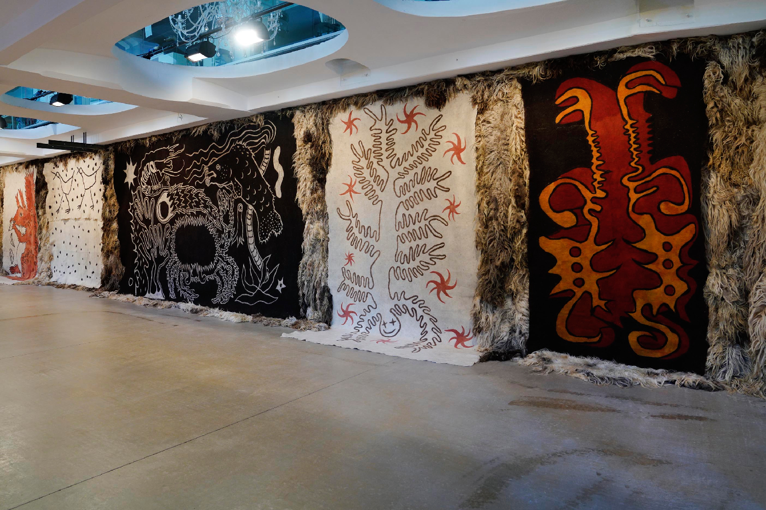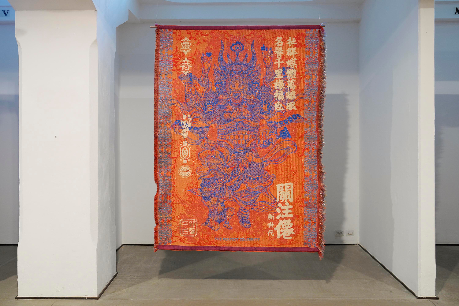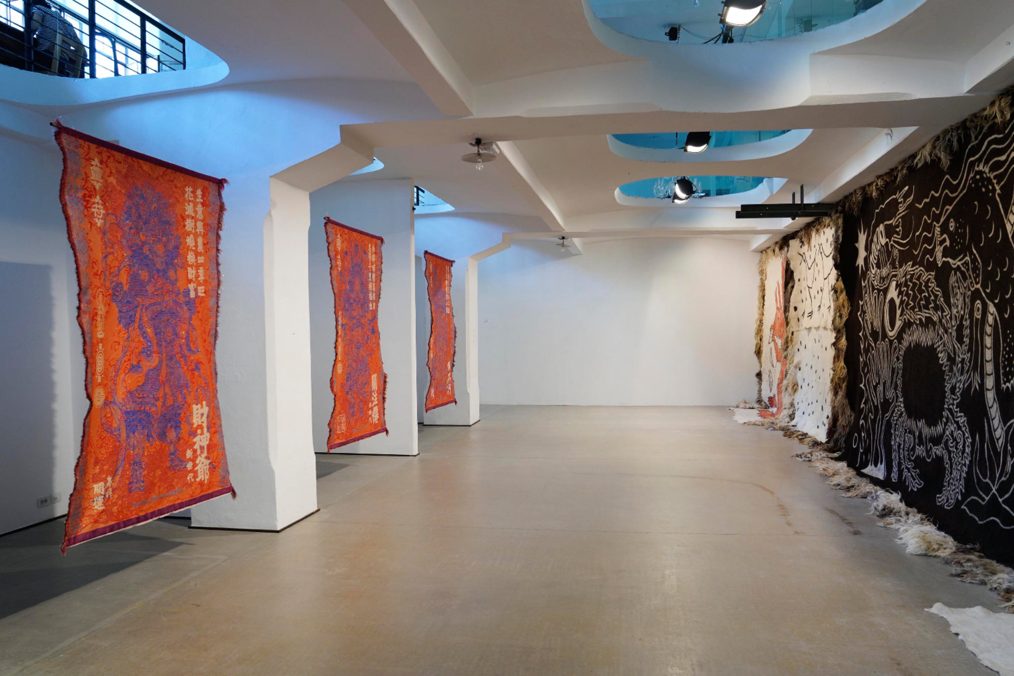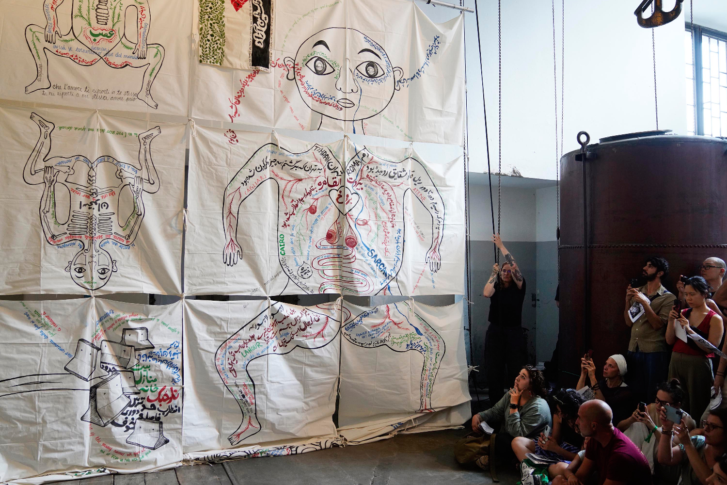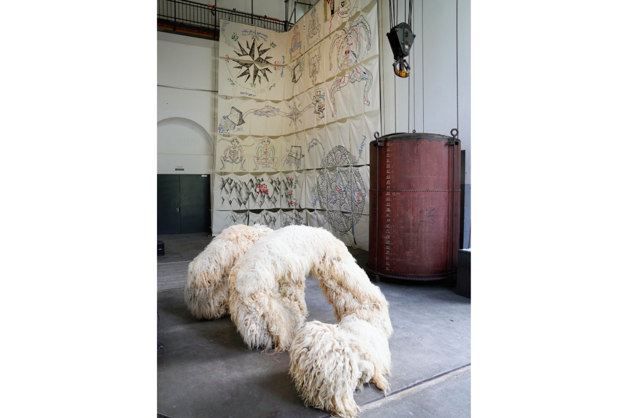 L’intera parete di destra del lungo ambiente rettangolare è totalmente ricoperta da grandi porzioni di feltro in lana (Théophile Peris, Vello, 2025) dove linee definiscono figure di lontana memoria, della mia infanzia come di quella dell’umanità. Di fronte ci sono altri tre teli, di fattezze orientali, dal colore dominante rosso-arancio (Marcos Kueh, Three Contemporay Prosperities series, 2024-2025). Mentre Simone Frangi presenta la mostra, mi giro e noto sul telo a me più vicino una figura che tiene in mano una statuetta d’Oscar. Anche i due ragazzi accanto a me ne sembrano sorpresi, lei la indica a lui e sorride. E io penso a come siamo diventati; probabilmente è oramai più riconoscibile la statuetta hollywoodiana piuttosto che un melograno. Frangi continua e tutto acquista un senso. Divinità cino-malesi scomparse durante il colonialismo e riapparse con l’indipendenza della Malesia, ma con attributi occidentali. Come quando il Rinascimento ha risputato fuori figure della mitologia classica uscite dal Medioevo storte, distorte, digerite. Ci muoviamo verso l’ingresso dove la scultura lanosa sempre a firma di Peris (Ressort, 2024) sembra a molti procurare l’istinto di un abbraccio (per me è ancora caldo per cui non lo procura, eppure sono in Trentino). Musica tradizionale iraniana accompagna Giulia e Golrokh mentre sollevano la prima striscia di una mappa di 9 metri composta da 36 pezzi di stoffa quadrata (tanti quanti i giorni di cammino da Tehran a Fies) da loro disegnati con parole, simboli, forme: verde, rosso e nero su bianco. Si parla di una precedente distanza, quella che non permise loro nel 2020 di fare la residenza qui insieme e quella che ora sta dividendo il mondo tra silenzio, connivenza, speculazioni, sangue, oppressione e impossibilità di pensare ad altro. Loro, leggono, senza mai prendere fiato: