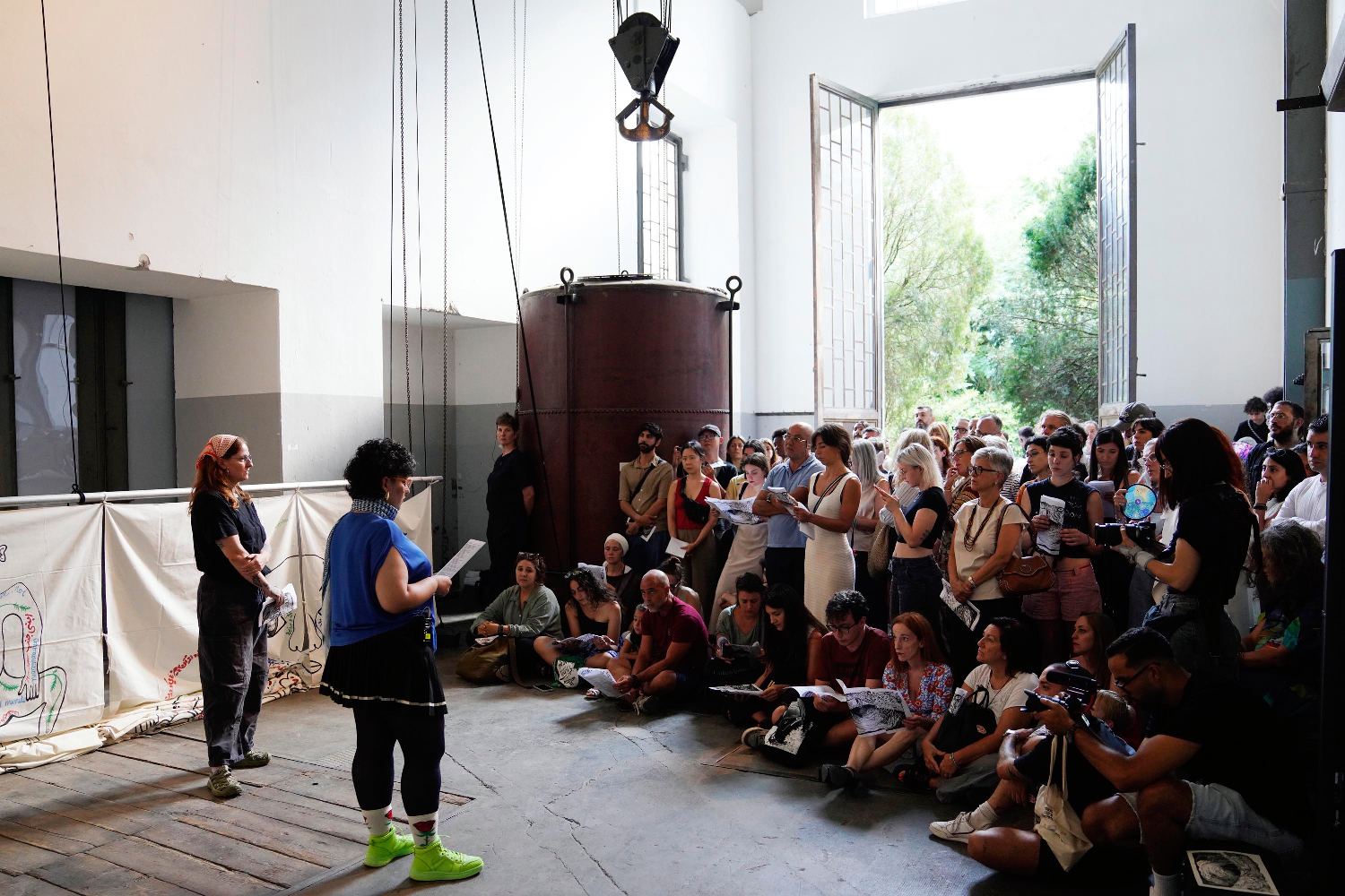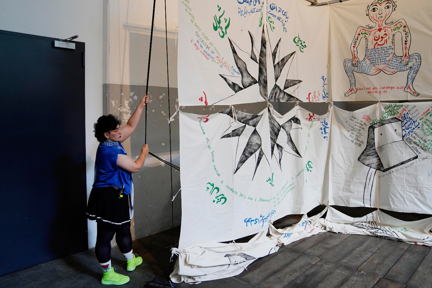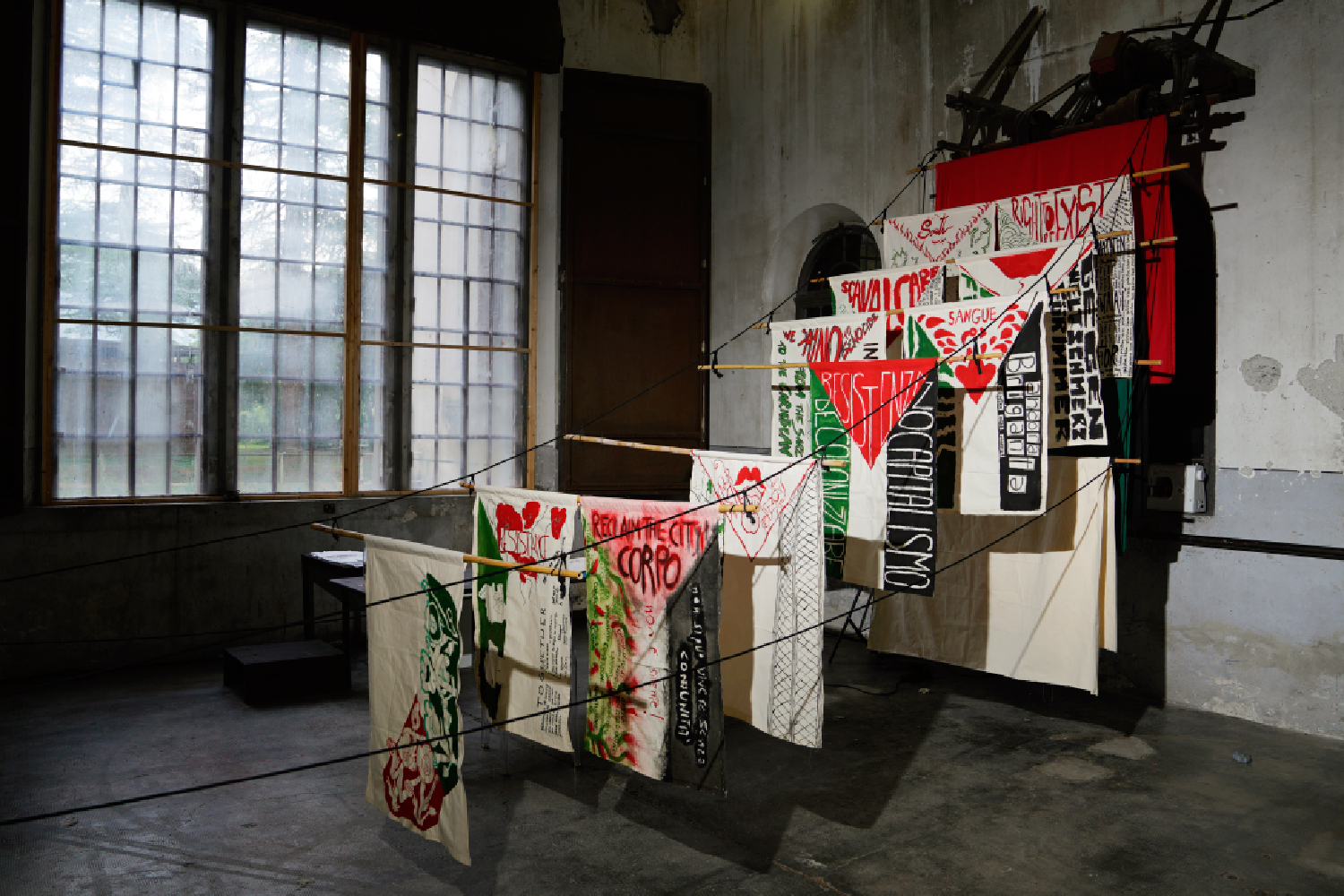 Alla fine della lettura sollevano tutti i teli a comporre una parete parlante, esordio e cornice del loro workshop dedicato a pensare, costruire e dipingere le nostre bandiere.
