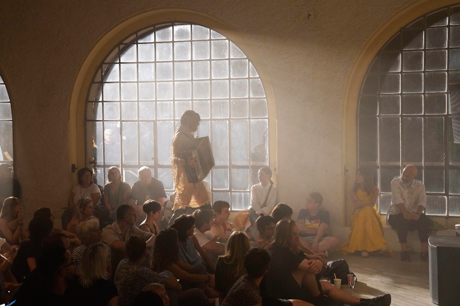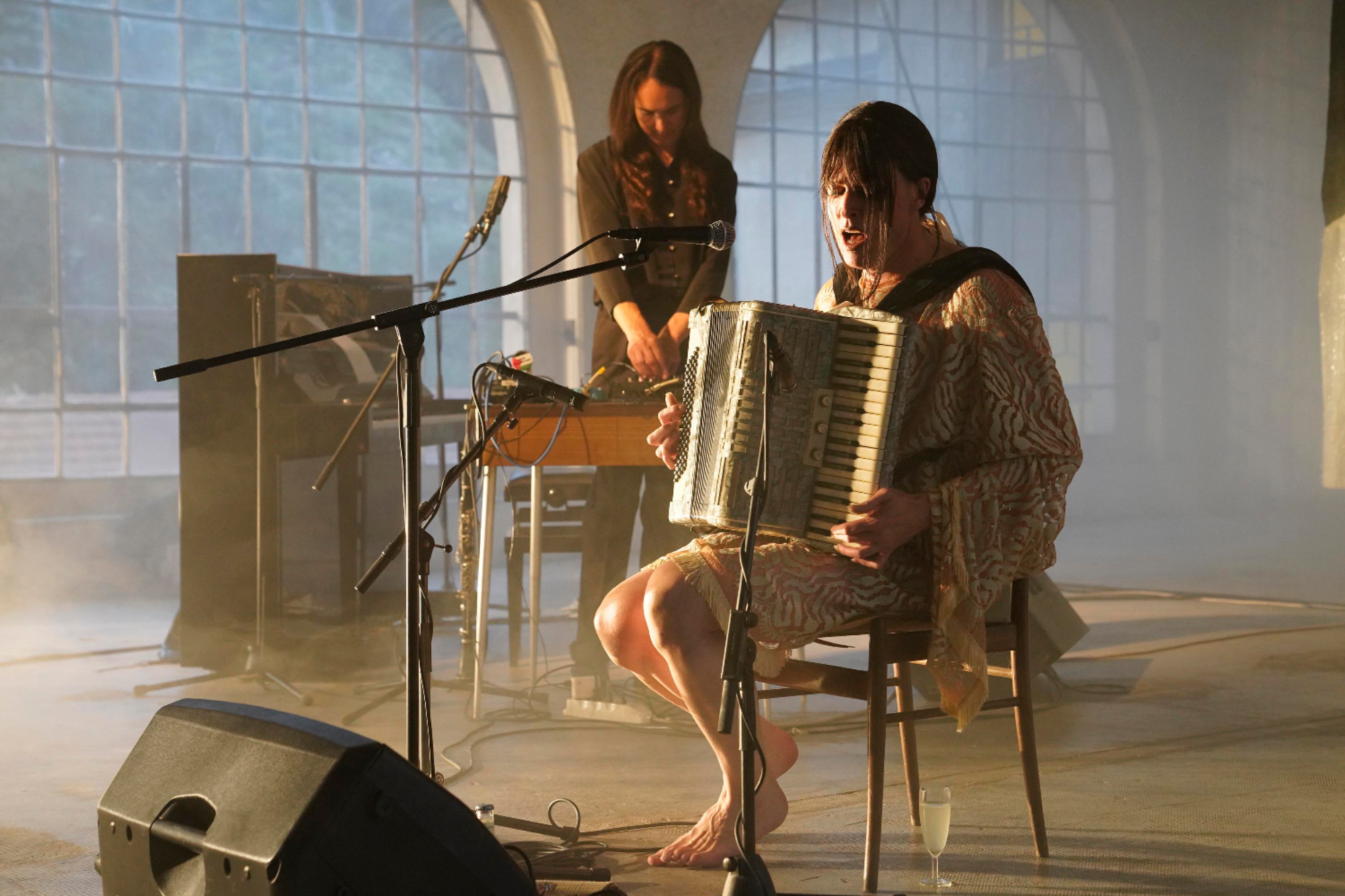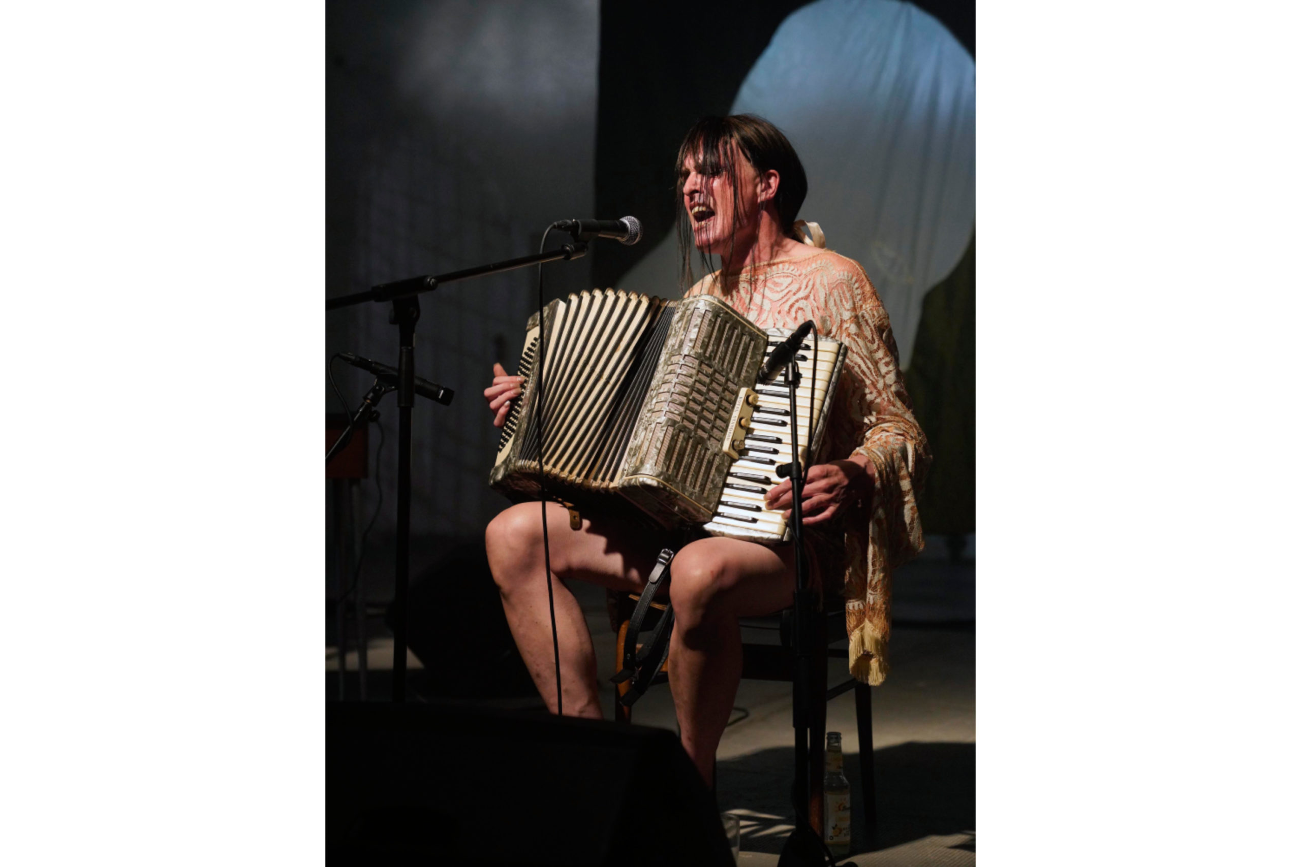 Adam Christensen arriva. Dolcissimo il fiocchetto che tiene i suoi capelli corvini, e il suo vestito, dalle maniche larghe e lunghe, trasparente. Cammina tra noi, a piedi scalzi, suonando la fisarmonica. Poi si siede e comincia. Una voce e un volto trasformati e posseduti dal canto. Una potenza che racchiude la possibilità del rapimento. E il viaggio interiore viene illuminato da una luce crepuscolare che arriva da un faro esterno che passa attraverso la finestra alle mie spalle (comunque avrei dovuto prendere il ventaglio).