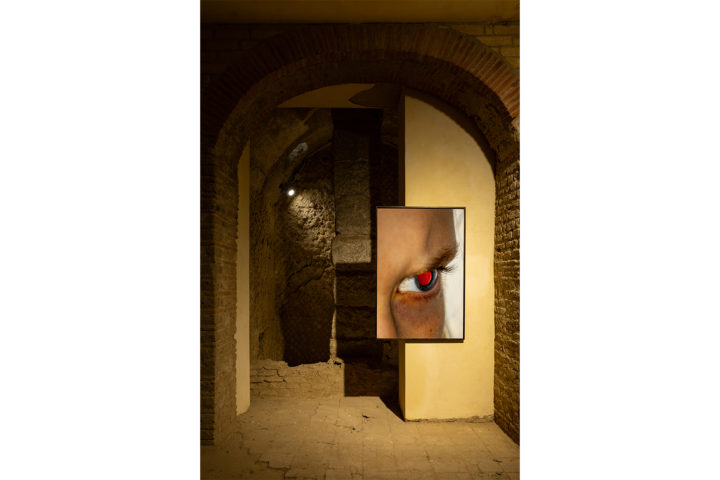 Lo dimostra la grande scultura di Ugo Rondinone, che accoglie i visitatori nel cuore del Rione Terra affacciandosi sul Mediterraneo, come un guardiano silenzioso sospeso tra terra e mare. Il piano di calpestio del Rione Terra è nettamente superiore a quello dell’antica Puteoli, fondata nel 194 a.C. e oggi diramata sotto la città moderna, sorta sulle ceneri di un’eruzione. Nei corridoi sotterranei della città antica trovano posto gli scatti di Simon Dybbroe Møller, fotografie di occhi illuminati dal flash che sembrano scrutare chi passa, generando un gioco di sguardi che accompagna il visitatore tra le strade ormai sotterranee dell’antica città romana.