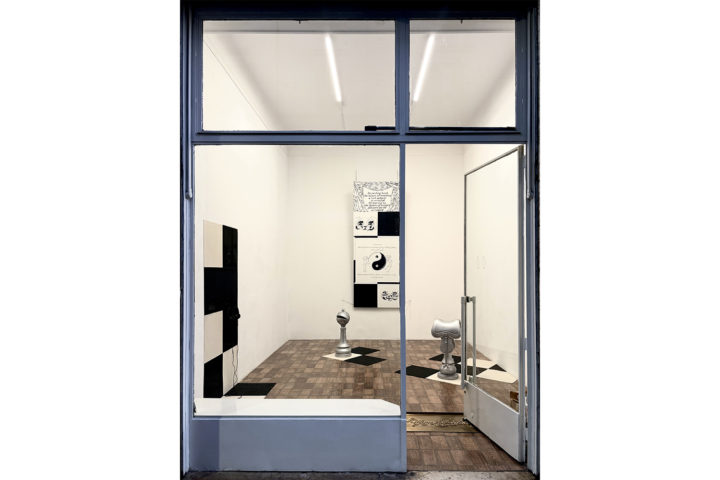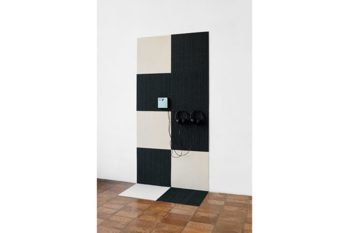 Greta Pasini: La mostra che hai pensato per Milliony Arlekina presenta un livello di stratificazione importante: l’installazione a pavimento, la grande tela, le due sculture, una pubblicazione e un sound piece. Hai saputo intrecciare la tua ricerca all’identità della galleria, un luogo multiforme aperto al cambiamento continuo, che sfrutta il dispositivo di una grande vetrata. Come spesso avviene nel tuo lavoro, tutto inizia da un testo…