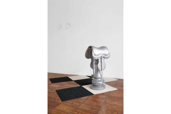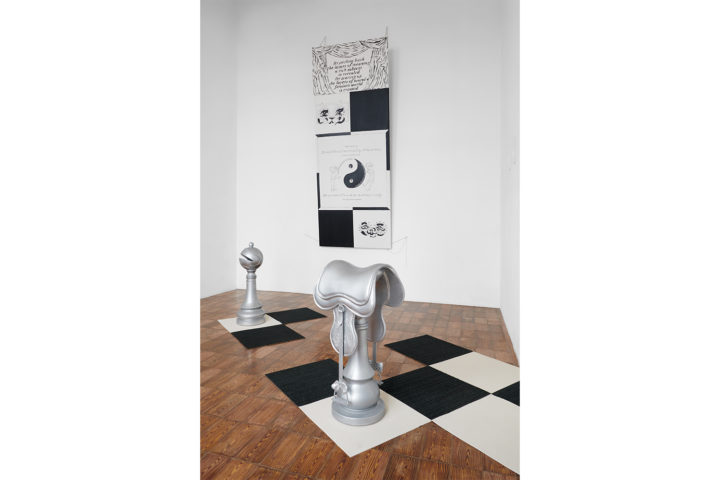 Valentina De Zanche: Sì, tutto nasce dal testo Noise of Time (2025), una sorta di stream of consciousness tra una voce narrante e due protagonisti: l’alfiere (And the bishop goes ziiiiink, 2025) e il cavallo (But then the knight comes, the knight comes, 2025) che, nella mia opera, perde la sua animalità estetica sintetizzandosi in una sella. Ho scritto Noise of Time (2025) con un andamento ritmato, capace di restituire una componente fondamentale del gioco: l’attesa e lo scambio di turno tra i giocatori. In qualche modo l’alfiere e la sella rappresentano anche un dualismo maschile-femminile che riflette sia strutture sociali che dinamiche individuali. L’alfiere è elemento di forza e agilità, ma si interroga sull’efficacia del proprio agire mostrando vulnerabilità, insicurezza e bisogno di controllo. Il suono che produce è meccanico e tagliente: ziiinkkkk… ziiiinkkk… Lo si immagina tagliare la diagonale con decisione, per poi fermarsi e guardare scettico alle proprie mosse. Grazie a questi due personaggi, che in mostra diventano sculture argentate, parlo del mio modo di vivere il tempo: una scansione percepita come ricerca continua, radicata nel bisogno inconscio di trovarle un senso. A questa ricerca si intrecciano vari temi che alimentano la mia pratica: l’esistenzialismo, la politica, l’ambientalismo, il ricordo emotivo, ma anche gli obblighi lavorativi e sociali. Con la mostra da Milliony Arlekina ho contestualizzato queste due figure antitetiche come reduci da una lunga partita: appaiono congelate dopo un’analisi introspettiva dei reciproci ruoli in società e dei concetti di tempo e spazio come dimensioni essenziali.