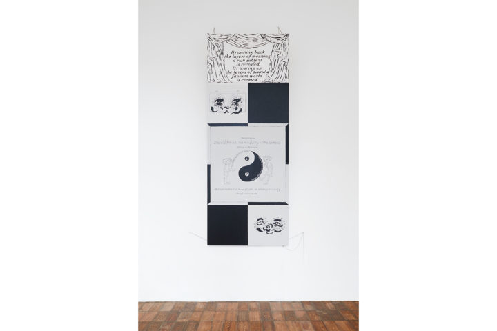 GP: Alfiere e sella si materializzano nelle sculture in mostra. Sono due, come i colori che si alternano sulla scacchiera del pavimento e sulla tela dipinta: bianco e nero. Un dualismo che, come accennavamo, ritroviamo anche nel ritmo del testo che hai scritto. A un certo punto, la voce narrante recita: «By peeling back the layers of meaning, a rich subtext is revealed. By tearing up the layers of sound a fandom world is created.» È la stessa frase che compare dipinta, con carattere graziato, al centro di un sipario tratteggiato, in cima alla grande tela Layers of meanings, layers of sound. Sotto, cinque riquadri simili a vignette di un fumetto si susseguono in una composizione che alterna proporzioni e direzioni: i primi due più piccoli, disposti in modo speculare agli ultimi, mentre al centro campeggia un pannello più grande. In quest’opera, come nel resto della mostra, le parole guidano lo sguardo e l’ascolto, invitandoci a “sollevare il velo di Maya” per entrare in una dimensione percettiva diversa, in cui spazio, tempo e suono si fondono. E proprio su questo: spazio, tempo e suono parlano di te… o parlano anche di noi?
