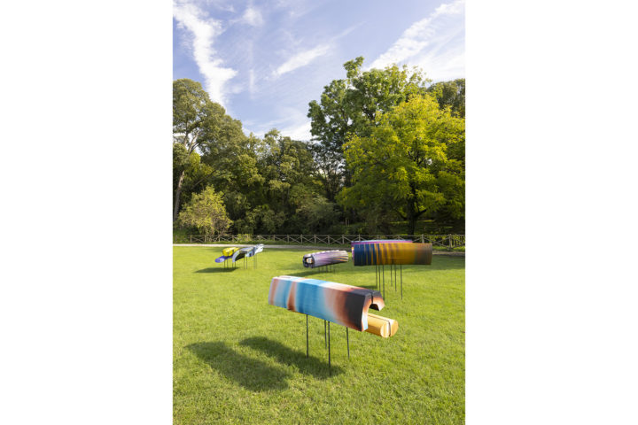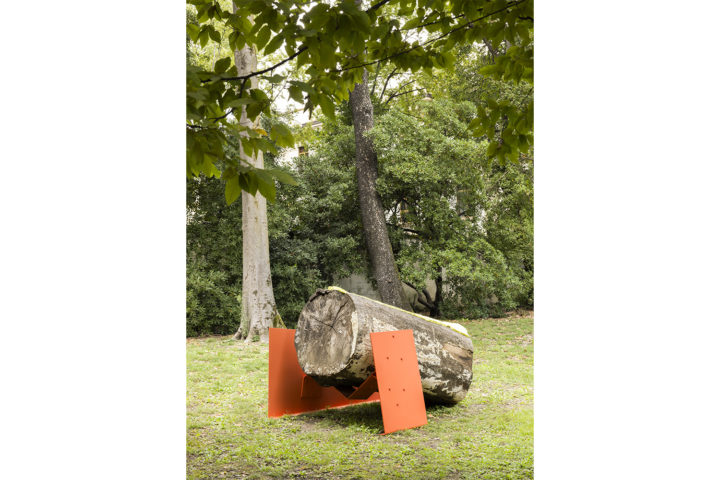 Proseguendo nel percorso che dal prato porta verso l’interno del giardino, il visitatore incontra Carriers (2025), un intervento site-specific che si concentra su una serie di elementi preesistenti all’interno del parco, ovvero i frammenti del tronco di un bagolaro monumentale abbattuto da una tempesta nel 2023. L’artista recupera i pezzi di tronco e li dispone come fossero stati appena rovesciati, a formare un gruppo disordinato ma compatto; cambia la loro “postura”, sollevandoli parzialmente da terra attraverso una serie di supporti colorati in ferro che sembrano riattivarli, rianimarli, come a evocare la verticalità ormai perduta e suggerire allo stesso tempo l’inizio di un nuovo ciclo vitale.
