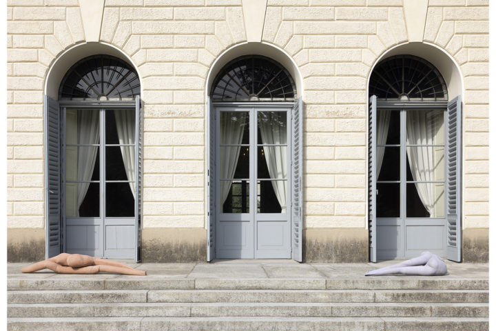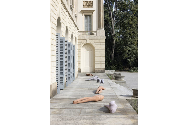Il corpo, con le sue posture, snodi e tensioni, è il soggetto implicito di The Jumpsuit Theme, le cui sembianze vagamente antropomorfe sono ottenute colando cemento e pigmento in una cassaforma morbida di tessuto tecnico con chiusure a zip. La miscela cementizia aderisce in tutto e per tutto al rudimentale abito costruito dall’artista per contenerla, dando forma e peso a quel che potrebbe essere un corpo disteso, che si allunga e si rannicchia nello spazio, che assume posizioni precarie, alla ricerca di un appoggio e un equilibrio. La posa sdraiata di queste pseudo figure pone l’accento su una dimensione orizzontale che sembra fare eco a quella che domina la facciata della Villa, scandita dalla successione degli archi al pianterreno, dall’alternarsi di semicolonne, finestre e altorilievi al piano nobile, e fa da contrappunto alla sequenza verticale delle statue che sormontano la balaustra.