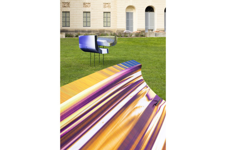 Questa ricercata orizzontalità e il ritmato susseguirsi di elementi proseguono nella variopinta scultura di grandi dimensioni Beyond the Skin (2025), installata sulla vasta distesa di prato antistante la Villa. L’opera è composta da ventitré elementi, disposti in modo circolare e sospesi a diverse altezze tramite sottili strutture in ferro; le forme geometriche sono ricavate da una serie di blocchi industriali di gommapiuma nautica, sagomate e rivestite con un tessuto tecnico usato per l’abbigliamento sportivo. I particolari motivi che connotano questi rivestimenti sono stati realizzati dall’artista attraverso la manipolazione di un frammento di tela da pittura sul piano dello scanner mentre la luce è in movimento, e rielaborando digitalmente i dati ottenuti dalla diretta interazione tra la luce dello scanner e il bianco della tela.