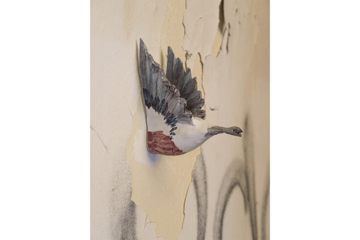 RB: È vero. Con questa violenza ho cercato di confrontarmi: i piranha, ad esempio, non li ho mai più esposti, anche se mi sono stati chiesti. Ho capito che non era quello che mi interessava. Parlare attraverso gli animali e le loro forme, però, mi permette di saltare un passaggio. Il rapporto è forzatamente impari. In qualche modo stiamo già sempre parlando di violenza, di paura, anche se magari questi elementi non sono espliciti. C’è una relazione sbilanciata, ancestrale, ecologica, metaforica – anche nel fatto che li rendiamo simbolo. Gli uccelli, ad esempio, mi permettono di parlare delle folle come stormi. Ma questi uccelli di ceramica che attraversano i muri, se tu li guardi come singolo oggetto sono innocui, teneri, puoi tenerli in una mano: c’è una ambiguità potentissima, che poi è tutto ciò di cui voglio parlare.
