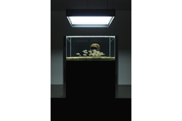 RB: Esatto. Lì ho anche conosciuto Marta, la mia compagna, e a Bologna sono arrivata seguendo lei. Di nuovo per un caso fortuito, nel frattempo ero stata chiamata per la mostra “That’s it”, al MAMbo, per cui Lorenzo Balbi aveva fatto una selezione di artisti nati negli anni Ottanta. Lì esponevo un’opera che aveva bisogno della mia manutenzione: una vasca di piranha che nuotano intorno al calco in argilla di un passamontagna, intitolato Us (Self Portrait) (2018). Non volevo che fosse lo staff del museo a dover immergere le mani e cambiare l’acqua.