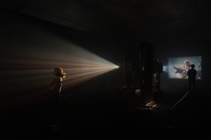 Il pubblico attraversa un labirinto semibuio, illuminato da proiettori analogici 35mm che diffondono un flusso continuo di frammenti di Amores Perros assemblati per la prima volta. Un paesaggio sonoro, concepito appositamente per l’installazione, è diffuso in tutto lo spazio creando un’atmosfera onirica. Ciak, graffi sulla pellicola e lampi di luce tra bobine interrompono lo scorrere delle immagini, ricordando la ruvida fisicità del supporto. Nell’era dell’intelligenza artificiale e dell’iperdigitalizzazione, Iñárritu invita il pubblico a entrare in un luogo della memoria tattile, analogico e creato dall’essere umano, in cui il passato “lampeggia” senza farsi afferrare.