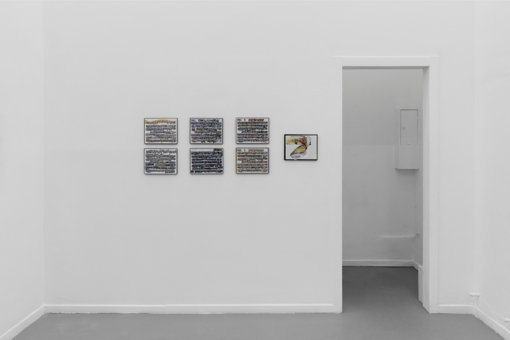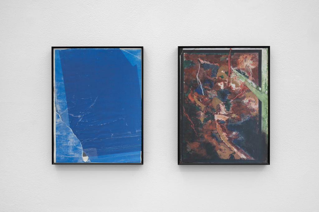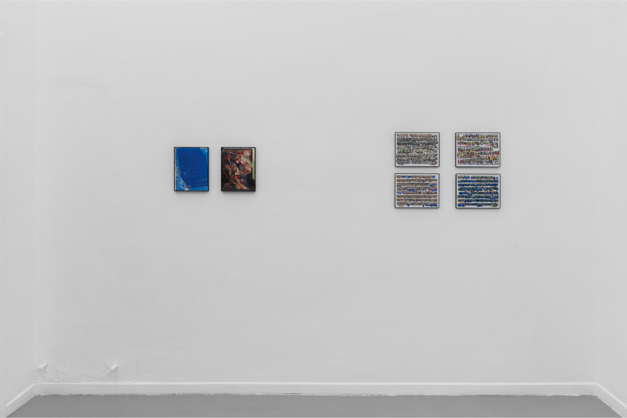 Mi sedevo e segnavo le immagini stampate, cercando di coprire ogni paio di occhi e lasciando che il ritmo interiore di questa azione realizzasse l’opera. C’è anche un monocromo blu che ho realizzato con la mia stampante, un’immagine distrutta di Greta Garbo capovolta su un lato e un’opera su carta da ricevuta.
