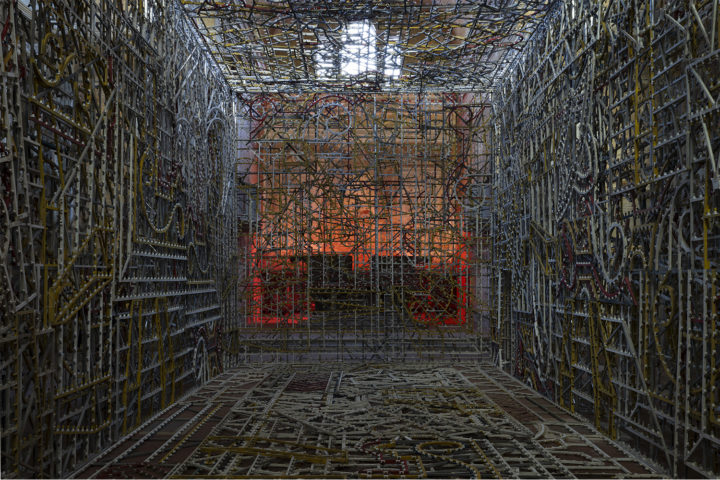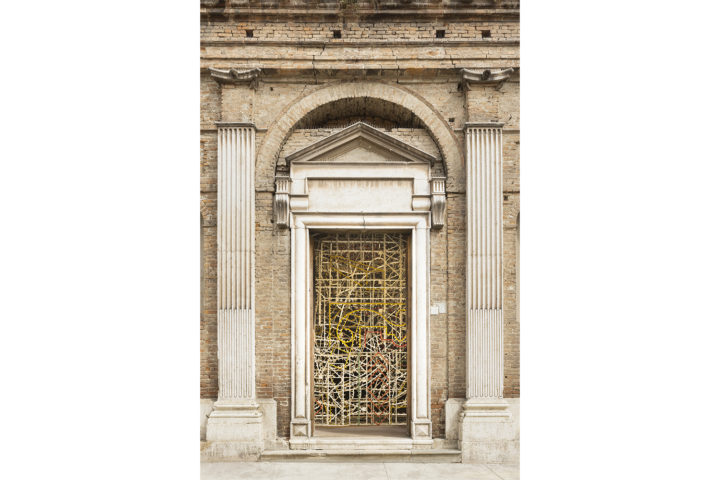 All’ingresso, una grande luminaria spenta costruisce un corpo architettonico fatto di geometrie modulari. È la seconda volta che Bartolini lavora con le luminarie siciliane, mostrate nella loro condizione dormiente: priva di luce, ridotta a un’inte- laiatura essenziale. Queste luminarie tradizionali del Sud Italia, usate per le feste religiose e civili, realizzano così installate uno spazio diafano, sospeso tra promessa e disillusione, in cui la festa appare congelata, forse già conclusa, o forse ancora da iniziare.