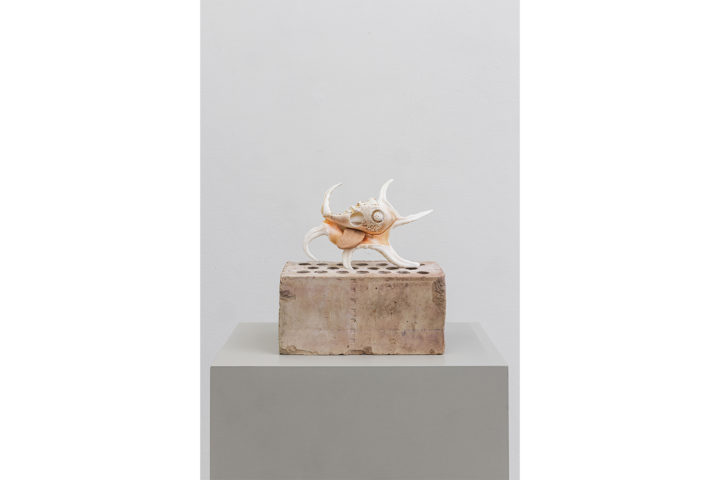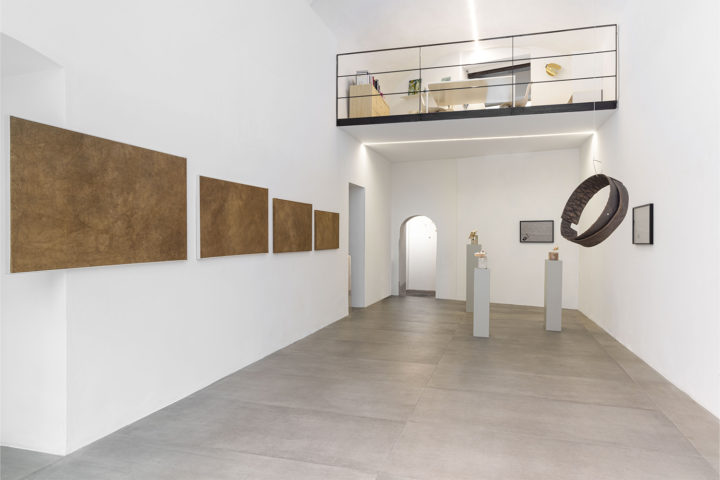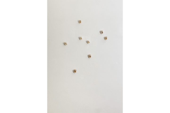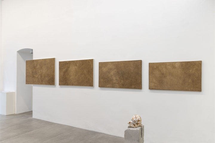 Raphael Danke presenta una selezione di sculture della serie Molusce, iniziata nel 2021, in cui le conchiglie vengono trasformate in maschere antropomorfe tramite forature che ne rivelano la struttura interna. Montate su blocchi di cemento e materiali di recupero – legno e ferro provenienti dalla costruzione dell’abitazione dell’artista – queste sculture evocano una tensione tra naturale e artificiale, fragilità e permanenza. In mostra anche una nuova serie di tele dipinte con pigmenti naturali raccolti in Provenza – noci, cortecce, edera – realizzate nei formati standard degli schermi televisivi. Attraverso questi monocromi, Danke trasforma i non-luoghi architettonici (come lo spazio che solitamente si destina alla TV) in intervalli di contemplazione e meditazione. La mostra include, infine, una selezione di opere della serie in edizione aperta Die Geister des Gartens: piccole conchiglie di lumaca raccolte nel giardino dell’artista, intitolate Ghost, sparse sulle pareti della galleria nel tentativo di rendere l’architettura viva, richiamando la materialità dei gusci.