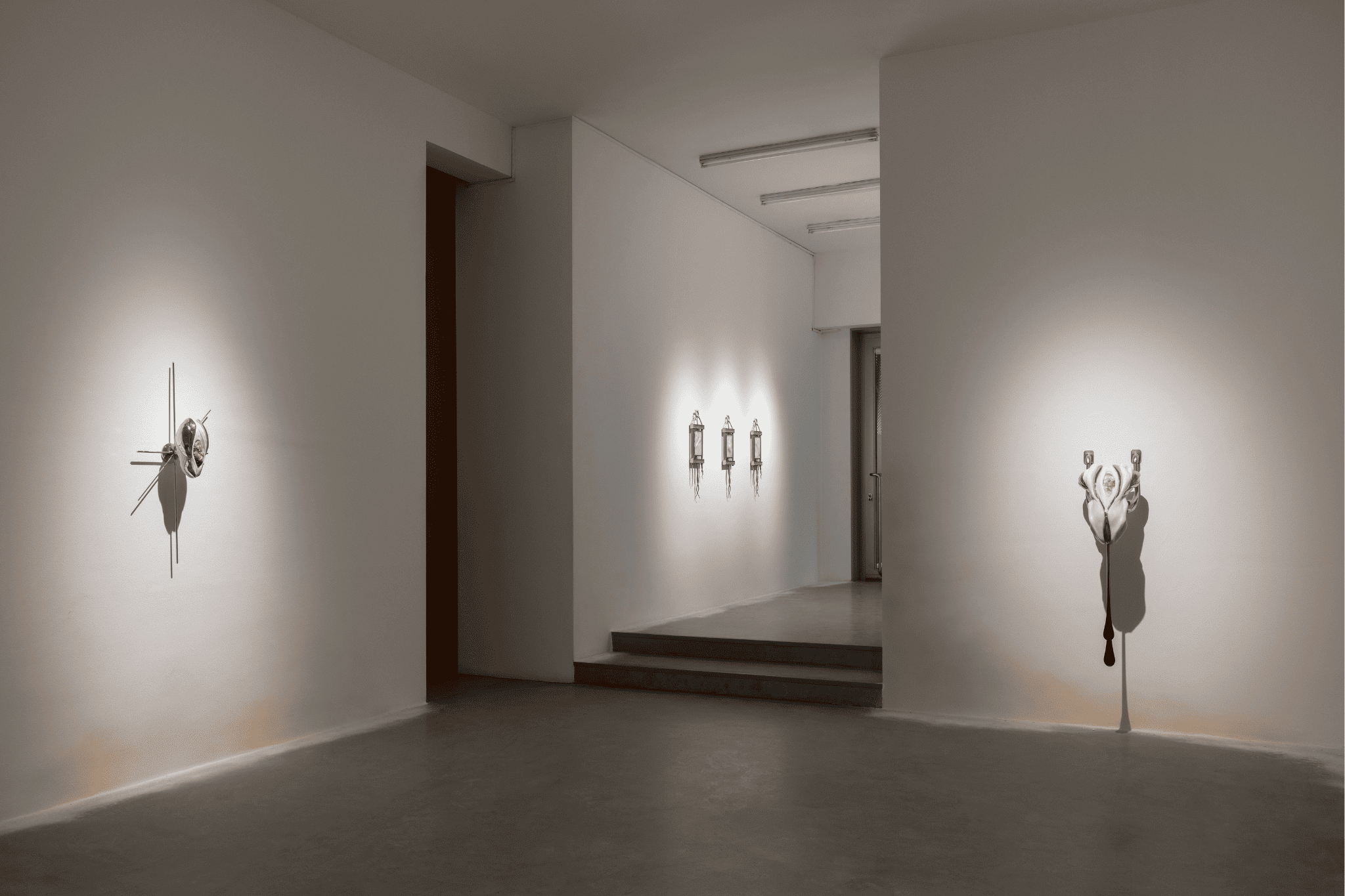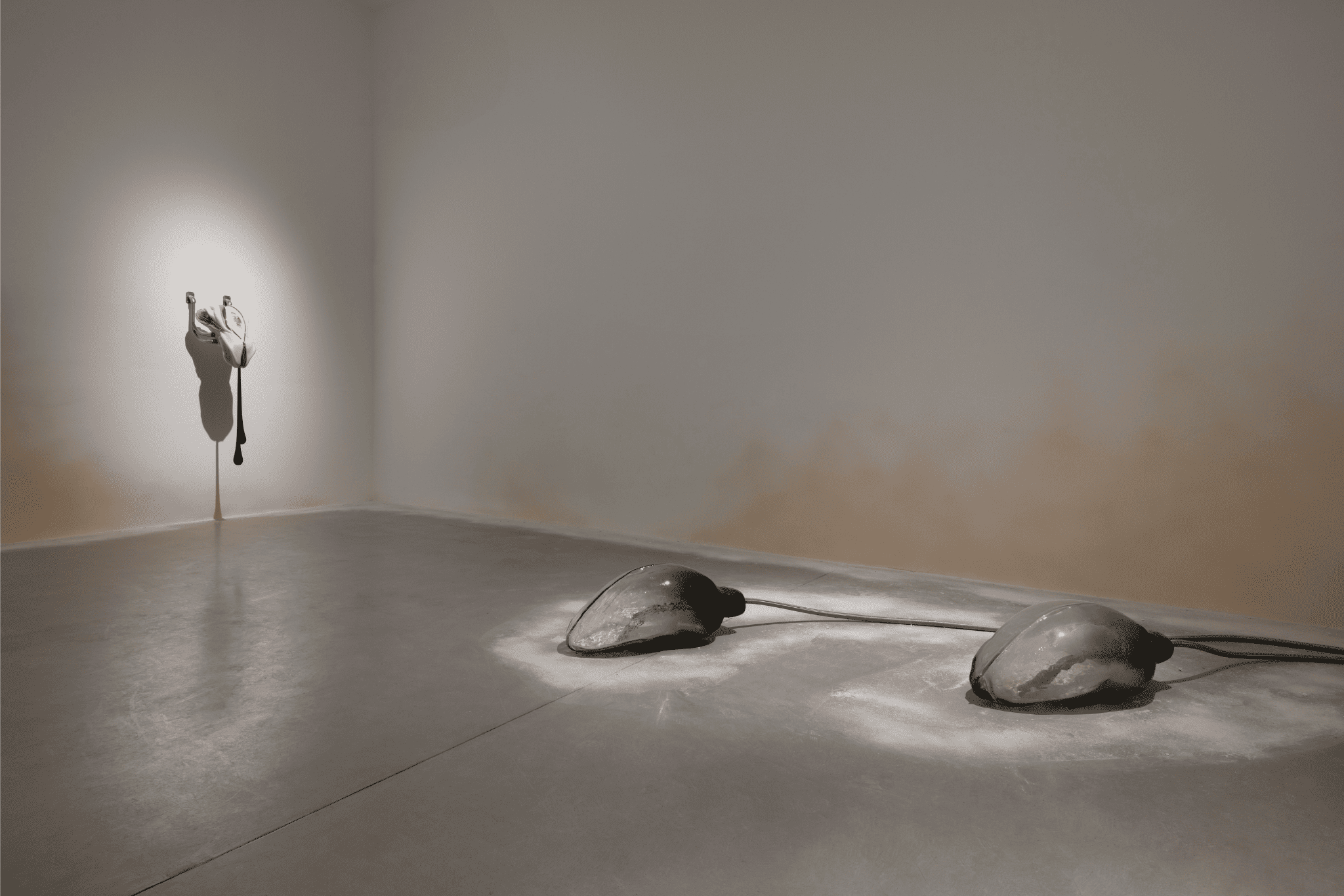Ivana Bašić opera secondo un linguaggio plastico eterogeneo, le sostanze raggiungono i propri limiti, tentano di emanciparsi dalle loro stesse forme a tal punto da configurare una nuova materialità. Elementi fragili come cera, silicone, vetro soffiato e pittura a olio convivono con la violenza intrinseca del metallo, assumendo connotazioni inedite. La pietra sembra carne, il vetro evoca il respiro, la cera muta in marmo, l’acciaio inossidabile – immobile e imperturbabile di fronte allo scorrere del tempo – diviene osso che trafigge e sorregge corpi precari. Un’antitesi che traduce la ferita inferta dal collasso della Jugoslavia – paese originario dell’artista – in una consapevolezza traumatica, un dolore e una tensione alla dissoluzione non intesa come perdita ma momento di potenziale radicale.
