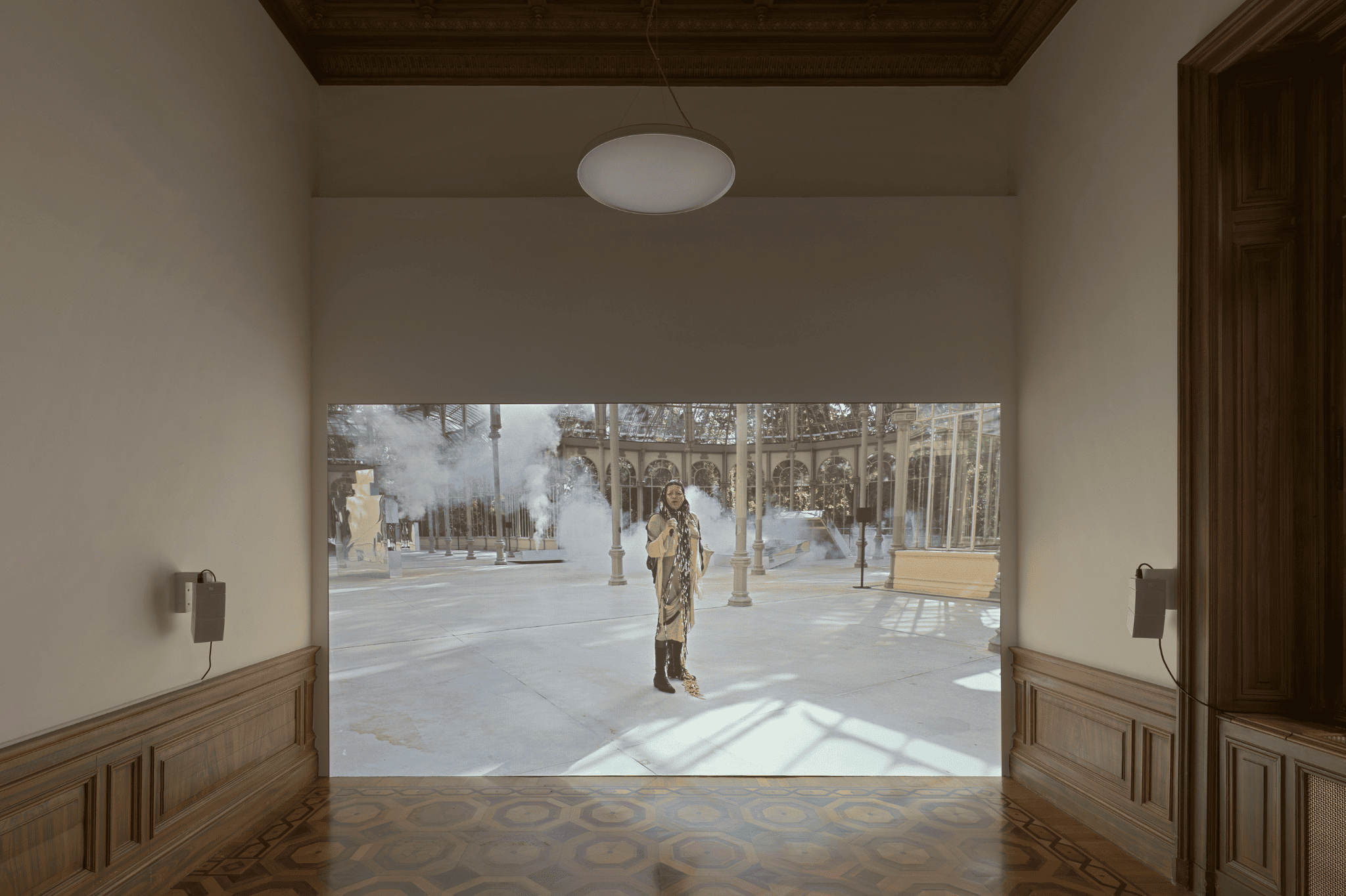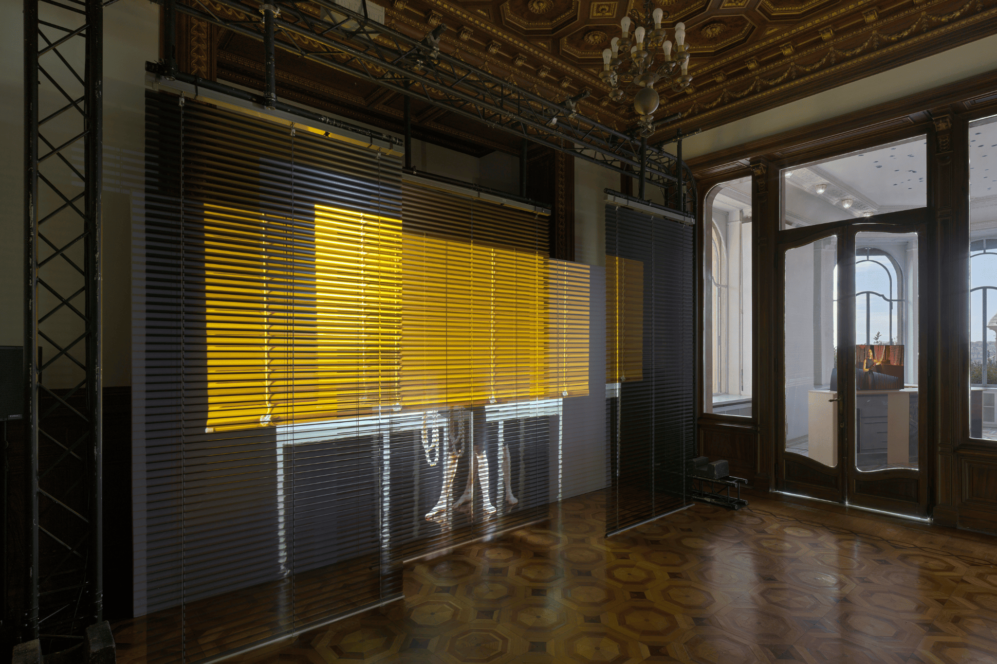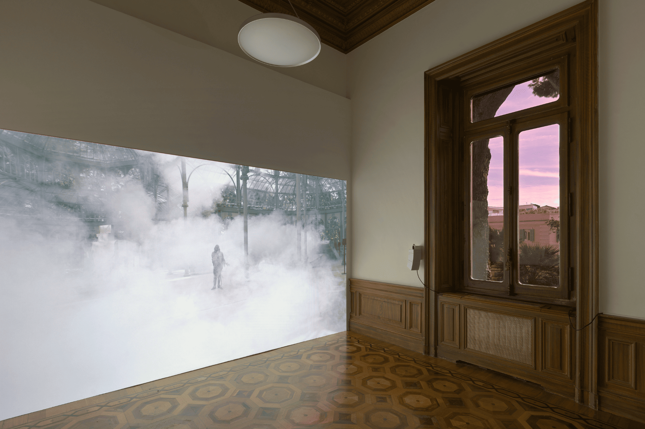 Nelle opere in mostra, la voce diventa un mezzo per far emergere passati dimenticati, echeggiando nelle sale della villa e evocando altri luoghi attraverso il canto. La danza si fa strumento programmatico per guidare un movimento di corpi collettivo. L’architettura della villa sembra muoversi a sua volta, partecipando alla composizione con una sequenza di gesti che sfruttano l’opposizione tra luce e buio, suono e silenzio, pausa e movimento. La grande coreografia che ne consegue sembra porci una domanda: muoversi fianco a fianco, in concerto, può connettersi allo stesso tempo alla disillusione politica e all’aspirazione utopica?