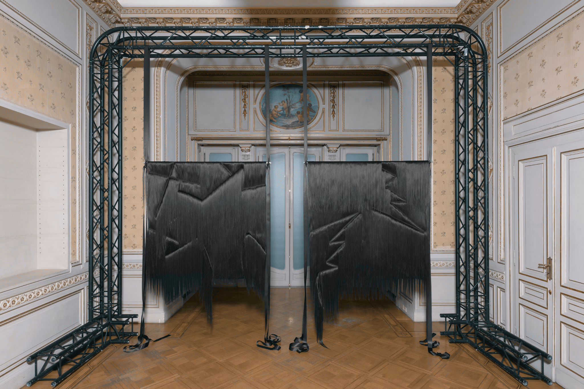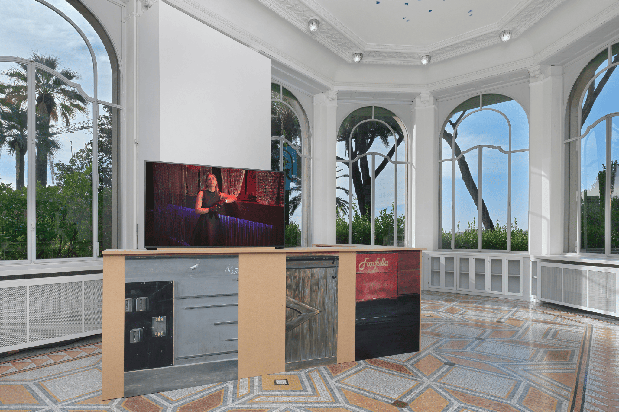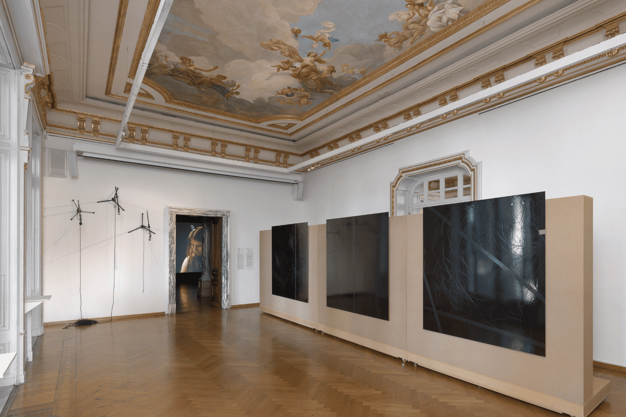 Nelle opere in mostra, la voce diventa un mezzo per far emergere passati dimenticati, echeggiando nelle sale della villa e evocando altri luoghi attraverso il canto. La danza si fa strumento programmatico per guidare un movimento di corpi collettivo. L’architettura della villa sembra muoversi a sua volta, partecipando alla composizione con una sequenza di gesti che sfruttano l’opposizione tra luce e buio, suono e silenzio, pausa e movimento. La grande coreografia che ne consegue sembra porci una domanda: muoversi fianco a fianco, in concerto, può connettersi allo stesso tempo alla disillusione politica e all’aspirazione utopica?