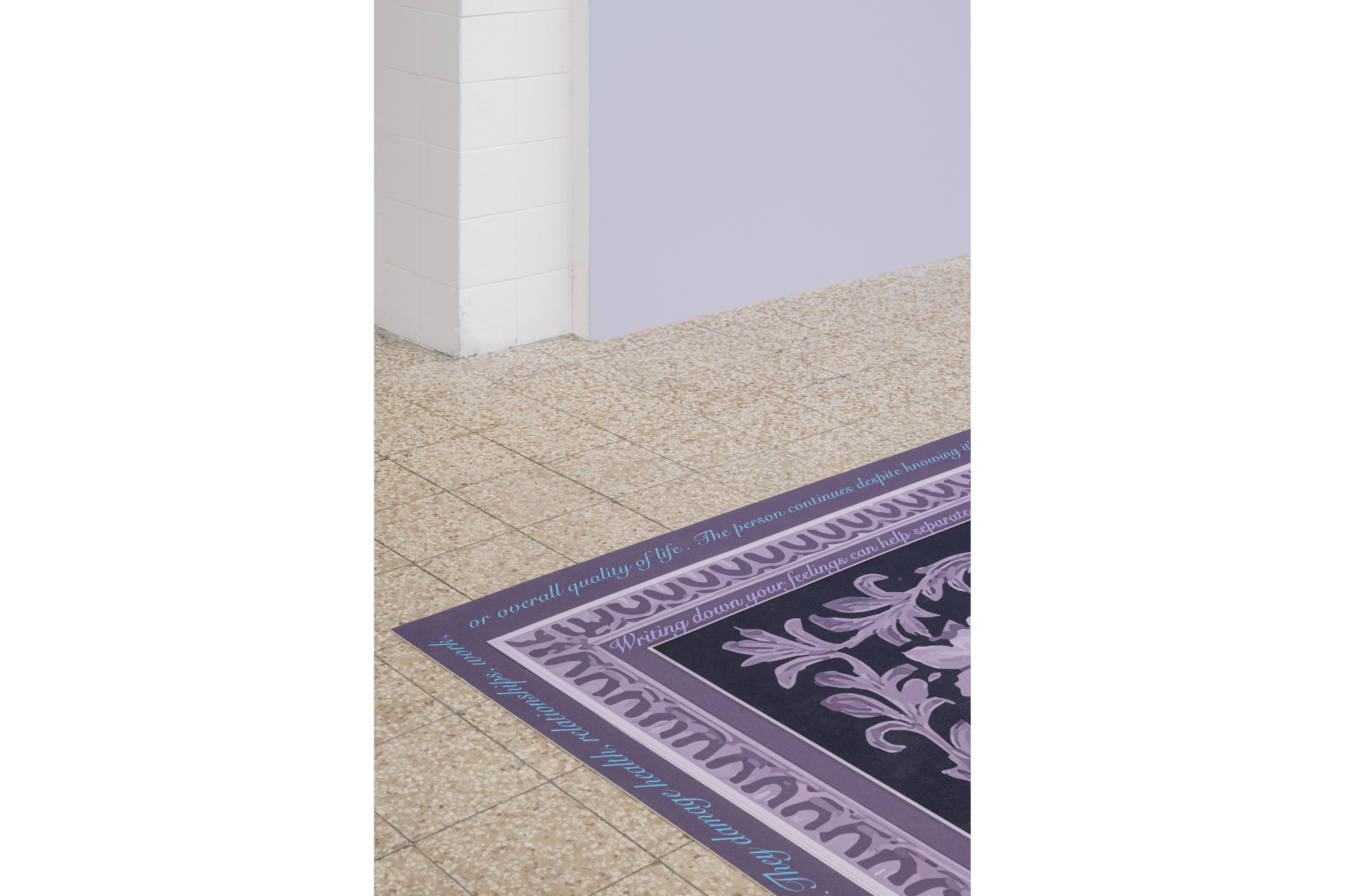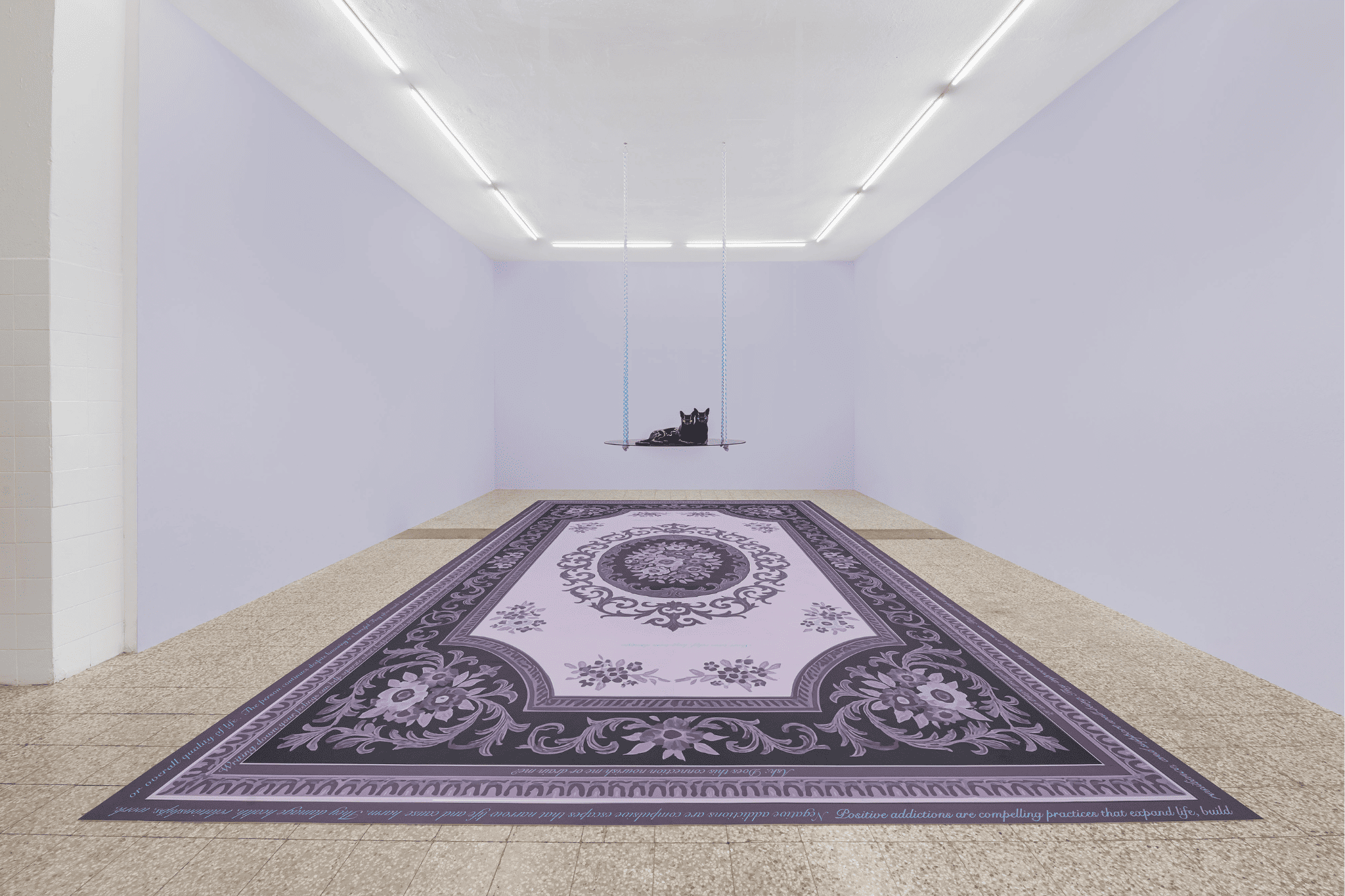 A metà tra le profezie di un antico oracolo e i suggerimenti di un vocal coach trovati online, le frasi sono stampate su un enorme fondale a terra, la copia della copia di un tappeto d’ispirazione neoclassica e tardo barocca, tipica di una estetica kitsch che non teme l’eccesso.