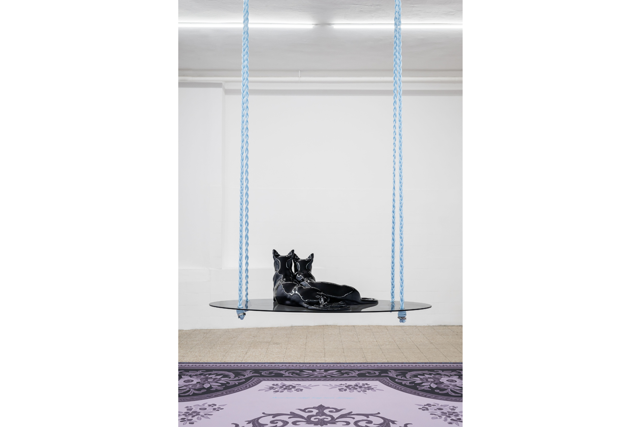 Imponenti come due maestose sfingi, le due gatte-streghe, simbolo di forza interiore e mistero, siedono abbracciate su un’altalena sospesa, vigilando sugli appunti che hanno accompagnato l’artista nel suo percorso di cura e che oggi sono finalmente rivelati al pubblico.