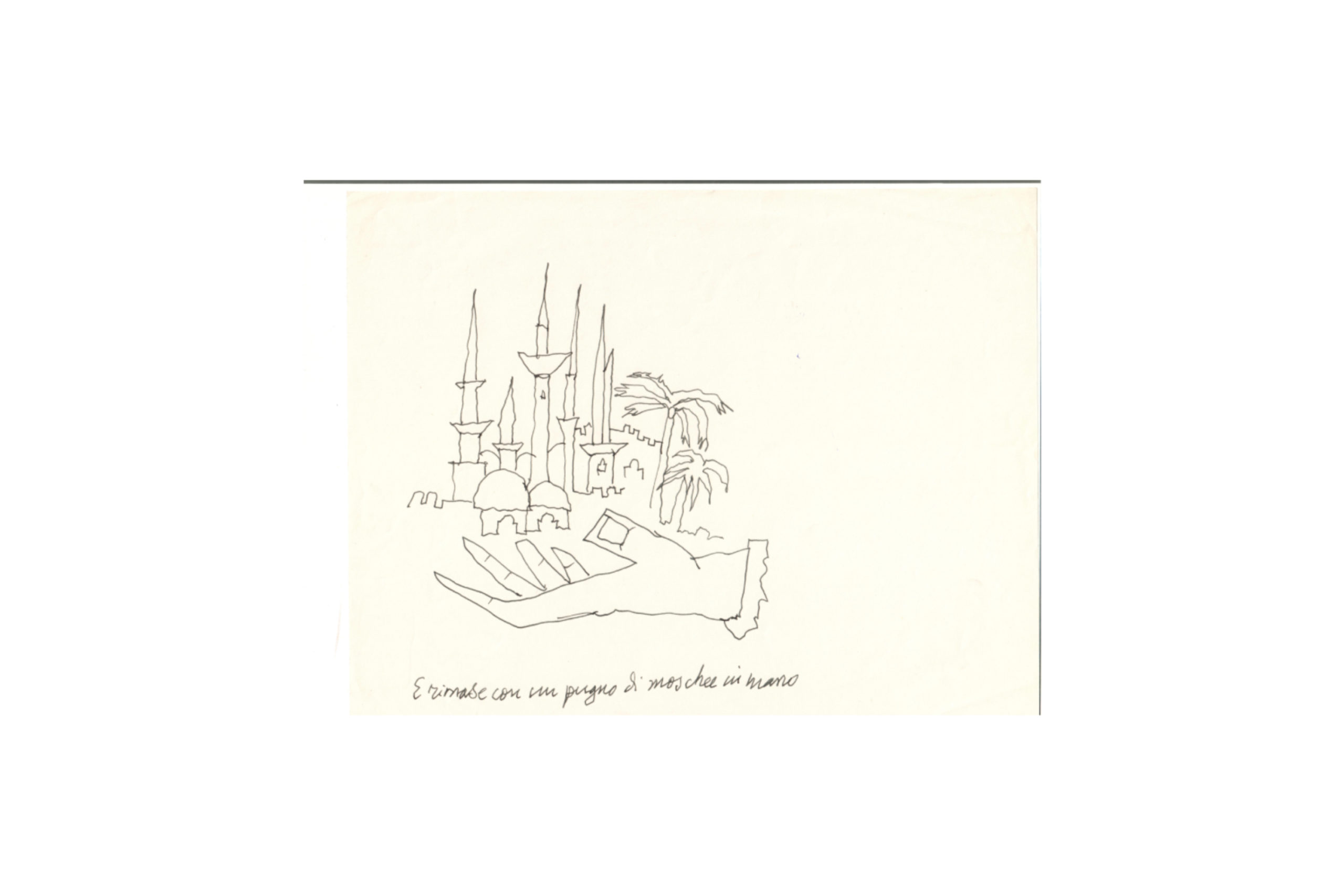 Disegni come Ci sei riuscita a vedermi vecchio!, e E rimase con un pugno di moschee non a caso parlano di un tempo che ha già percorso uno spazio e di uno spazio che ha già depositato del tempo. Sembrano suggerire una temporalità fallimentare che “sempre racconta solo ciò che dimentica”, come incide Vincenzo Agnetti negli stessi anni.