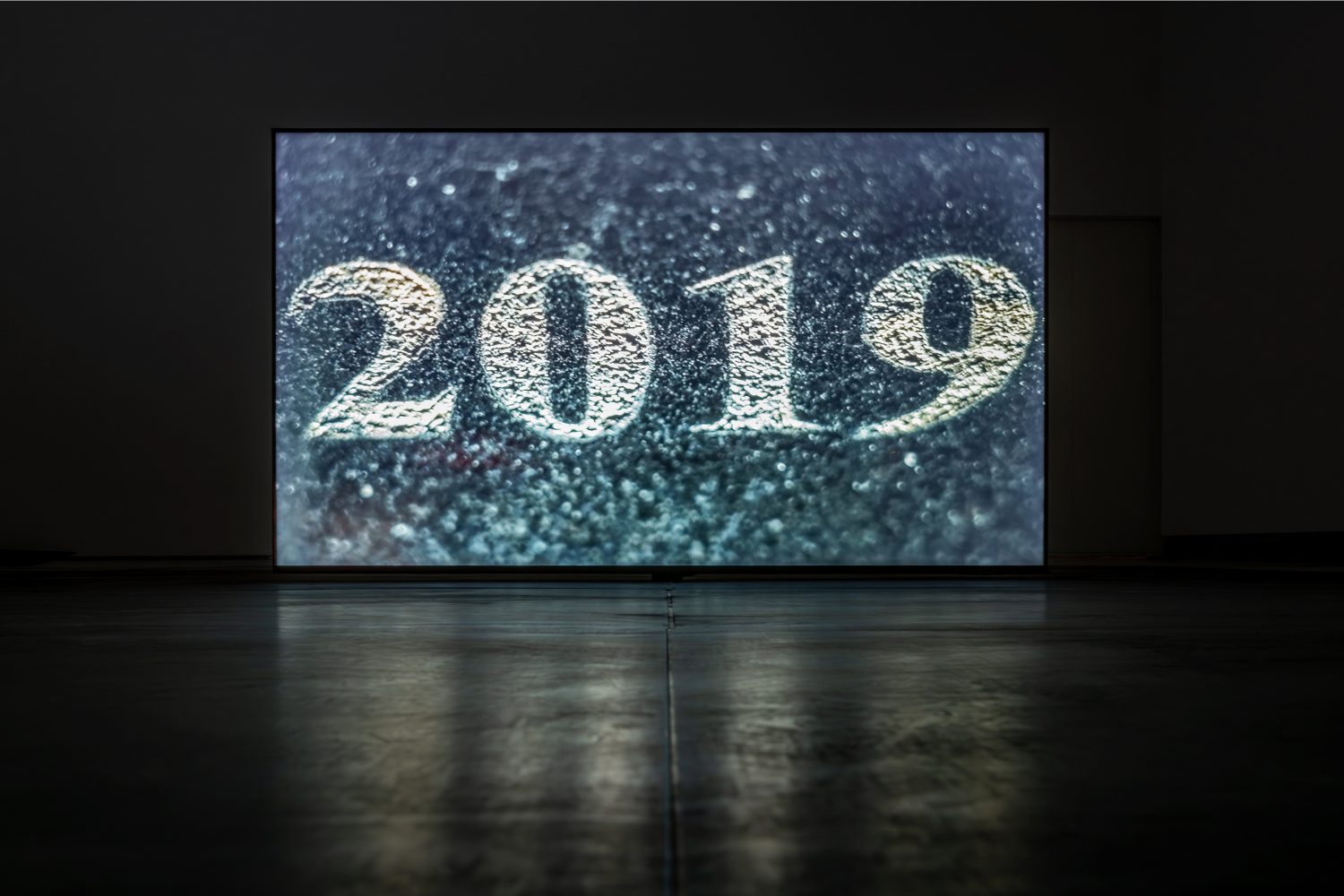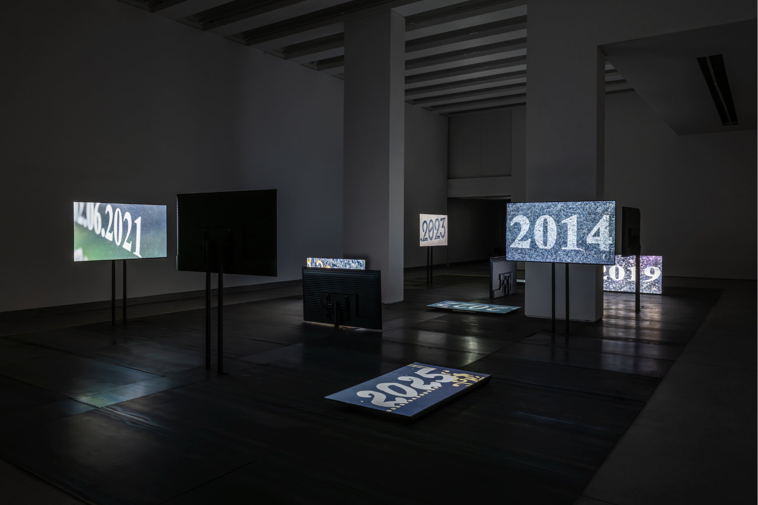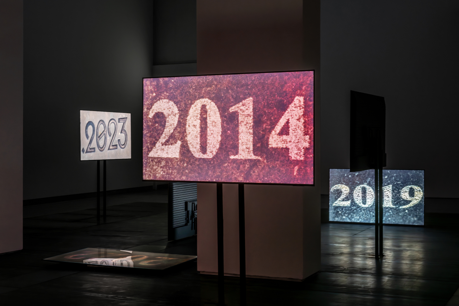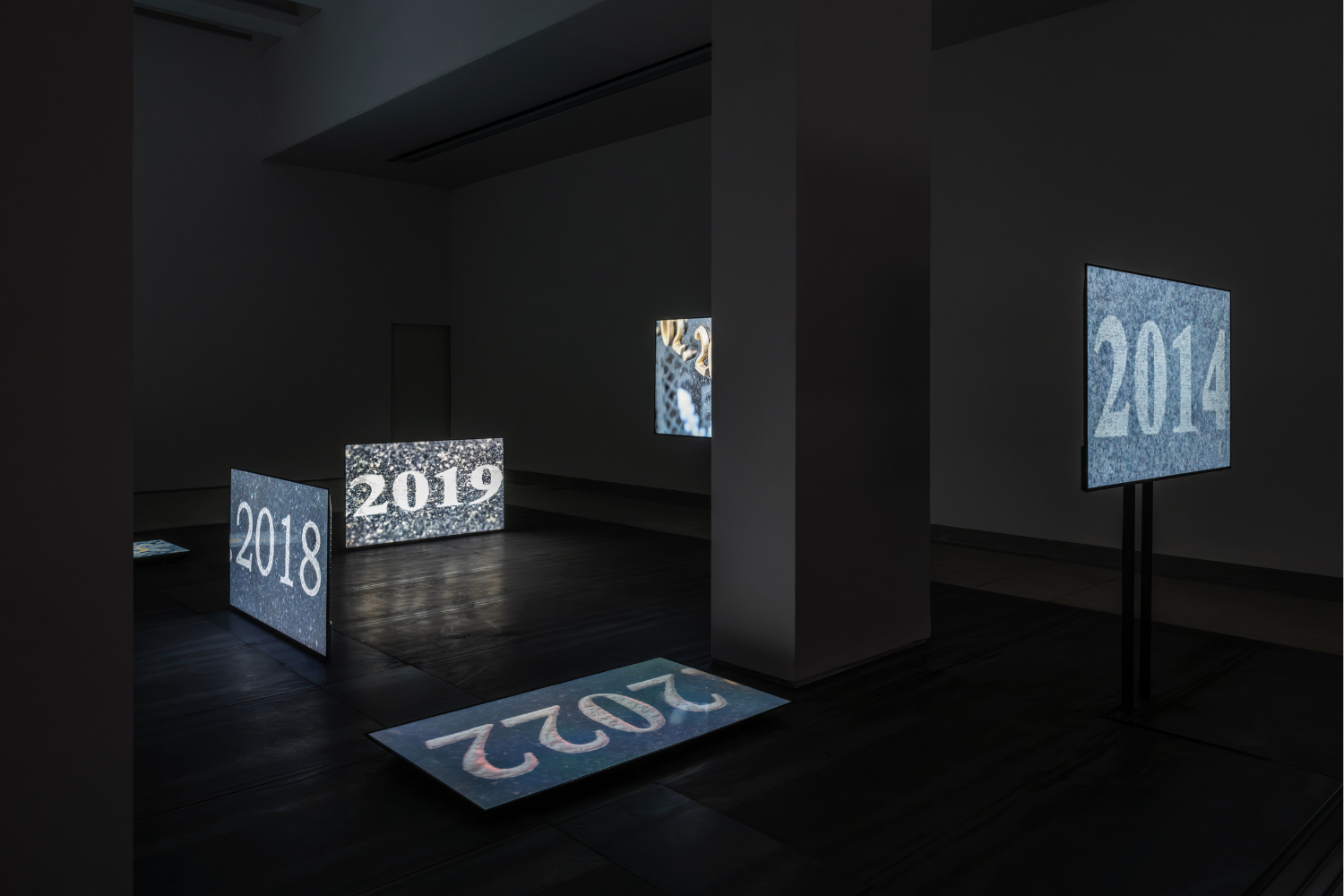L’installazione, di proporzioni monumentali, consiste in una serie di numeri restituiti da grandi schermi piatti: alcuni disposti a terra, altri leggermente sollevati, tutti montati su una piattaforma metallica attraversabile. La superficie riflette la luce degli schermi in una sala volutamente lasciata in penombra. Essendo questi “anni”, come suggerisce il titolo, ripresi attraverso una camera fissa, non è subito chiaro se si debba attendere che qualcosa accada, se ciò che vediamo sia un frammento di pochi secondi o una registrazione protratta per ore. Gli anni indicati stessi diventano così i veri e unici protagonisti delle inquadrature, dalle quali emergono soltanto informazioni circostanziali marginali.