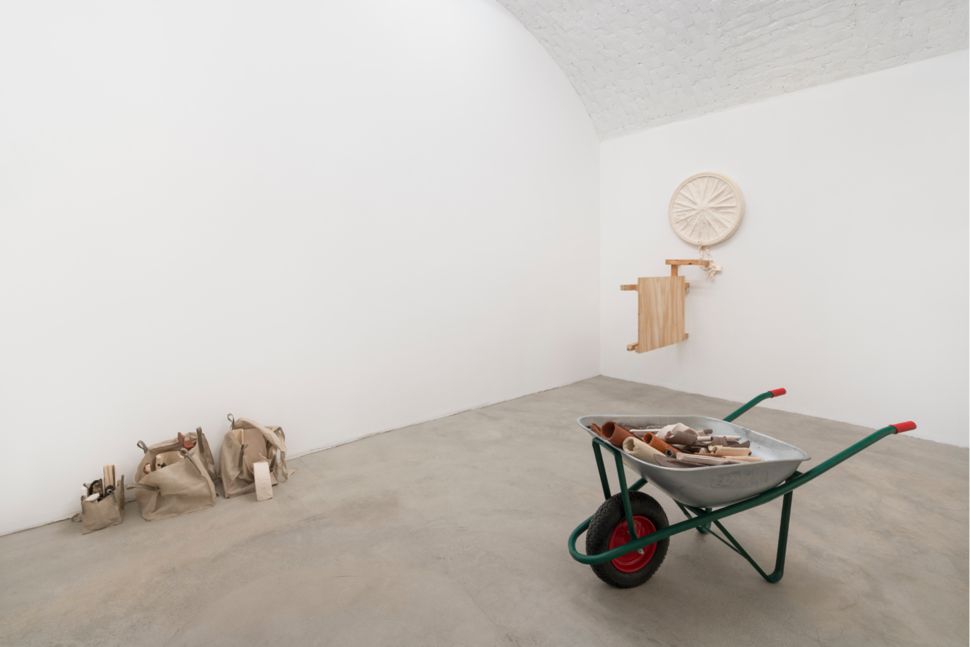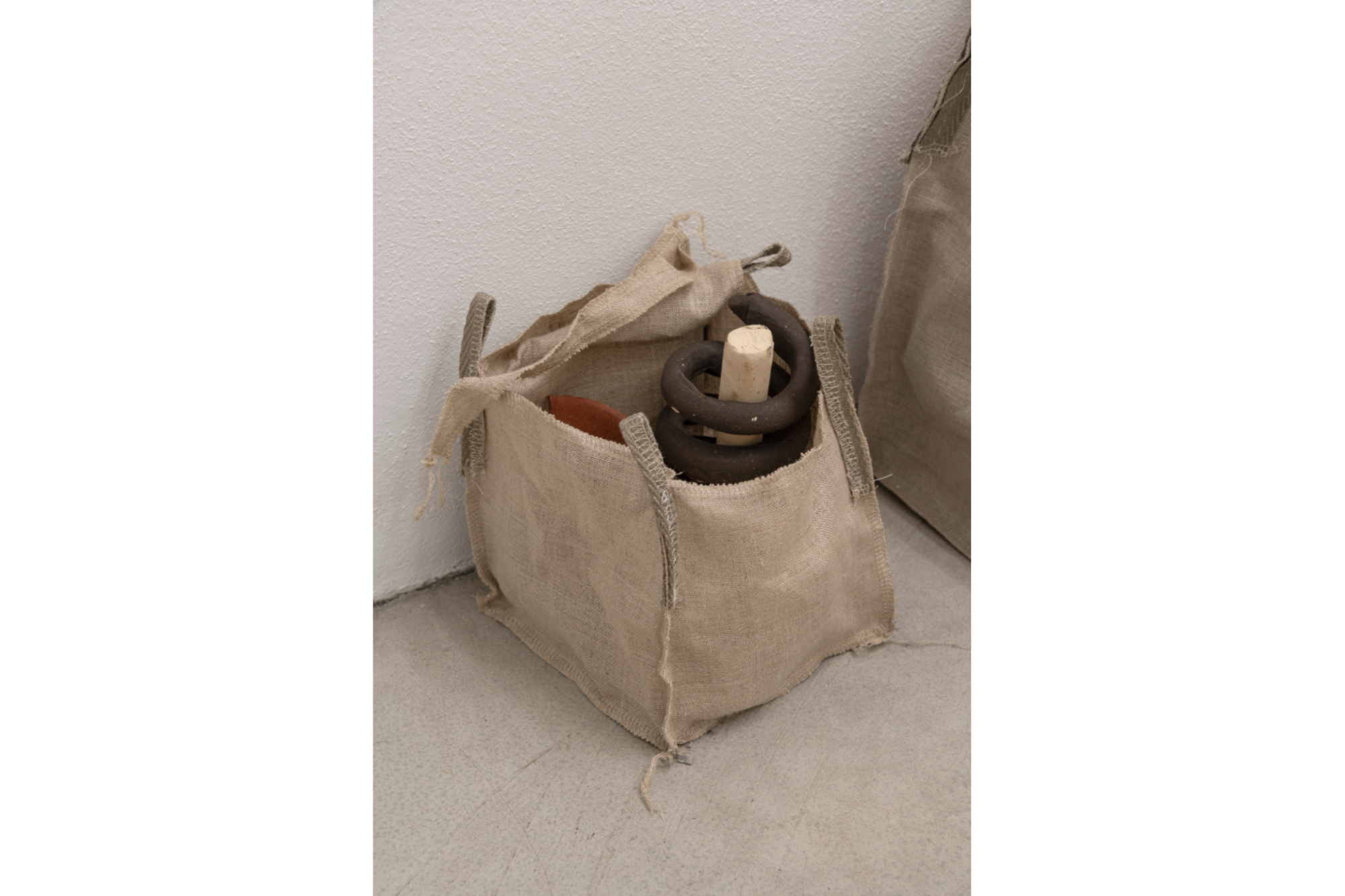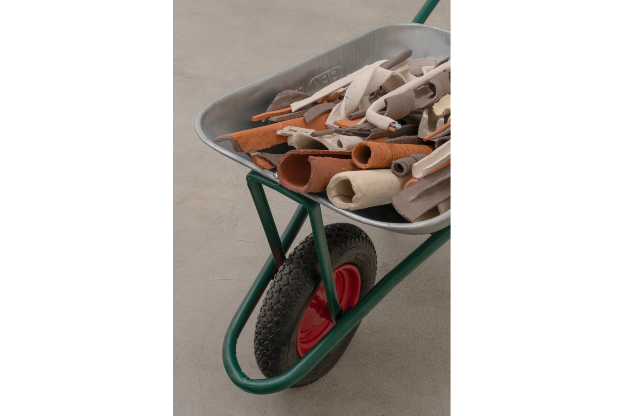 Ma di che città si tratta? Nelle due aree si incontrano, specularmente, sei (tre + tre) buste di lino con dentro quelli che possono sembrare calcinacci o pezzi irregolari di un qualche muro o struttura — Città, città (macerie) (2025) – due (uno + uno) calchi in resina di una ruota di bicicletta su cui si innestano altri pezzi di legno come possibilità di una futura impalcatura – Constructoras de mondo muy parecidos al nuestro (ruota verticale) (2025) e Città, città (ruota) (2025) – e due (una + una) carriole piene di altri cocci rotti, che come le macerie dentro le buste di lino non sono dei ready-made, poiché si tratta di sculture di ceramica, acciaio e gomma di pneumatico – Città, città (carriola) (2025) e Città, città (carriola quattrocchi) (2025).