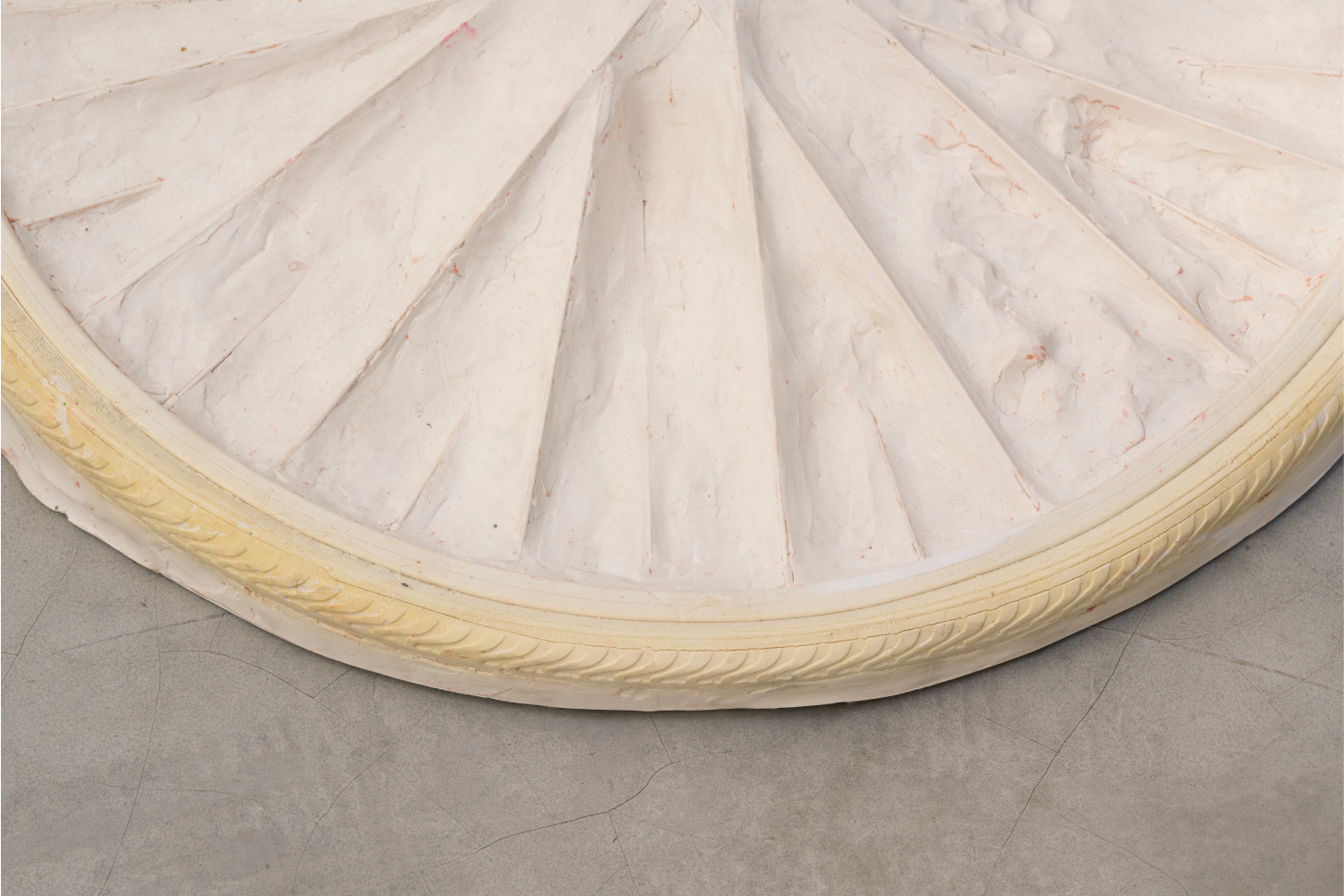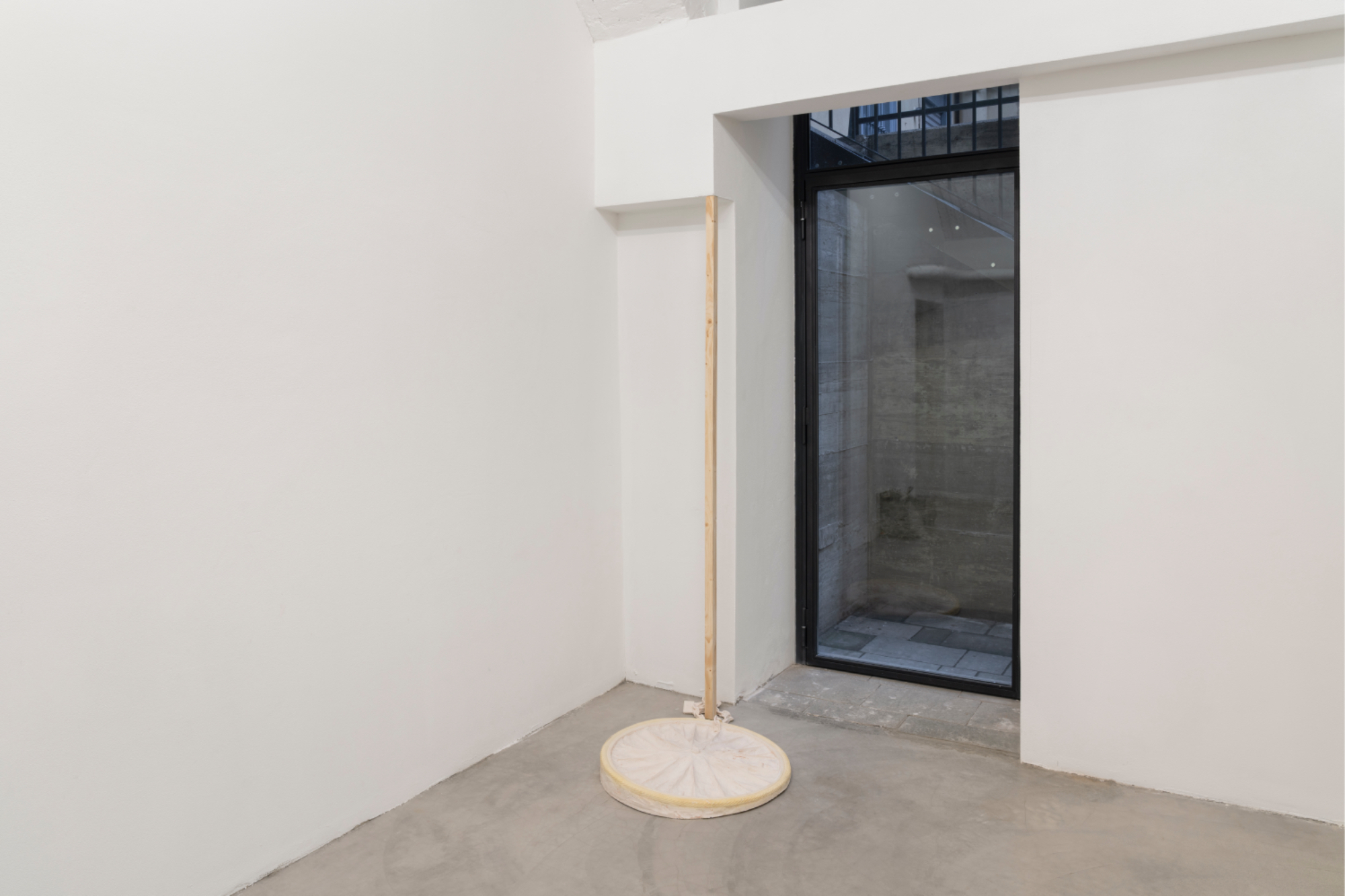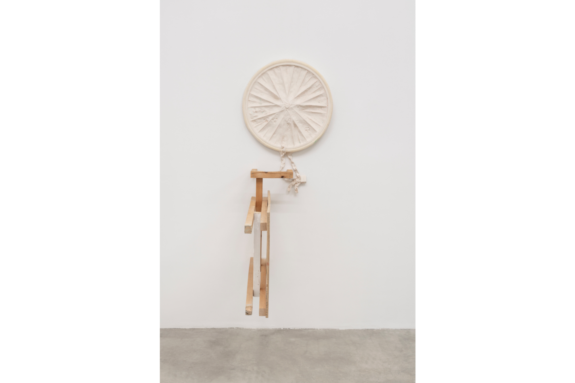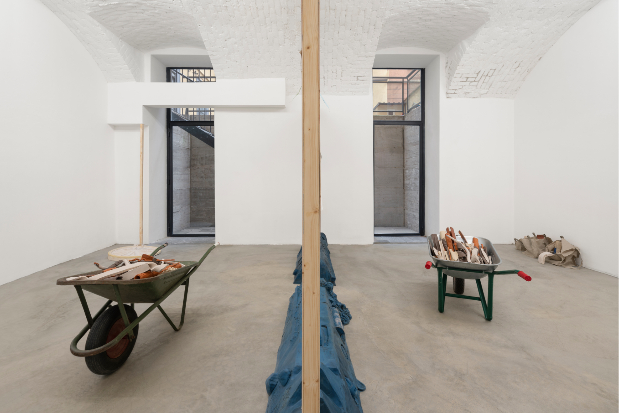 Ma di che città si tratta? Nelle due aree si incontrano, specularmente, sei (tre + tre) buste di lino con dentro quelli che possono sembrare calcinacci o pezzi irregolari di un qualche muro o struttura — Città, città (macerie) (2025) – due (uno + uno) calchi in resina di una ruota di bicicletta su cui si innestano altri pezzi di legno come possibilità di una futura impalcatura – Constructoras de mondo muy parecidos al nuestro (ruota verticale) (2025) e Città, città (ruota) (2025) – e due (una + una) carriole piene di altri cocci rotti, che come le macerie dentro le buste di lino non sono dei ready-made, poiché si tratta di sculture di ceramica, acciaio e gomma di pneumatico – Città, città (carriola) (2025) e Città, città (carriola quattrocchi) (2025).