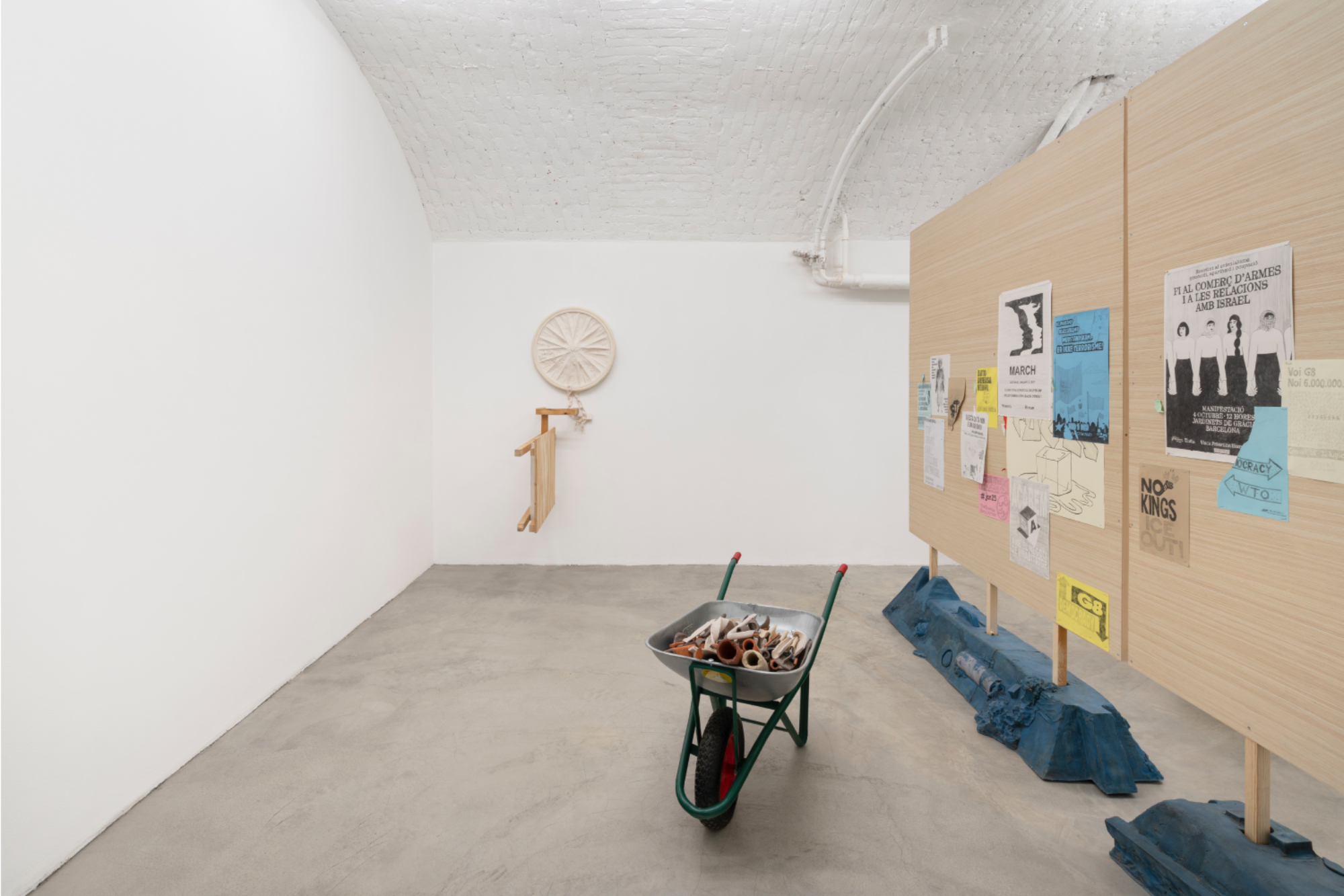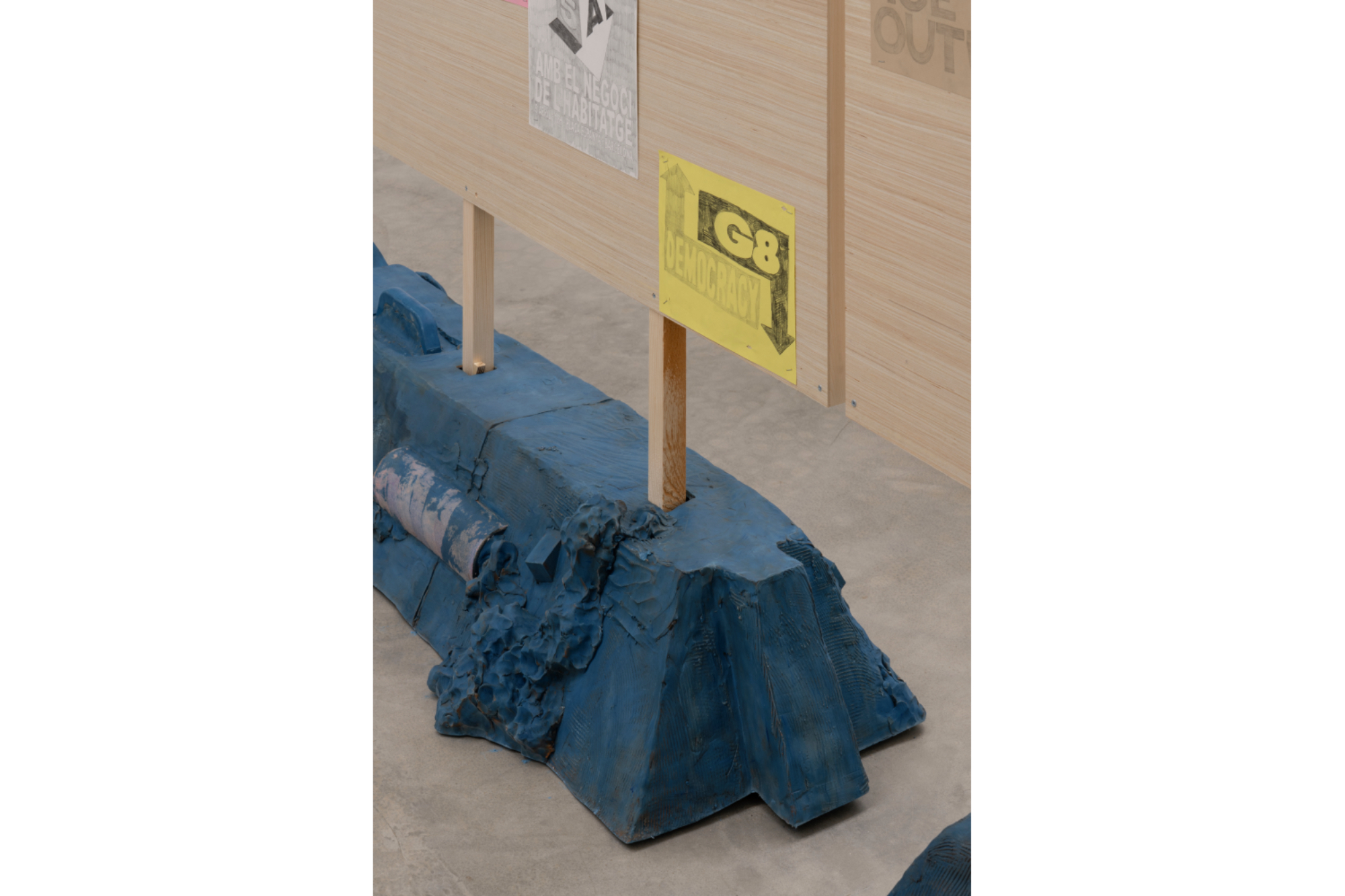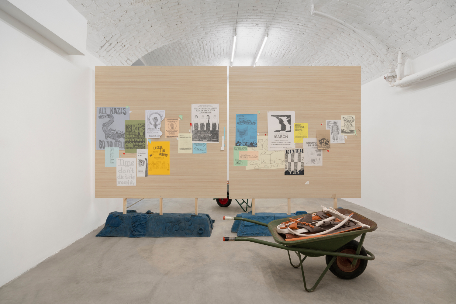 C’è molta ‘prendibilità’ nelle opere di Carbotta: le buste di macerie sono pronte per essere prese e portate via; i manici delle carriole invitano allo spostamento, i calchi delle ruote di bicicletta e le strutture in legno lasciano immaginare possibili sviluppi costruttivi, nuove rimesse in moto del cantiere; i manifesti sulle pareti temporanee potrebbero essere staccati, integrati, modificati. Si stratta di avvisi di manifestazioni, proteste e lotte diverse e comunque legate, ai lati opposti del blocco temporaneo al centro dello spazio. Non si vedono ma condividono l’urgenza di un agire, seppur in contesti diversi, per ribaltare collettivamente la solitudine urbana e decostruirne il carattere inevitabile di destino. I residui di “Città, città” lasciano intuire questa possibilità generale, aprendo la strada a una pratica di militanza minima, sottile e affettiva, che opera tanto nell’immaginazione quanto nella prassi quotidiana in nome di una rinnovata tattilità del corpo urbano, ora sfrangiato in un corpo di possibilità.