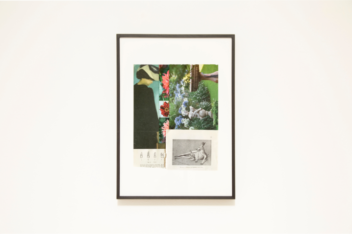 Alle pareti, una nuova produzione di collage, in cui ritagli di immagini si sovrappongono completamente a fotografie tratte dall’archivio di famiglia dell’artista, che vengono nascoste allo sguardo. I titoli dei lavori — come Mom holding the bouquet & wearing her wedding dress, sitting on a staircase with a sad gaze (2025) — descrivono la scena celata, rendendo il linguaggio un veicolo di memoria e perdita. Col tempo, il contatto diretto tra collage e vetro porterà il materiale a deteriorarsi, rivelando solo allora l’immagine nascosta: un lento processo di disvelamento e distruzione che interroga la natura stessa del ricordo.