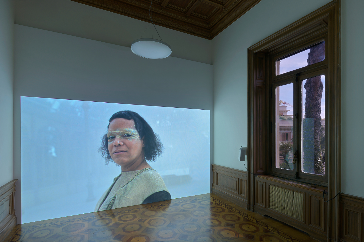 La mostra ha inizio con una sorta di chiusura. La grande sala d’entrata è infatti attraversata da un muro provvisorio dove sono allestiti tre Dancefloor Pieces (2025) che sono anche tre ritratti di alcune delle protagoniste dei video esposti: Dancefloor Piece (Portrait of Werner Hirsch); Dancefloor Piece (Portrait of Jules Cunningham); Dancefloor Piece (Portrait of Daniella Gallegos). Una sorta di cortocircuito tra verticale (parete) e orizzontale (porzioni di pavimenti/palchi), tra l’inizio e la fine del percorso espositivo. Un percorso che le artiste hanno studiato attentamente temporizzando le videoinstallazioni collocate in tre sale, dando la possibilità di una visione completa di ogni singolo lavoro. Dopo (No) Time (2020), in cui elementi scenici e sonori dentro e fuori dal video dialogano con coreografie ritmiche diverse e in cui corpi, adornati da elementi tipici utilizzati dalle artiste (come parrucche e catene), rispondono l’un l’altro in un continuo dialogo fatto di dissonanze e rispondenze, si passa a El Cristal Es Mi Piel (Glass Is My Skin, 2025). Qui la performer venezuelana Aérea Negrot canta all’interno del Palazzo di Cristallo di Madrid (costruito nel 1887 per l’Esposizione Generale delle Filippine), fornendo voce a un corpo fantasmagorico di vetro che si riempie progressivamente di fumo, con elementi specchianti che rinviano alla storia coloniale spagnola come, in mostra, alla stessa Villa Maraini e alle sue finestre, da cui si vede il giardino che la circonda.