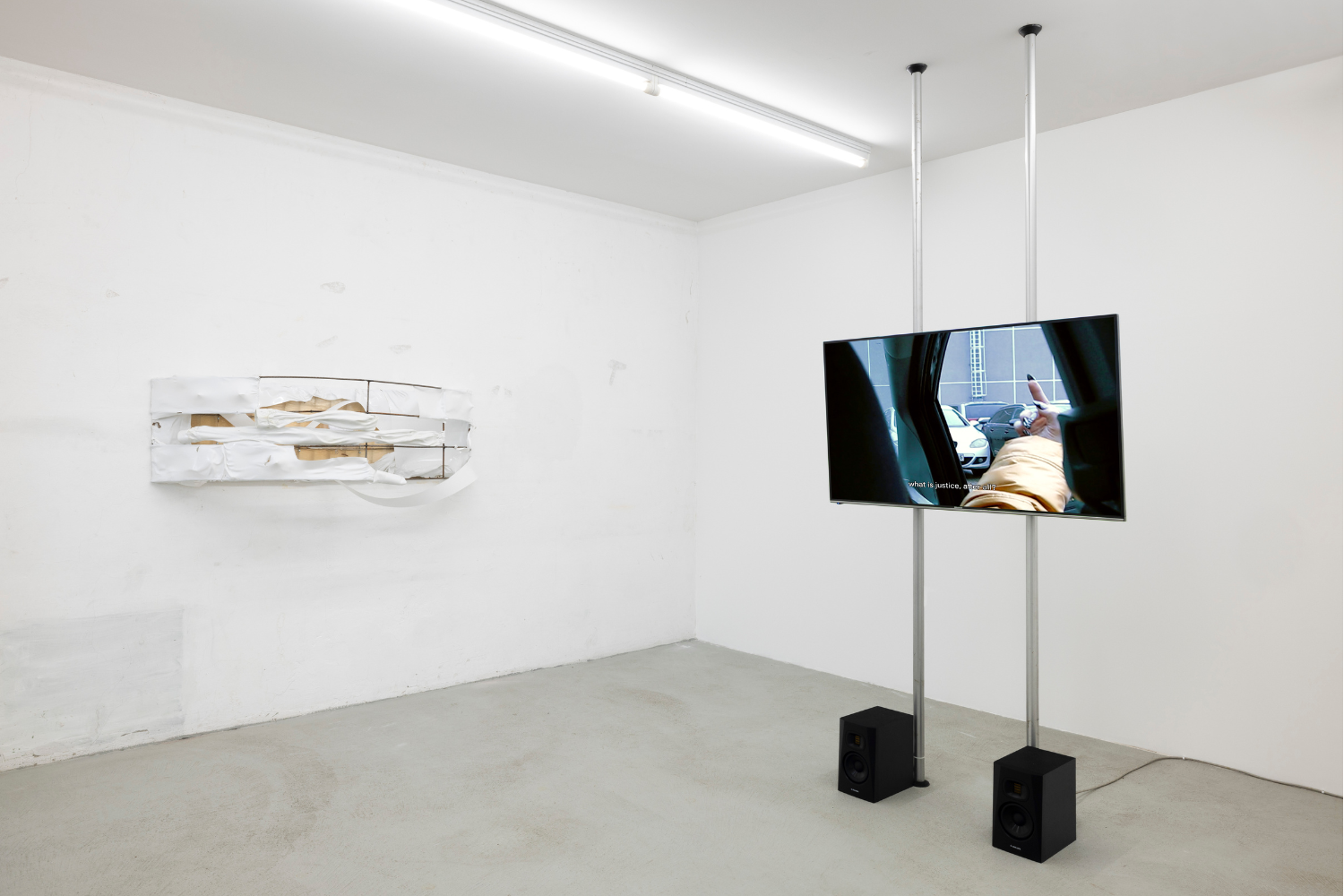 A Light Bulb and a Chestnut e A Sock (2025) sono due sculture presenti in mostra composte da oggetti assemblati: un segmento di barricata, una lampadina, una castagna raccolta in piazza Daukantas a Vilnius durante una manifestazione di protesta. Attraverso processi di stratificazione e riformulazione semantica, Sosunova trasforma questi oggetti in “reliquie”: tracce effimere, che parlano di un desiderio di cambiamento, insieme necessario e utopico. L’artista così sembra suggerire che molte pratiche apparentemente non religiose — come partecipare a una manifestazione in piazza appunto — possano essere vissute con devozione sacra, rivelando ritualità e significati nascosti anche nelle forme di mobilitazione collettiva.