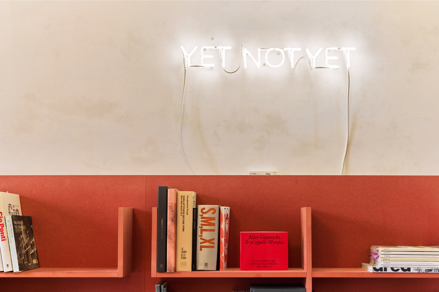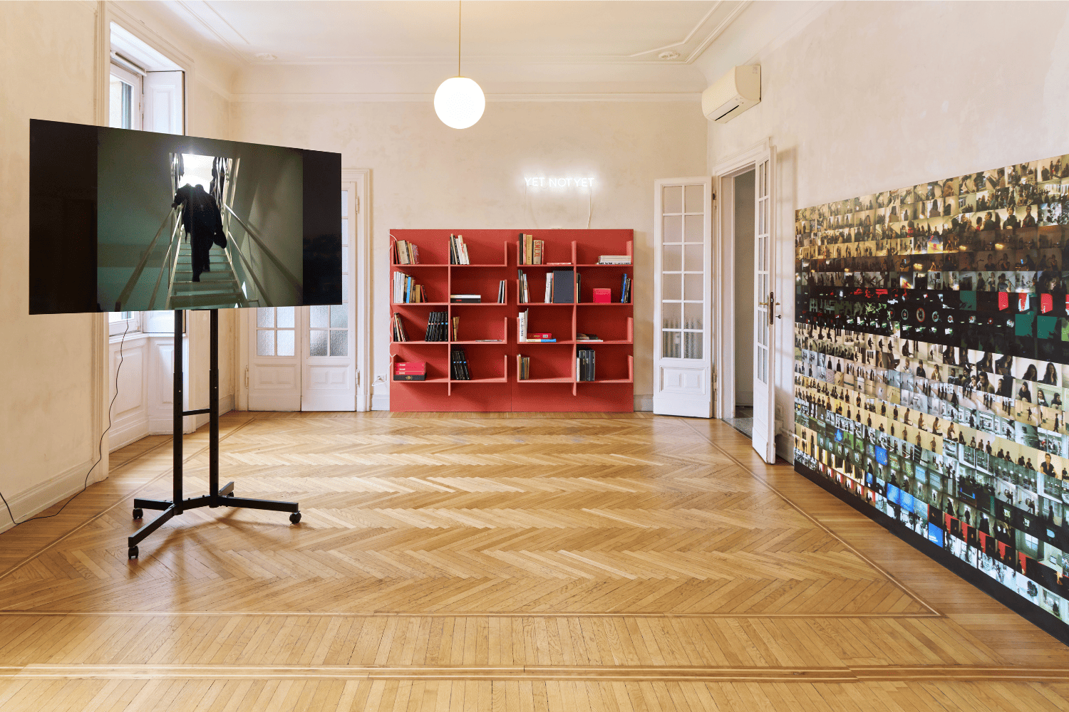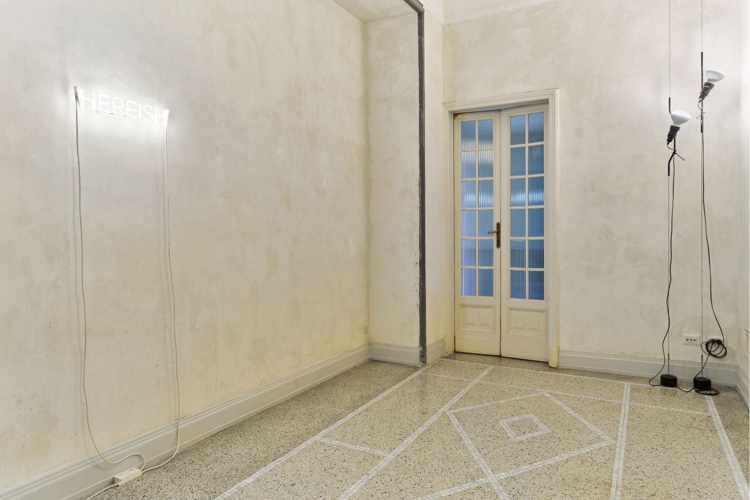 Si capisce come questa sia una mostra in cui, in modi diversi, il passato ritorna nel presente senza nostalgia o celebrazione, piuttosto a ribadire la natura mobile e porosa del tempo. Non a caso nello spazio espositivo compaiono anche due interventi luminosi — hereish e yet not yet — che dialogano con il video intensificandone il significato.