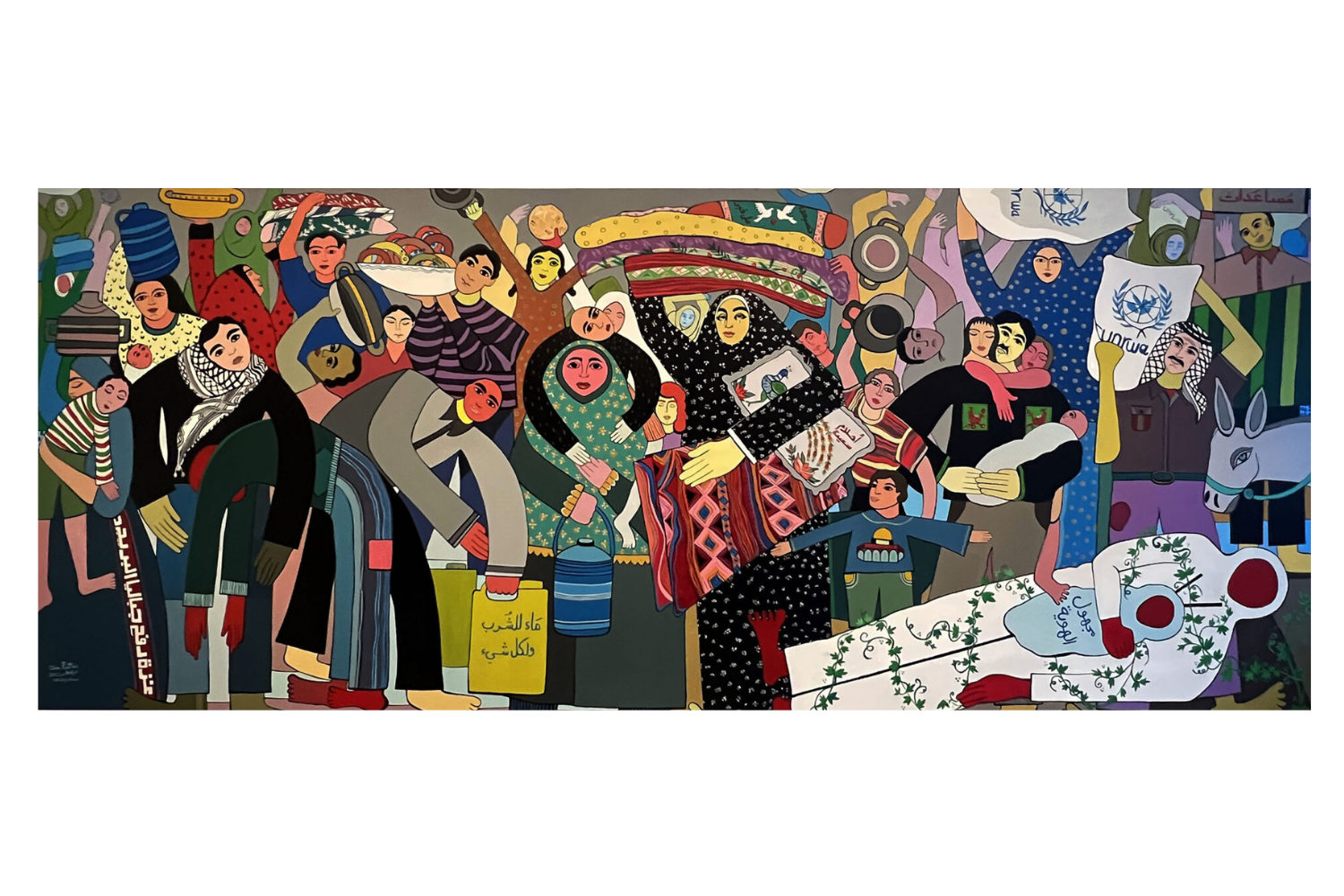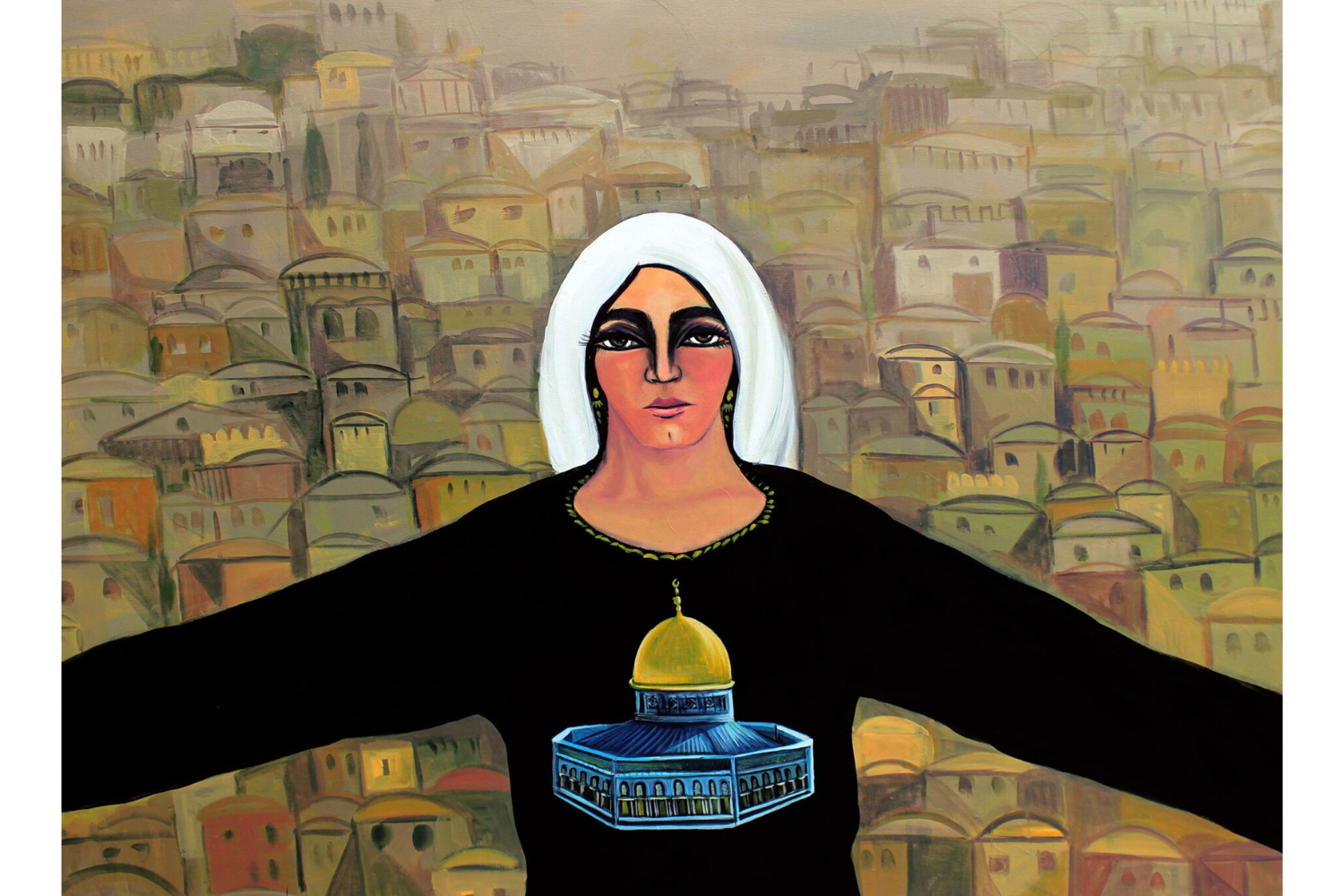 A voler riferire cosa si vede mentre la si attraversa, non saprei da dove cominciare, se dall’inizio o andare a ritroso, provando a parlare d’una materia che vibra, e se la si osserva attentamente essa risulta cangiante, incandescente di dettagli, sensibile agli spostamenti d’aria, accesa e inestinguibile. A volerla toccare questa materia di sicuro ci si ritroverà cambiate, perché la sua valenza resta a testimonianza di un’ostinazione che rimane orizzonte condiviso di tante lotte che s’intersecano, “bussola morale” e ora sinonimo di giustizia, perché, parafrasando il poeta Mahmoud Darwish, fino a che la Palestina non riscoprirà il suo nome tutti i pensieri (anche i nostri) verranno trasformati in pietre. Di che cosa è fatta allora questa materia ardente? Emerge, di primo impatto proprio sopravvivendo, riesumata dalle macerie, come le opere pittoriche di Dina Mattar e Mohammed Al-Hawajri, segnate dalle contingenze perché salvate dalla galleria gazawi Eltiqa Group for Contemporary Art. Fondata nel 2000 da un collettivo di artist3, la galleria è diventata nel tempo centro nevralgico della produzione artistica di diverse generazioni, ed è stata distrutta dall’esercito israeliano nel dicembre 2023. In mostra un video registra il momento del recupero, mentre si decide cosa sacrificare e cosa portarsi dietro, la materia motrice di una scena diventa allora traccia di una storia, vitale nel suo retaggio, essenziale nella sua urgenza, perché per i quadri è passata la loro ricerca formale soffermandosi sui loro ricordi, paesaggi emotivi e reali, lignaggi e provenienza, e contenendo paure e rabbia quando la vita mondana viene interrotta e violata. In questa materia, è la terra a raccontare se stessa, a reclamare la sua appartenenza nel linguaggio di chi ne parla, è la terra che s’attacca alla vita e diventa colore, tratto, pennellata, paesaggio, per rimanere fissata negli occhi di chi la guarda, affinché noi si resti vigili e veglie. Maryam (di Al-Hawajri) all’ingresso ci rimane impressa, e si susseguono tutte le immagini che in questi due anni ci hanno attraversato senza sosta, e che ritroviamo condensate nel grande dipinto/murales Our Burdens Are on Our Journey (2024-25) di Mattar, che dice «se la tela fosse stata più grande avrei continuato all’infinito». Forse se questa materia ci ha scottate abbastanza, con il suo spunto riusciamo anche a continuare noi.