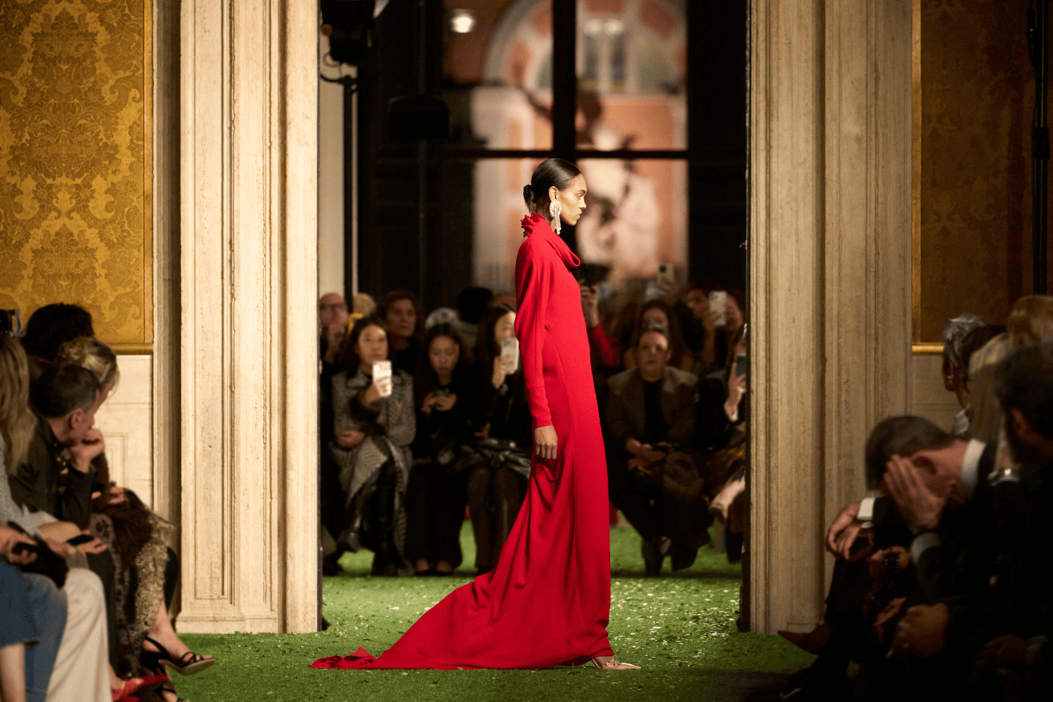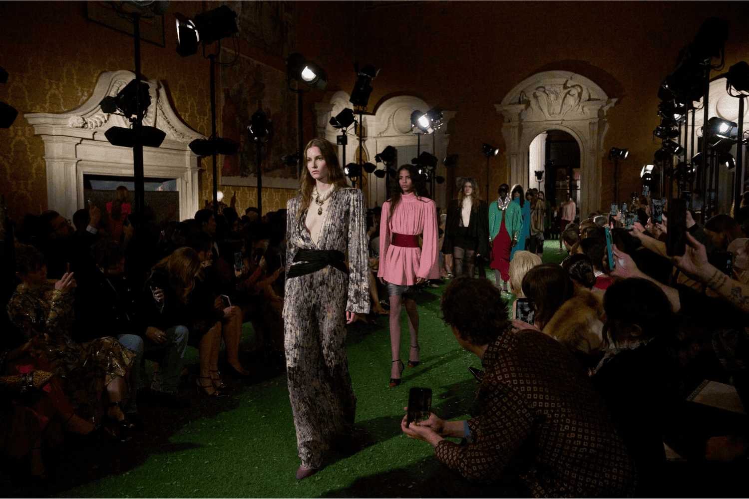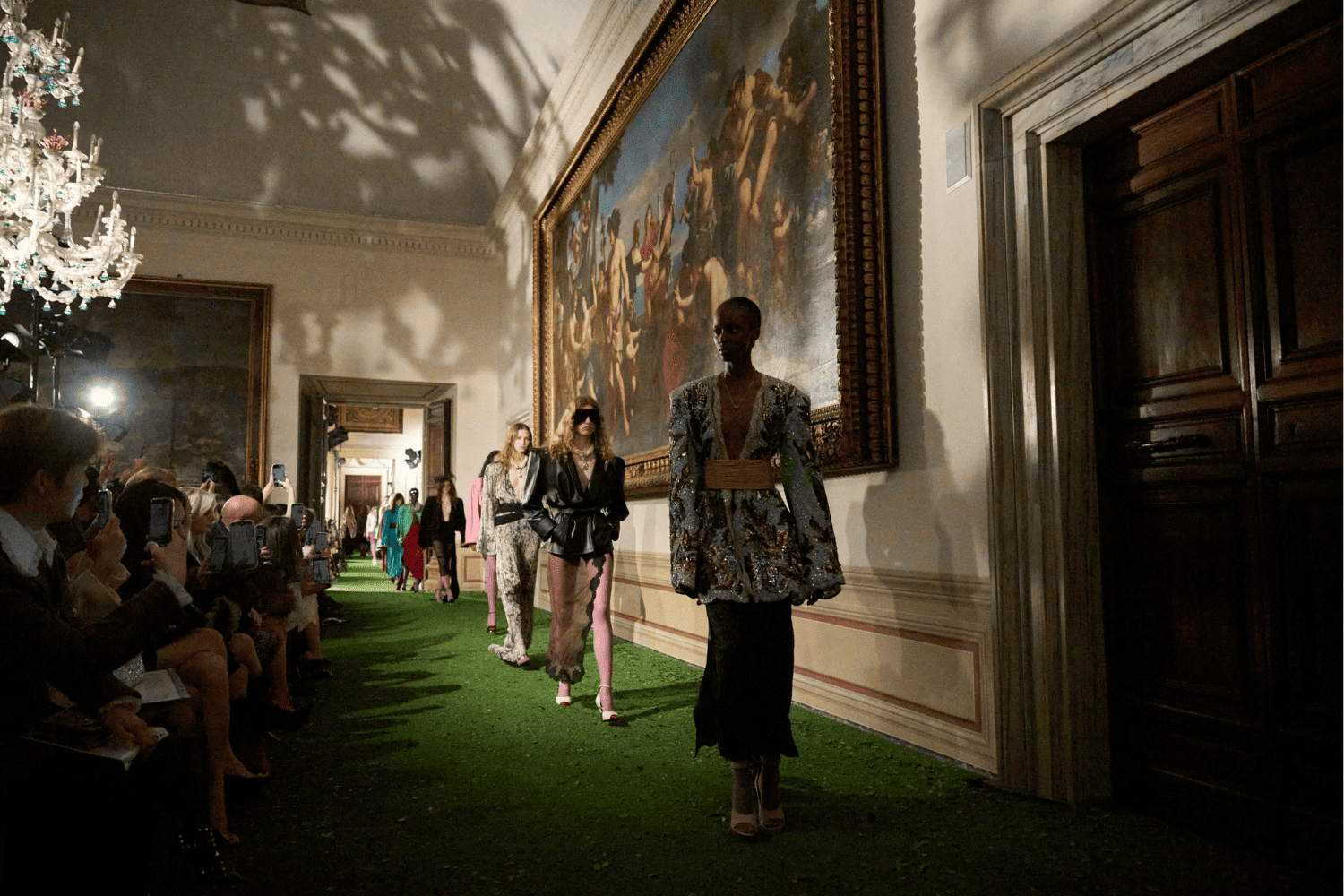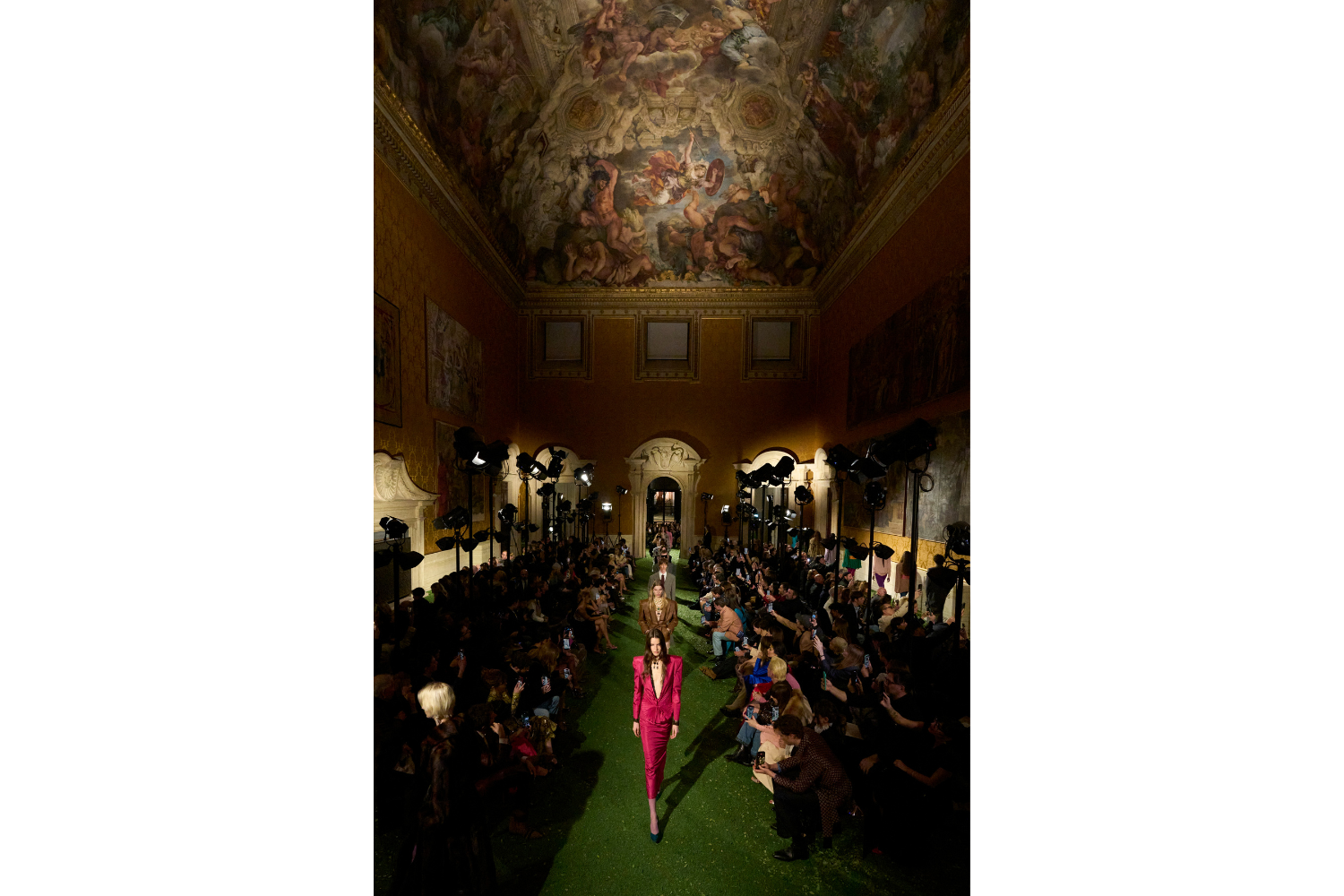 La sfilata non dura quindici minuti. È una macchina narrativa che si dispiega lungo un’intera giornata, trasformando il palazzo in un organismo vivo attraversato dagli abiti, dai corpi, dagli sguardi. Il pubblico non assiste semplicemente a uno show: entra dentro un campo estetico.