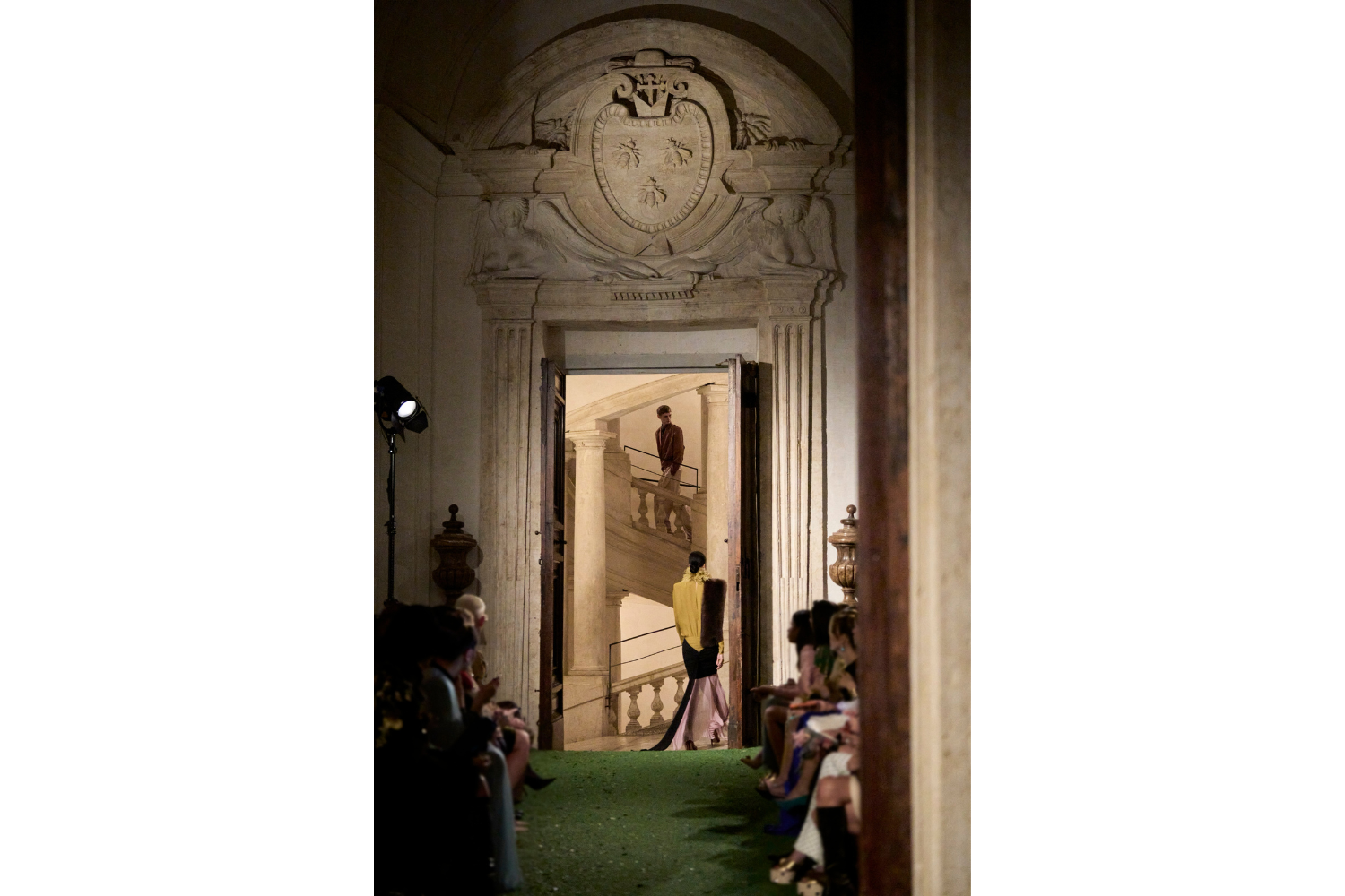 Salire e scendere le celebri scale a torciglione del palazzo significa entrare in una spirale temporale dove il passato non è nostalgia ma materia attiva. La sfilata diventa così una sorta di vortice visivo e progettuale: una macchina di immagini che attraversa il Barocco, il Novecento romano, la couture, il teatro, la cultura queer, fino a produrre una nuova superficie estetica dove tutto convive senza gerarchie.