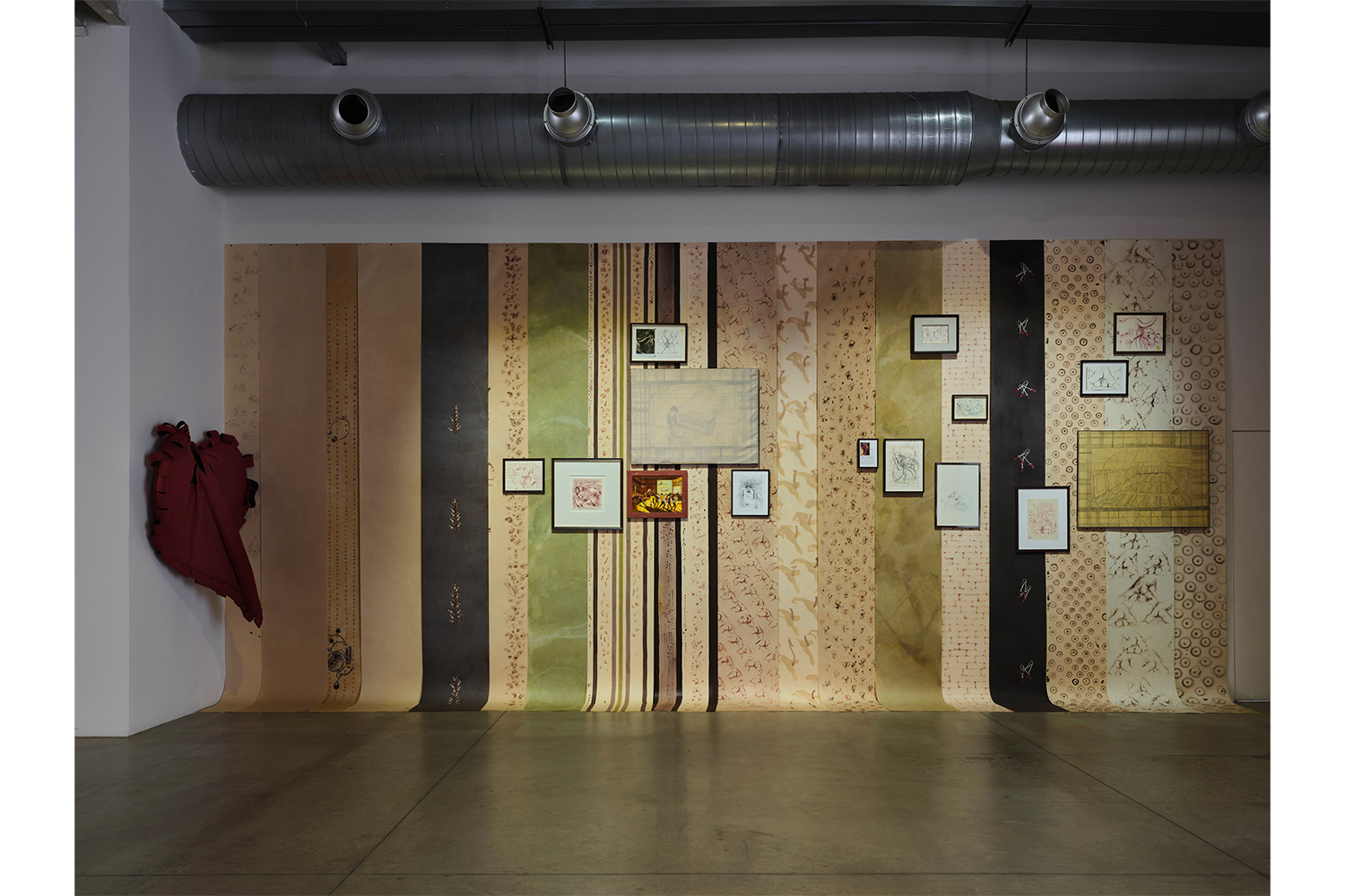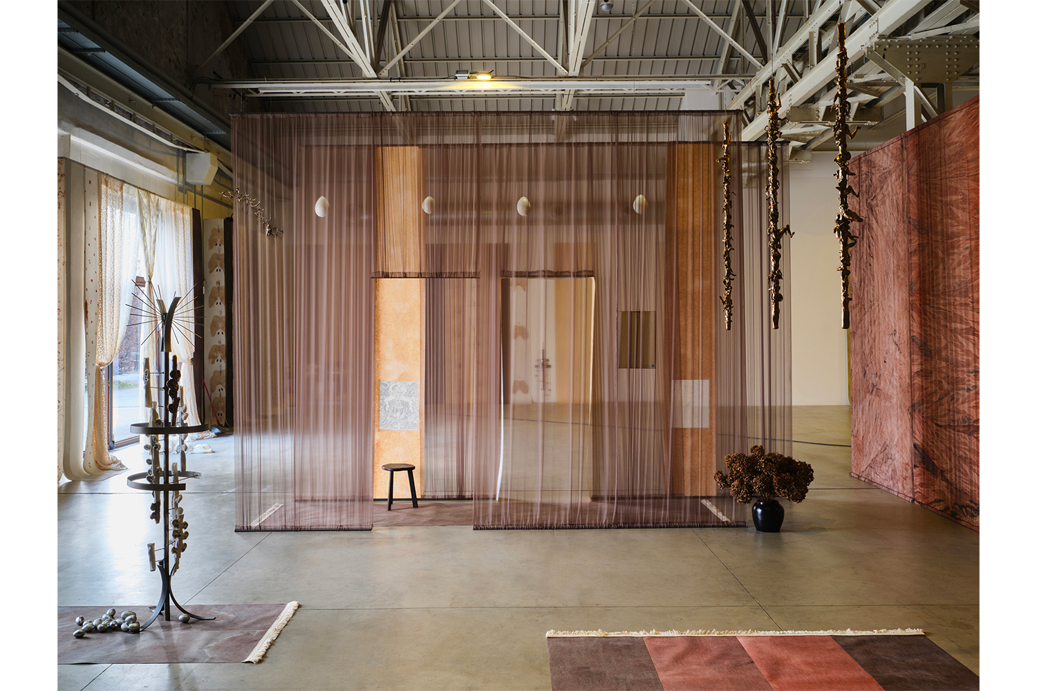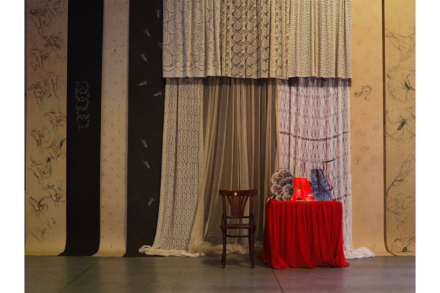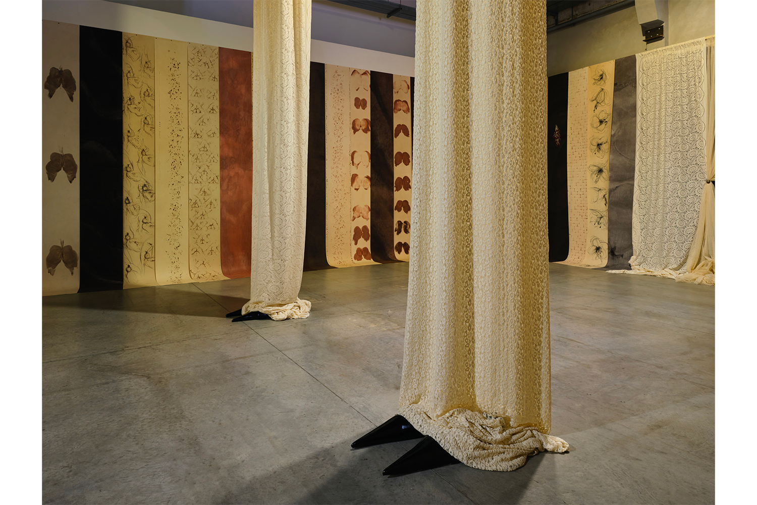 L’allestimento mantiene un ritmo costante, quasi respiratorio. Tessuti, superfici, figure costruiscono un ambiente coerente, dove elementi diversi convivono senza attrito. Le forme trattengono la memoria di un gesto, la traccia di un contatto, ma questa memoria non si traduce in tensione. L’opacità, reiterata, finisce per stabilizzarsi come qualità generale, più che aprire a una reale ambiguità. Nel momento performativo di Tango (II version) (2026) si introduce temporaneamente una dinamica diversa. Il tango implica per sua natura una grammatica del desiderio fatto di distanza, peso, torsione, esitazione: ogni passo nasce da una negoziazione tra guida e resistenza. I danzatori attraversano lo spazio come figure liminali, trasformando per un attimo l’installazione in una milonga. E tuttavia questa attivazione non modifica la struttura dell’esperienza.