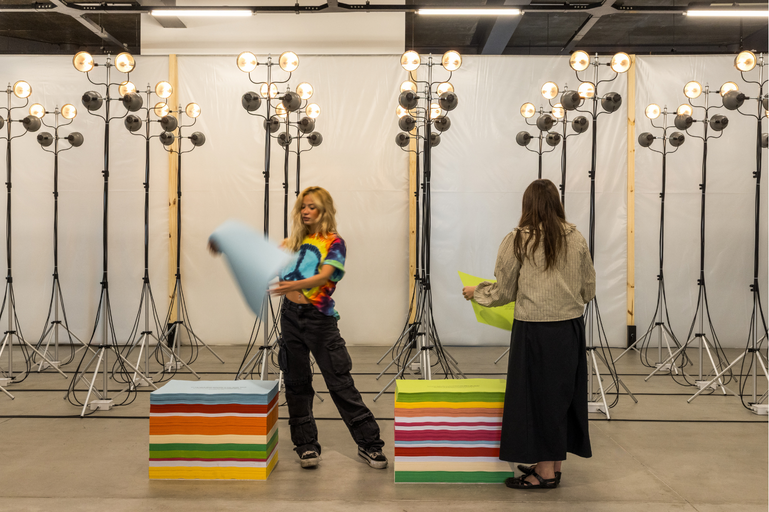 Finalmente arrivo a destinazione e mi ritrovo di fronte a un rettangolo di luce. Osservo una figura elegante e composta, apparentemente immobile, che riempie la metà superiore dello spazio espositivo. Si tratta di un lampadario costituito da tubi al LED, esposto per la prima volta da Alberto nel 2015 a Palazzo Cusani a Milano. Temporali, nonostante possa sembrare un oggetto di design fine a sé stesso (un semplice lampadario che compie la sua funzione di illuminare), è un’opera viva, che muta — e le sue vibrazioni, per essere notate, devono essere attese.
