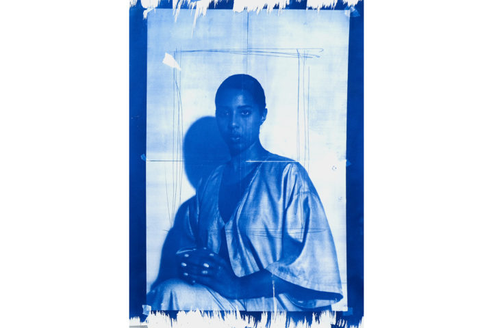 Nel progetto A VENDRE (2023), la nozione di spazio pubblico in un contesto post-coloniale viene esplorata attraverso l’ambivalenza dell’architettura sia come simbolo di progresso che come strumento di oppressione. La serie, combinando autoritratti e soggetti architettonici mediante l’utilizzo della tecnica del cianotipo, che richiama l’iconografia degli archivi storici, esamina figure come Le Corbusier e Mies van der Rohe, evidenziando come l’ambivalenza di modelli ideologici oppressivi abbia influenzato la progettazione di edifici nel continente africano. Il progetto si amplia con una performance video in cui un personaggio, disteso su un cantiere, legge alcuni estratti da Verso una nuova architettura di Le Corbusier. Il personaggio incarna un archivio vivente, progressivamente sepolto da un muratore che, al termine, posiziona un cartellone con la scritta “A VENDRE” (In vendita).